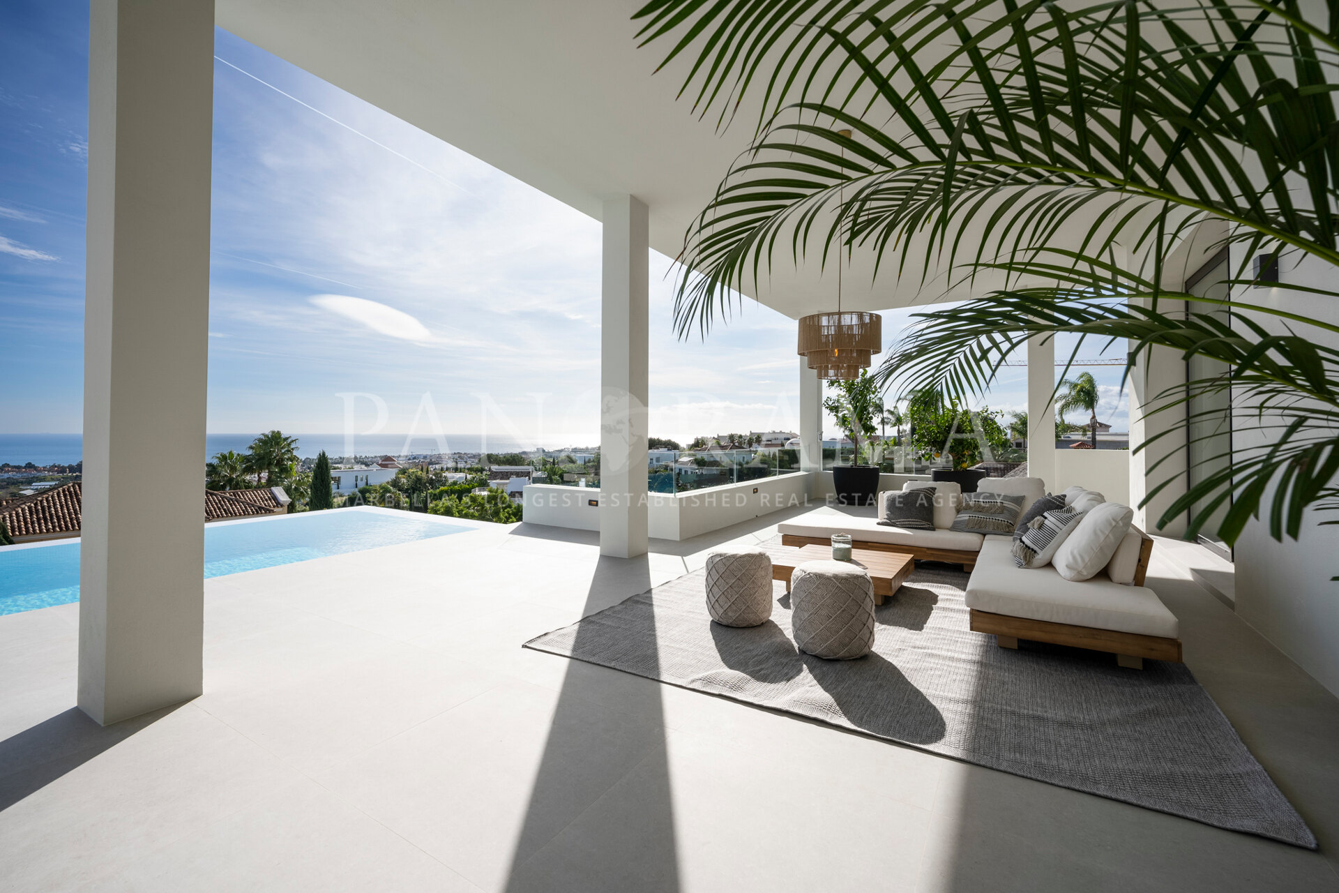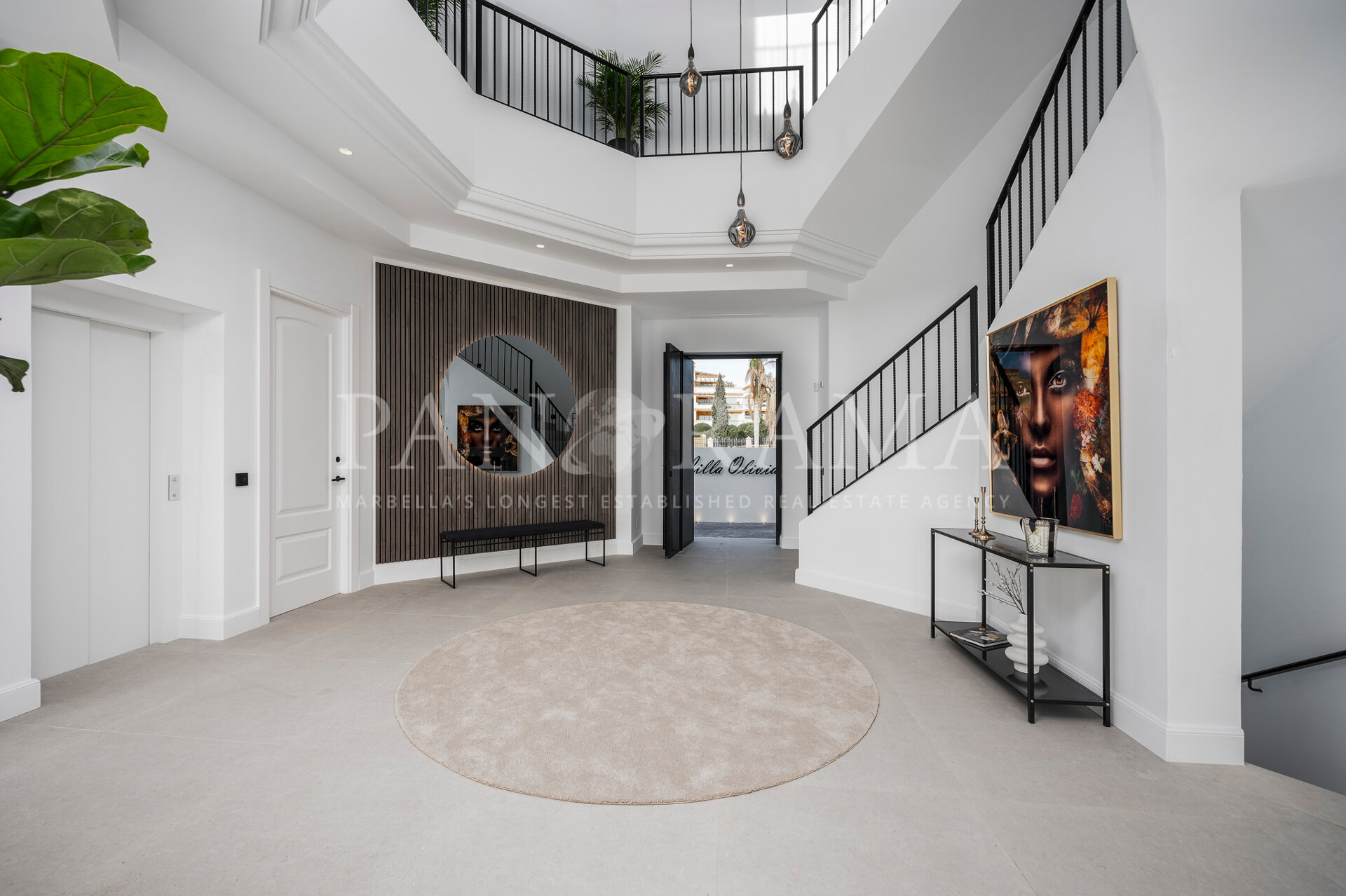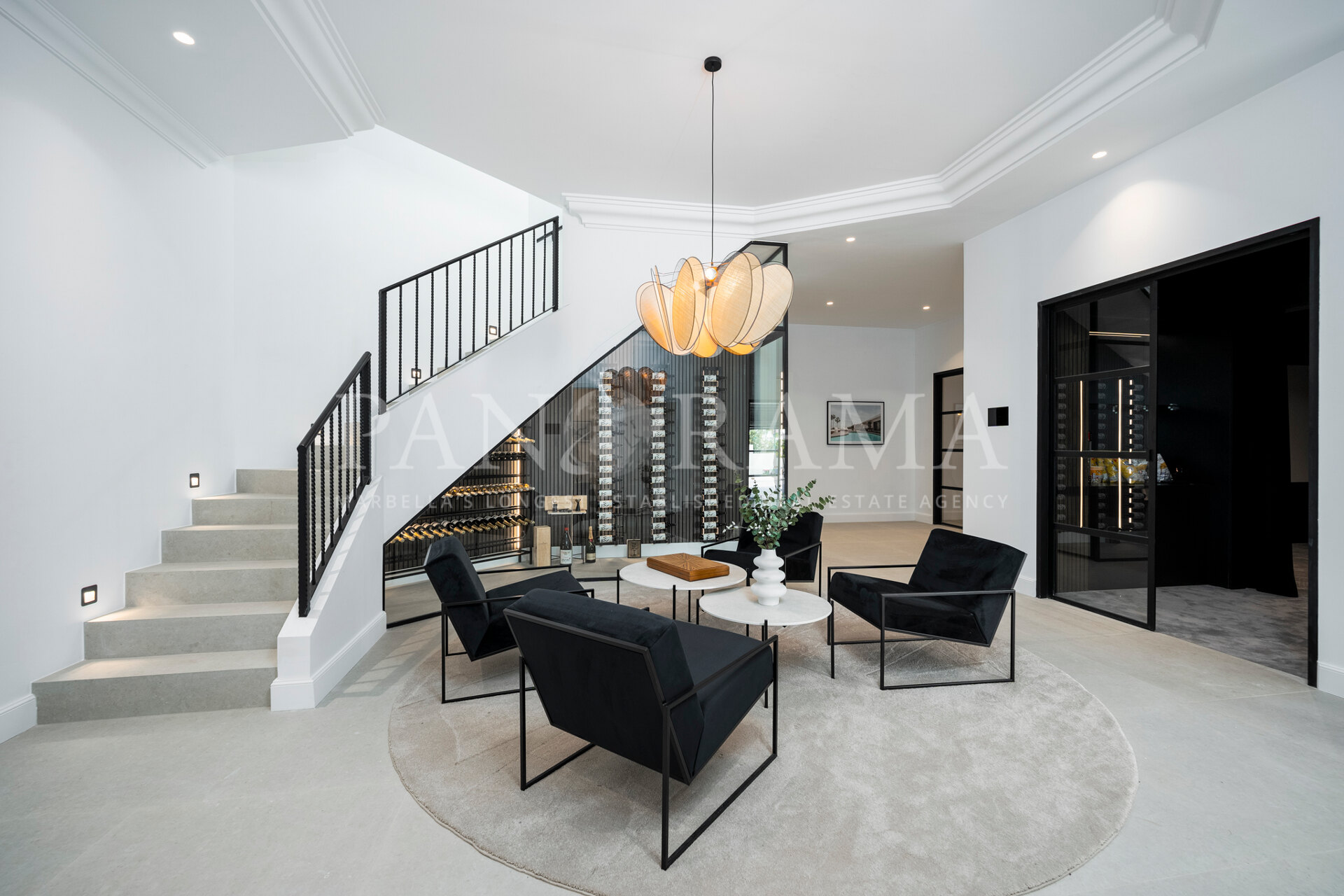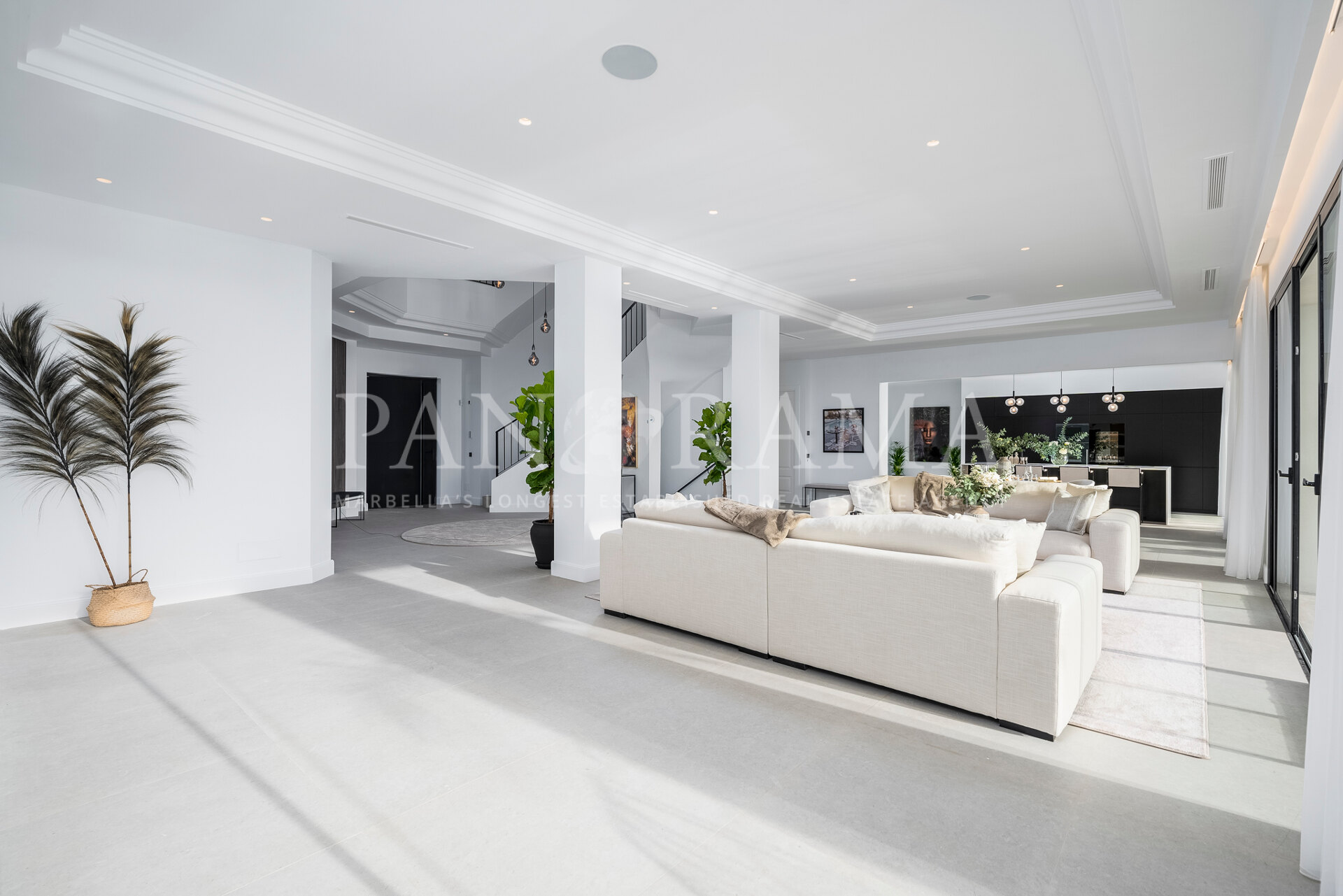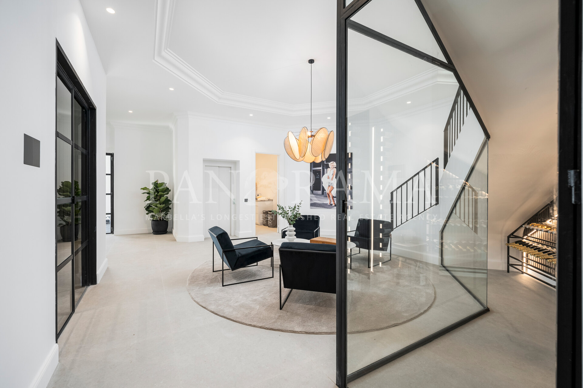 Schon beim Betreten des großen Eingangsbereichs werden Sie von einer Atmosphäre der Raffinesse und Pracht empfangen. Der Mittelpunkt der Eingangshalle ist eine imposante, elegant geschwungene Treppe, die mit einem dramatischen hängenden Lichtobjekt geschmückt ist und sofort Aufmerksamkeit erregt. Wenn Ihr Blick wandert, werden Sie von den atemberaubenden Ausblicken auf das Mittelmeer angezogen, die einen wirklich spektakulären ersten Eindruck hinterlassen und den Ton für den Rest des Hauses setzen.