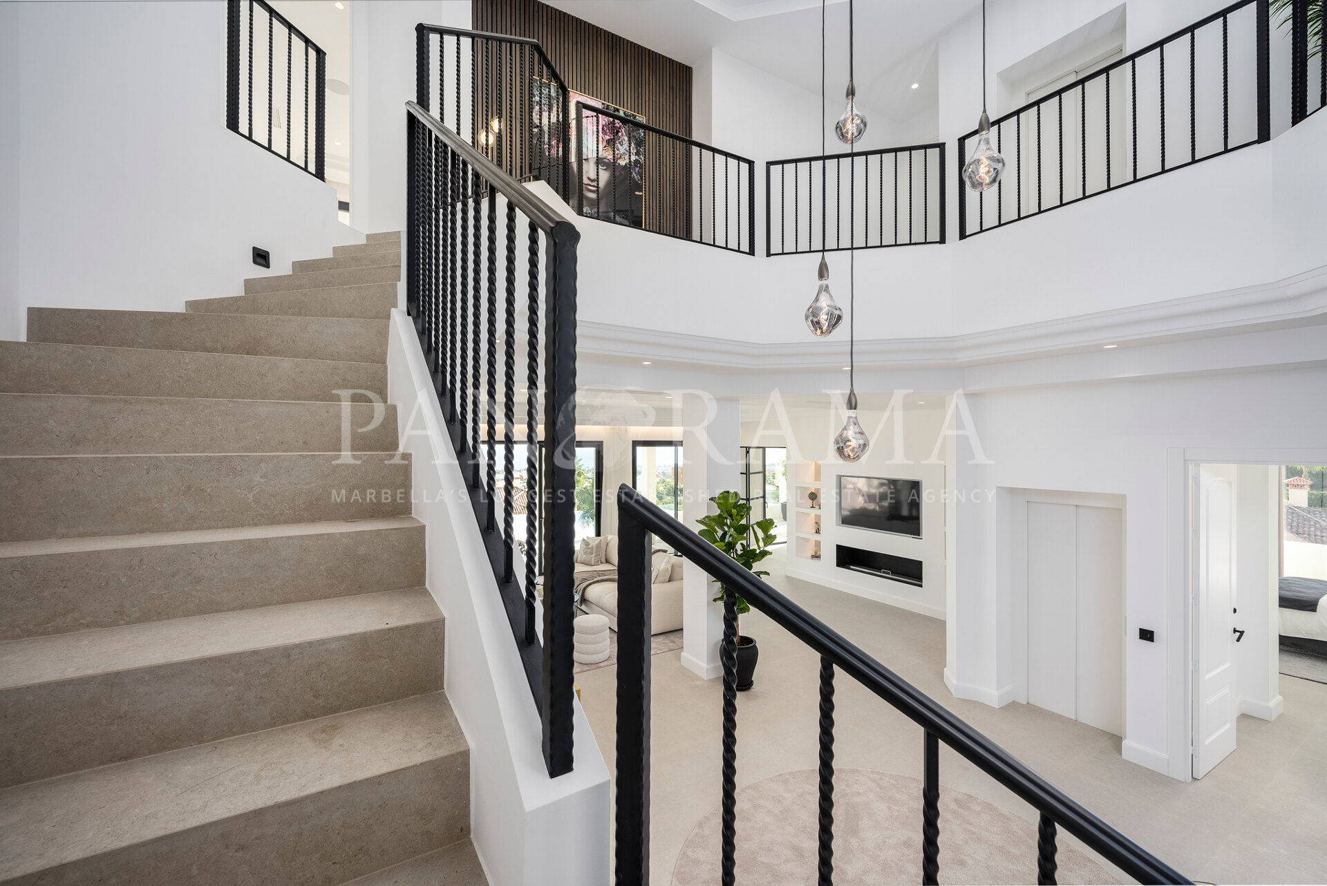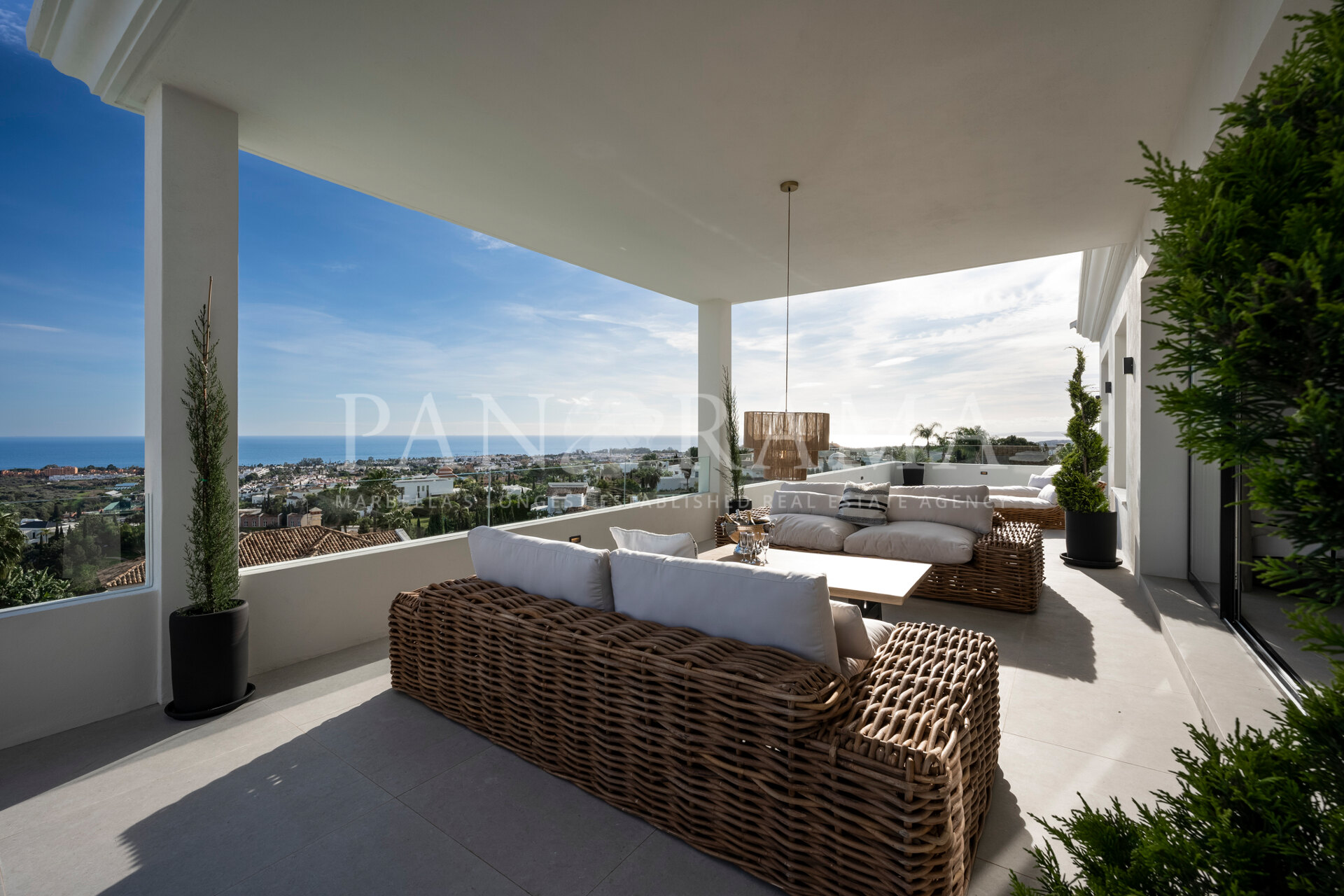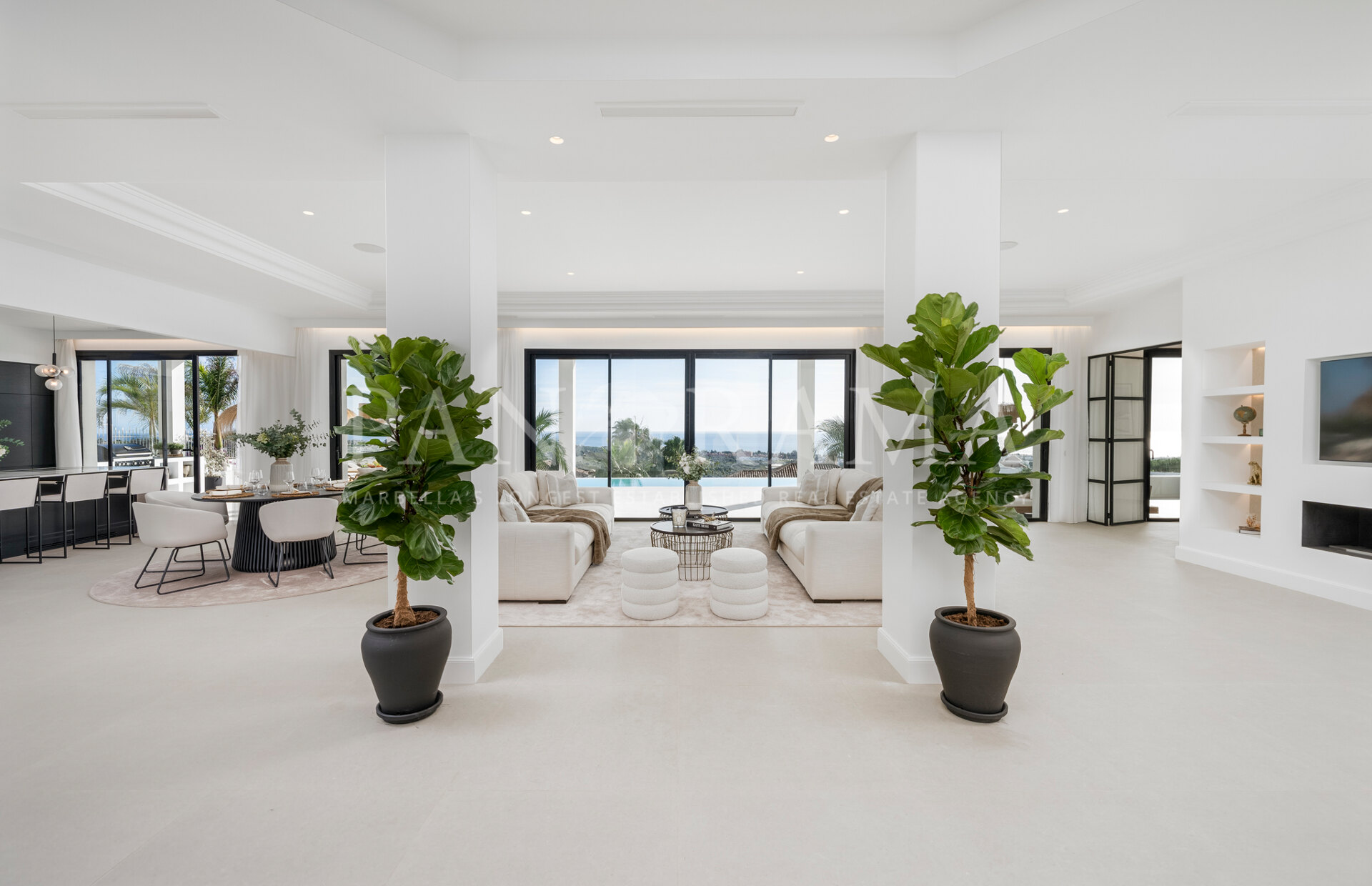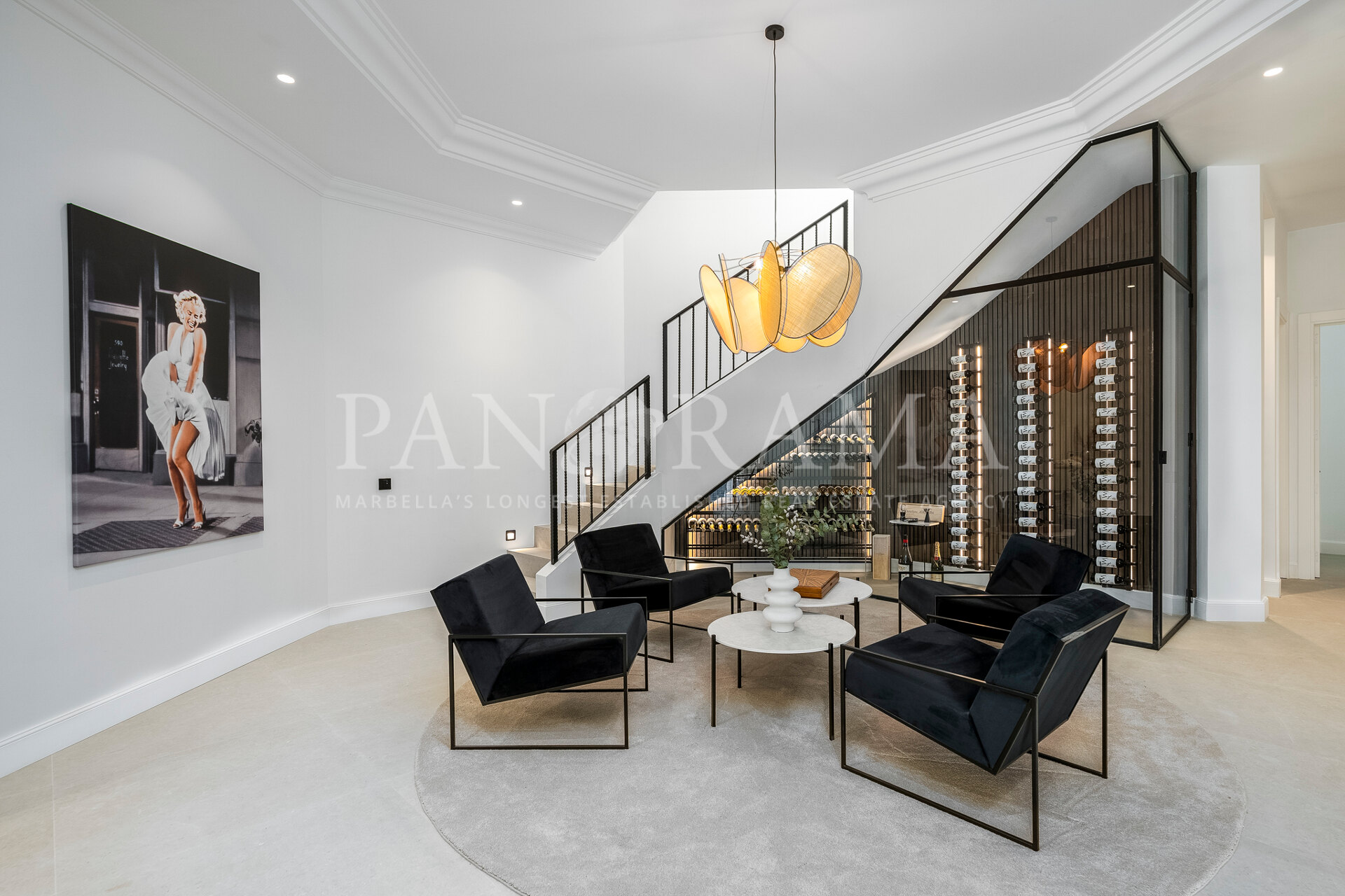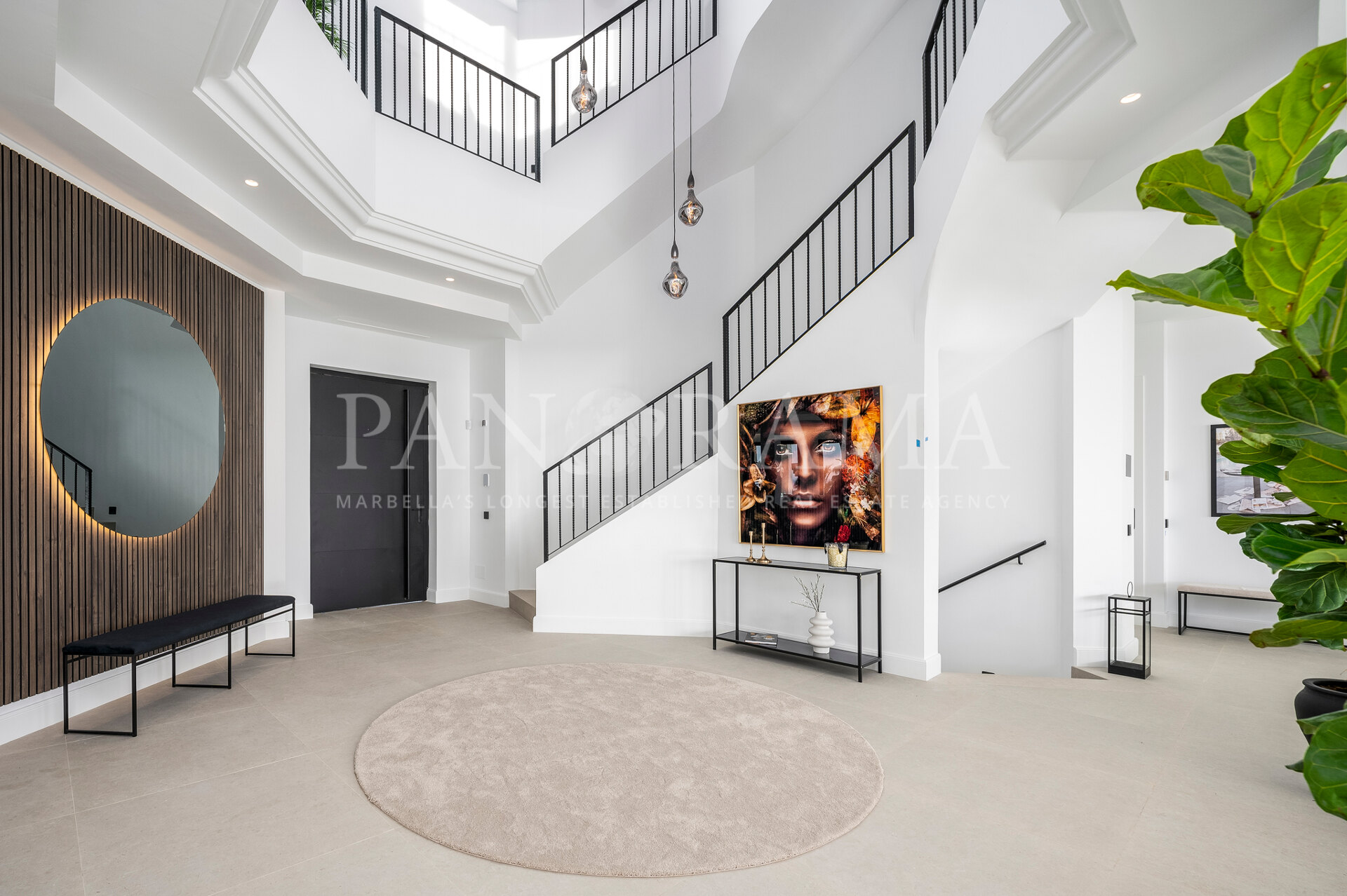 Schon beim Betreten des großen Eingangsbereichs werden Sie von einer Atmosphäre der Raffinesse und Pracht empfangen. Der Mittelpunkt der Eingangshalle ist eine imposante, elegant geschwungene Treppe, die mit einem dramatischen hängenden Lichtobjekt geschmückt ist und sofort Aufmerksamkeit erregt. Wenn Ihr Blick wandert, werden Sie von den atemberaubenden Ausblicken auf das Mittelmeer angezogen, die einen wirklich spektakulären ersten Eindruck hinterlassen und den Ton für den Rest des Hauses setzen.