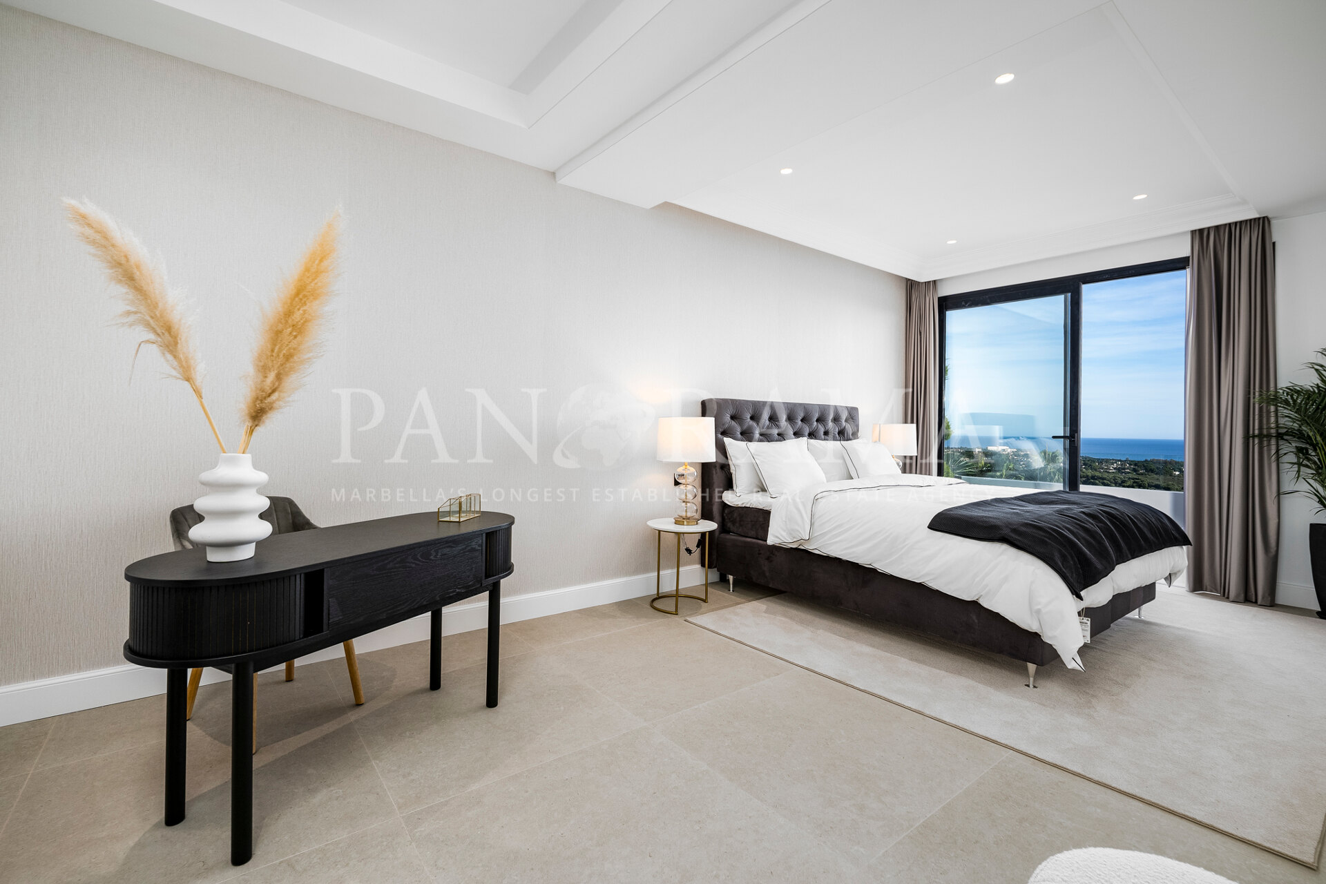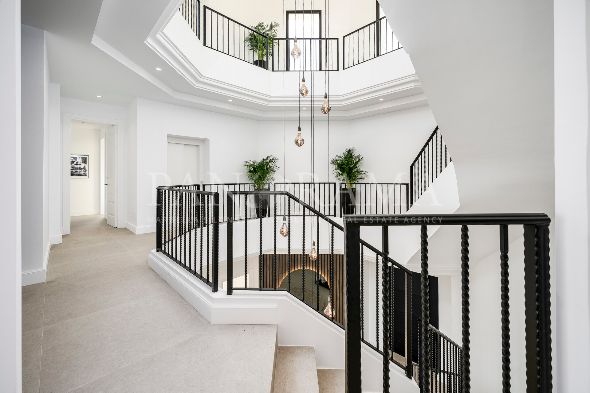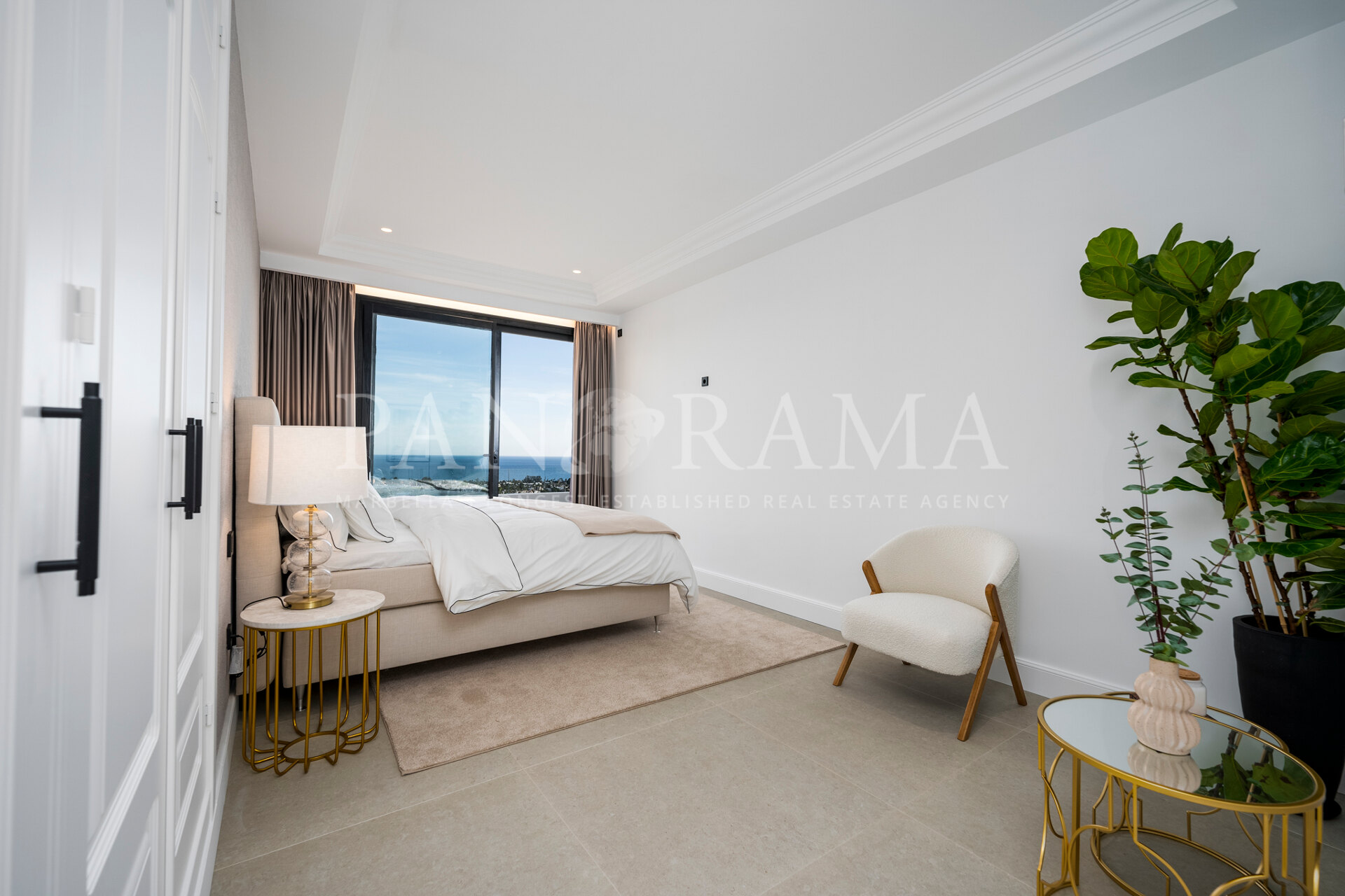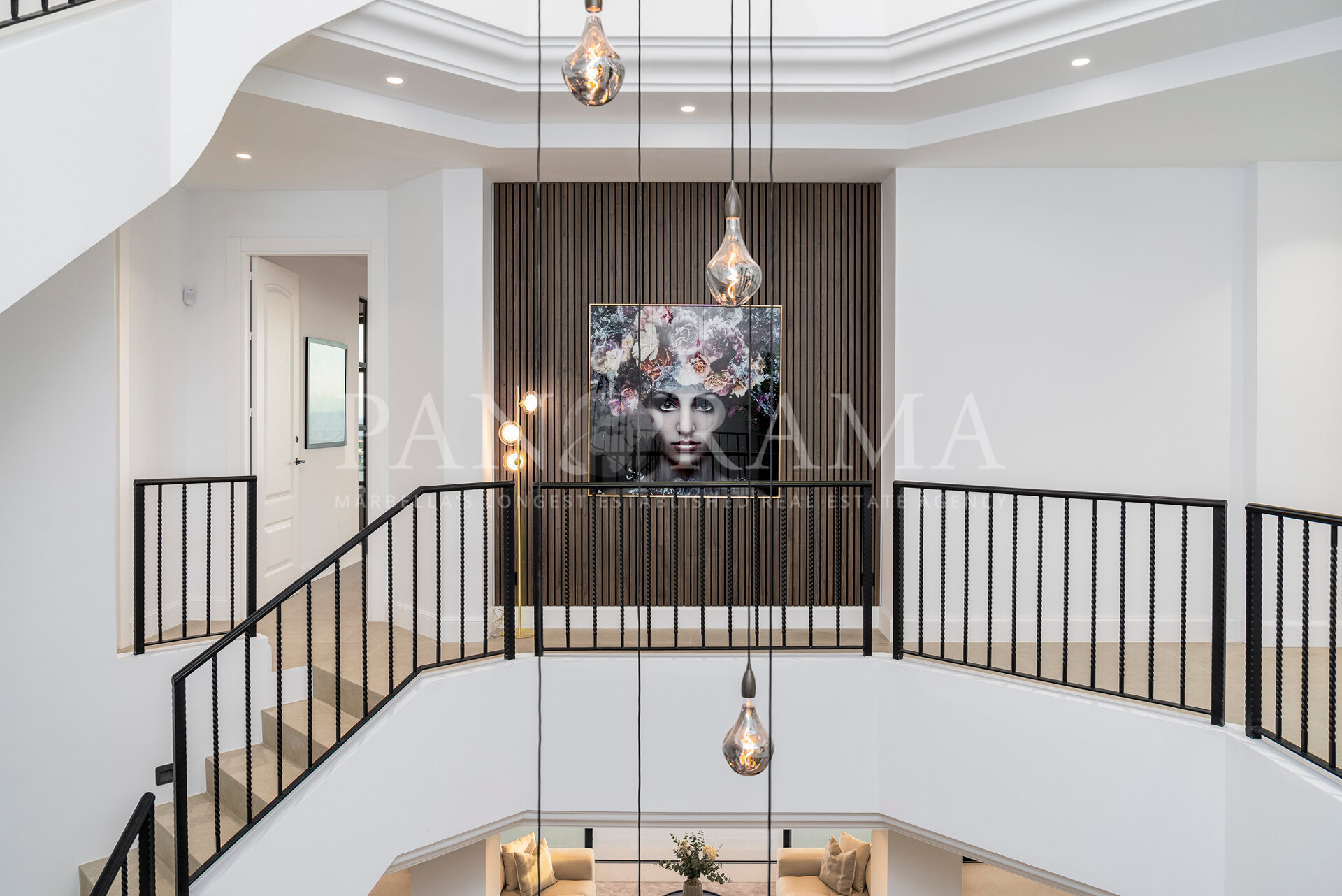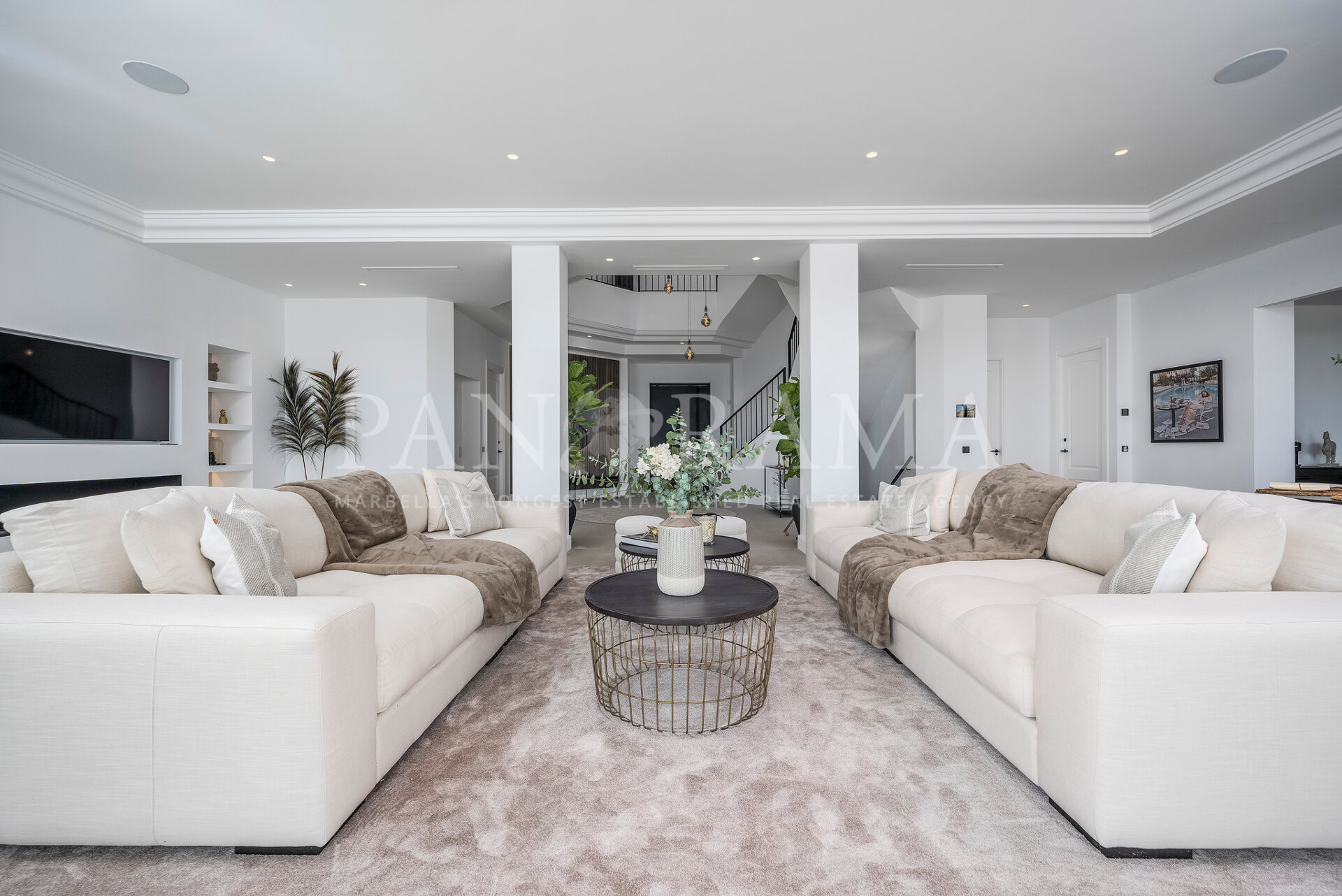 Schon beim Betreten des großen Eingangsbereichs werden Sie von einer Atmosphäre der Raffinesse und Pracht empfangen. Der Mittelpunkt der Eingangshalle ist eine imposante, elegant geschwungene Treppe, die mit einem dramatischen hängenden Lichtobjekt geschmückt ist und sofort Aufmerksamkeit erregt. Wenn Ihr Blick wandert, werden Sie von den atemberaubenden Ausblicken auf das Mittelmeer angezogen, die einen wirklich spektakulären ersten Eindruck hinterlassen und den Ton für den Rest des Hauses setzen.