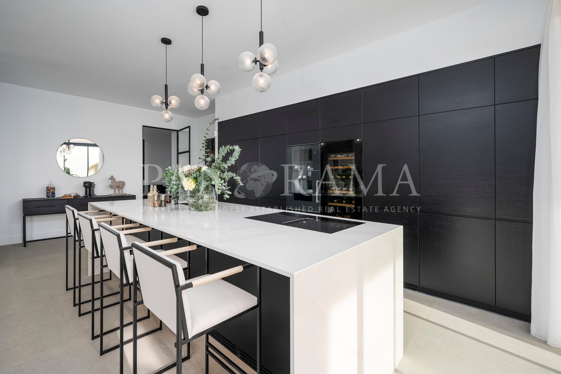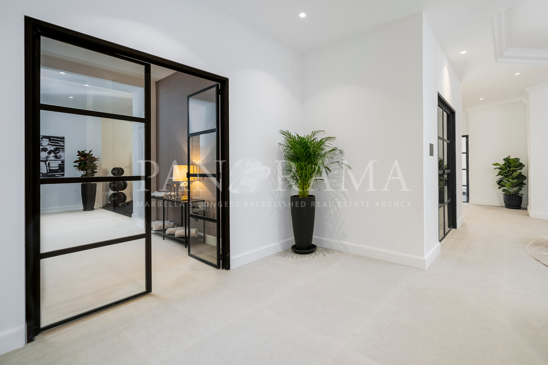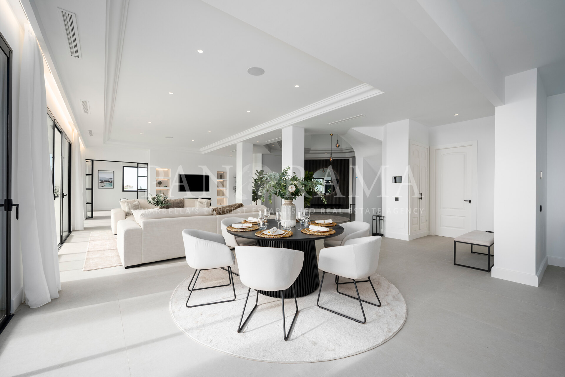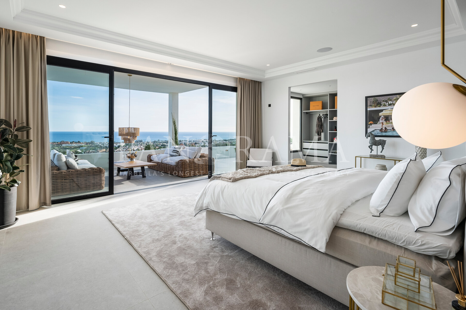Schon beim Betreten des großen Eingangsbereichs werden Sie von einer Atmosphäre der Raffinesse und Pracht empfangen. Der Mittelpunkt der Eingangshalle ist eine imposante, elegant geschwungene Treppe, die mit einem dramatischen hängenden Lichtobjekt geschmückt ist und sofort Aufmerksamkeit erregt. Wenn Ihr Blick wandert, werden Sie von den atemberaubenden Ausblicken auf das Mittelmeer angezogen, die einen wirklich spektakulären ersten Eindruck hinterlassen und den Ton für den Rest des Hauses setzen.