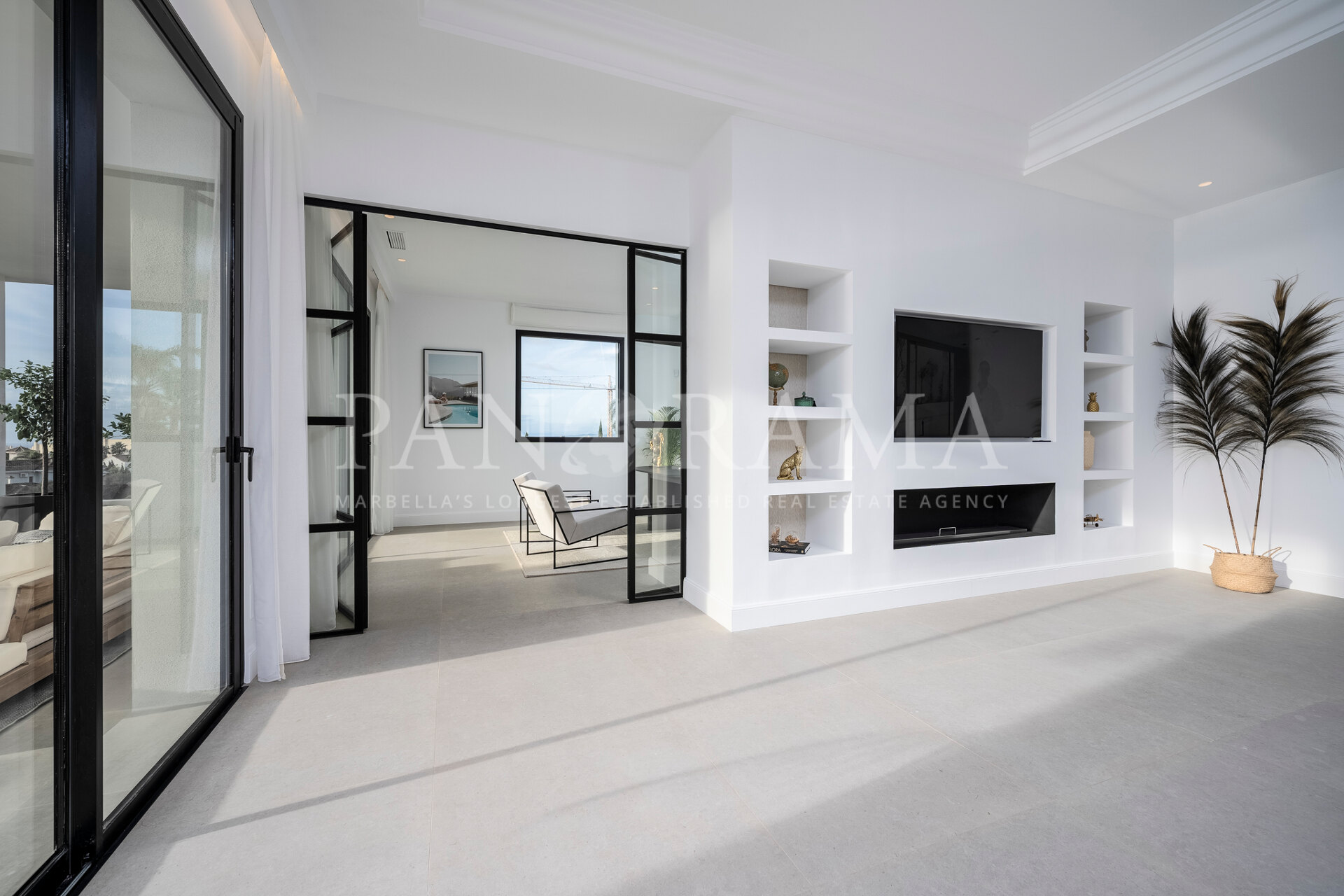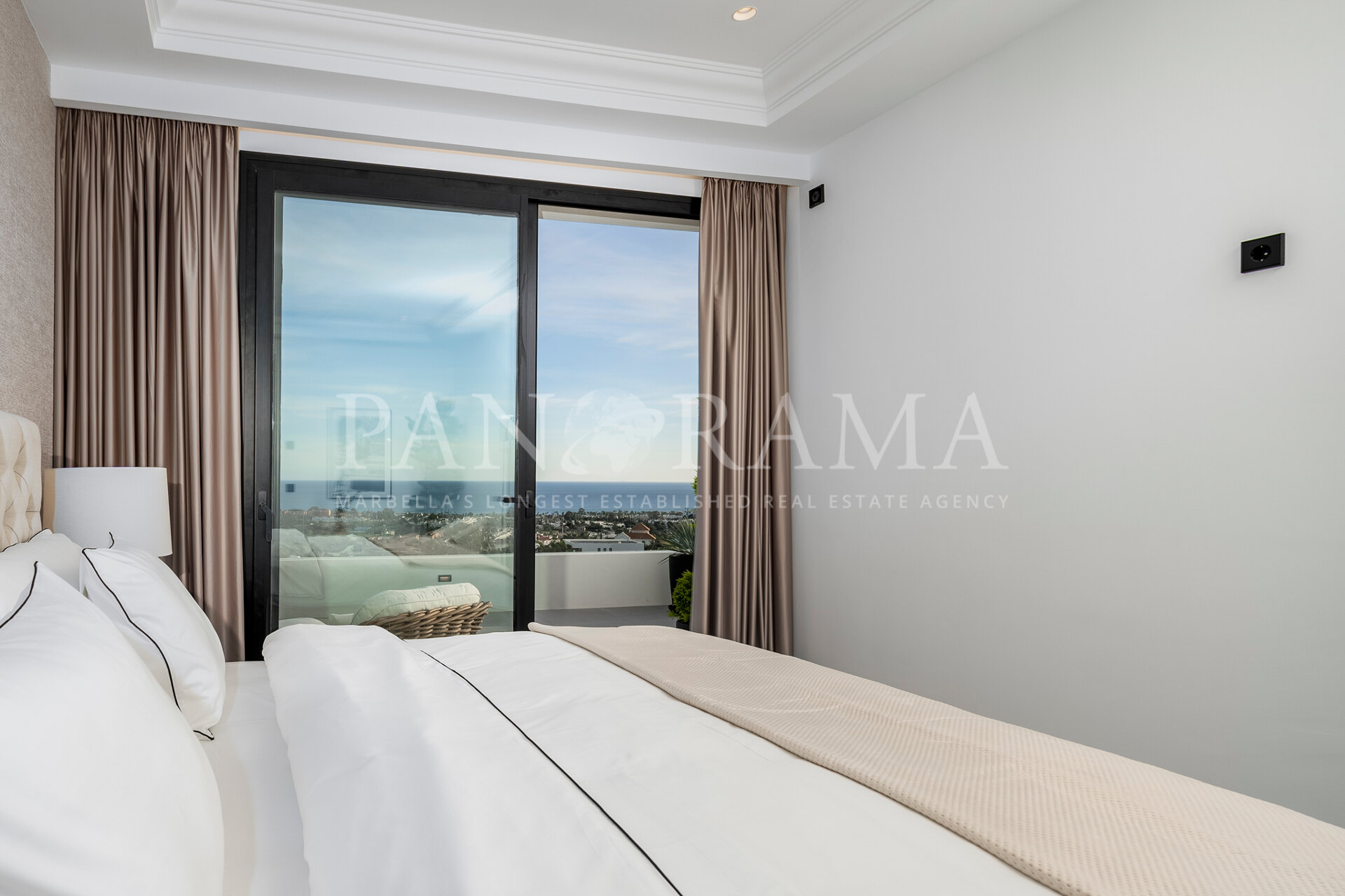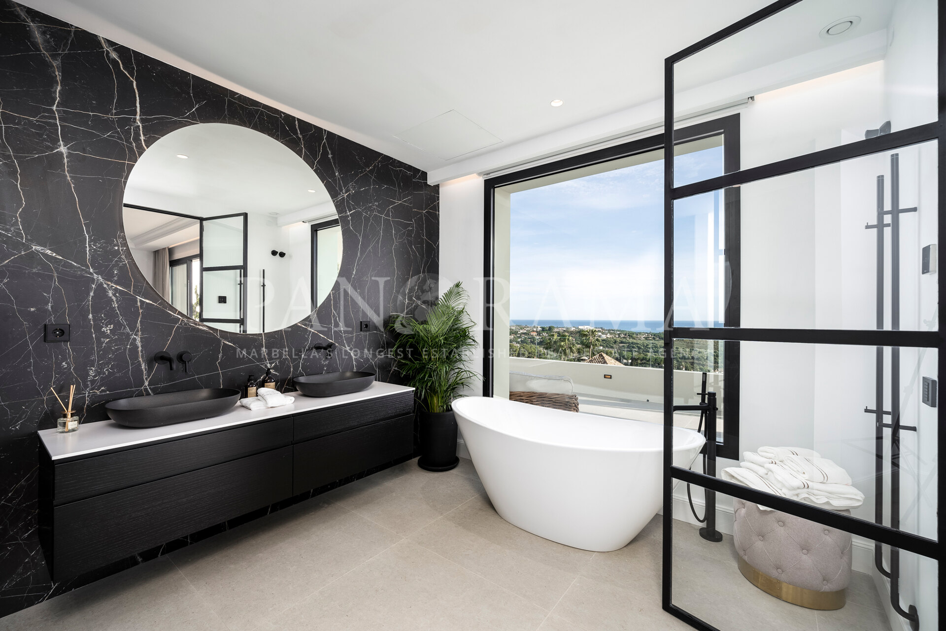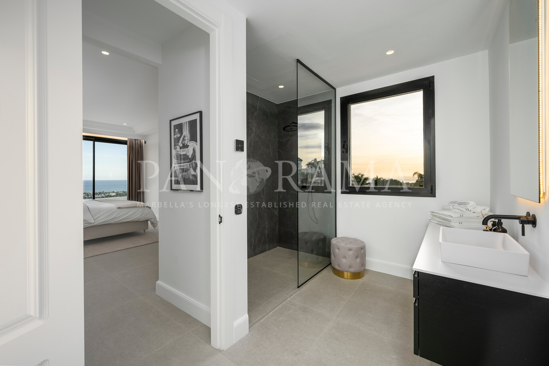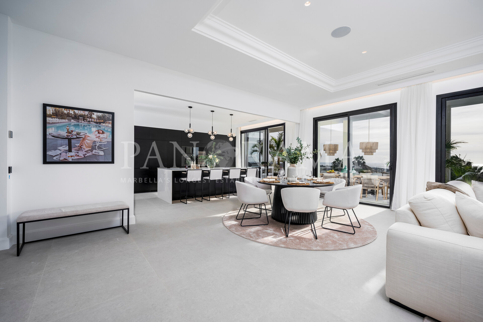 Schon beim Betreten des großen Eingangsbereichs werden Sie von einer Atmosphäre der Raffinesse und Pracht empfangen. Der Mittelpunkt der Eingangshalle ist eine imposante, elegant geschwungene Treppe, die mit einem dramatischen hängenden Lichtobjekt geschmückt ist und sofort Aufmerksamkeit erregt. Wenn Ihr Blick wandert, werden Sie von den atemberaubenden Ausblicken auf das Mittelmeer angezogen, die einen wirklich spektakulären ersten Eindruck hinterlassen und den Ton für den Rest des Hauses setzen.
