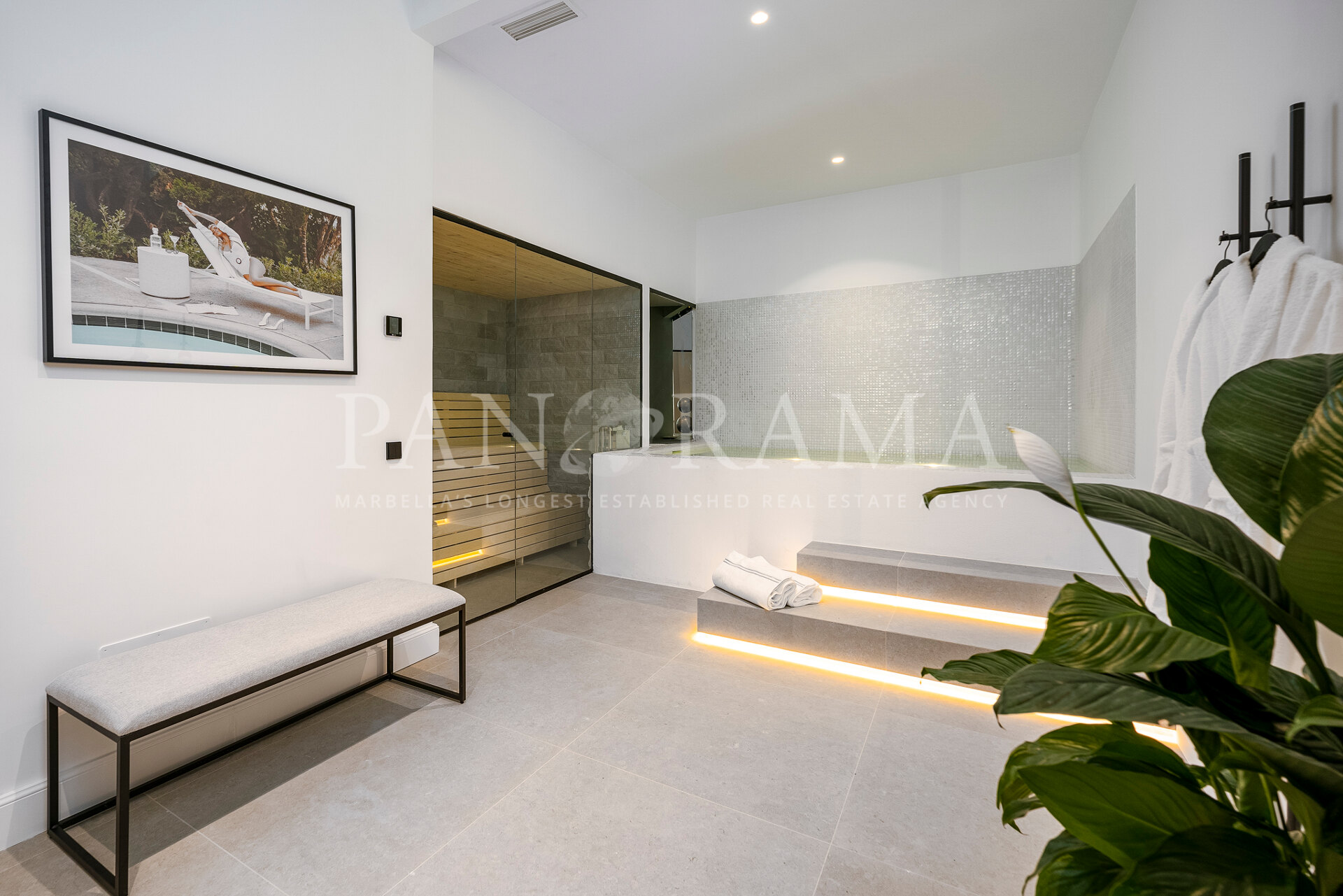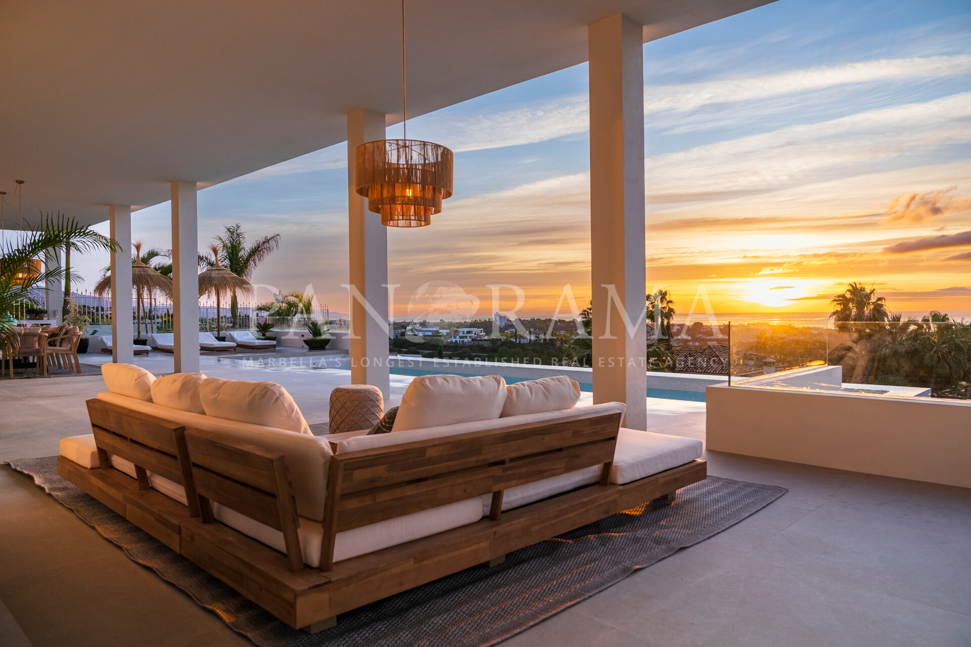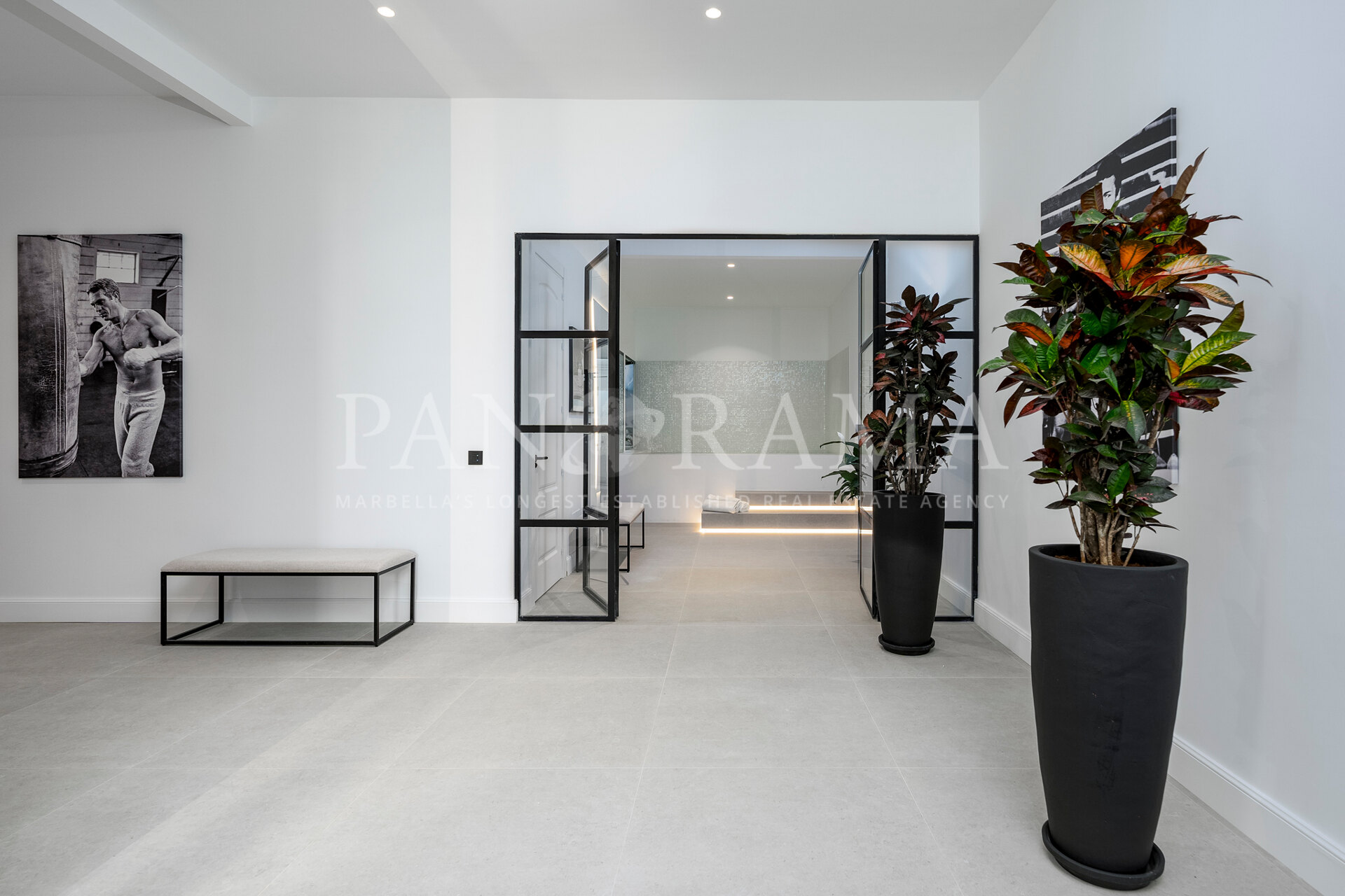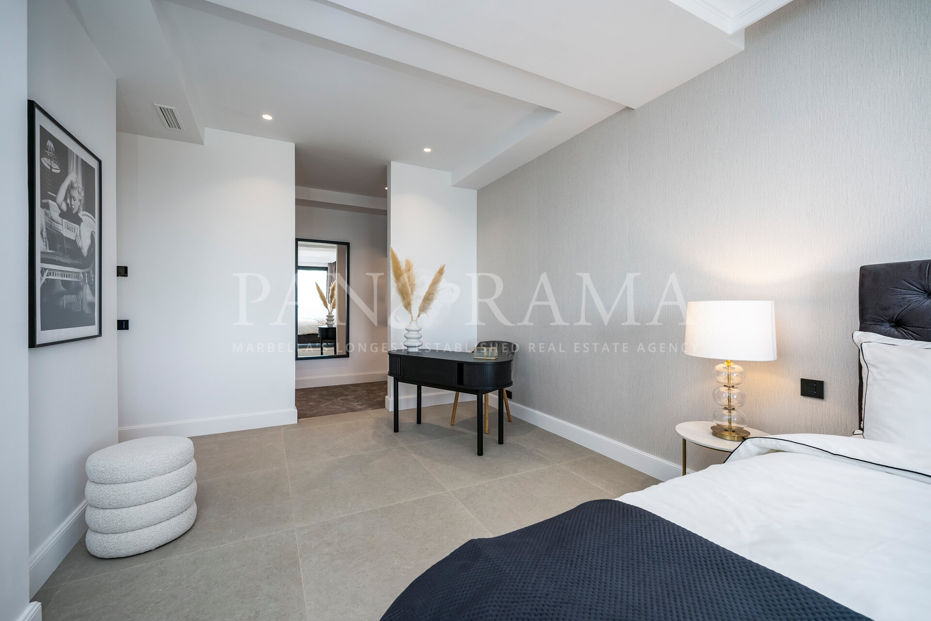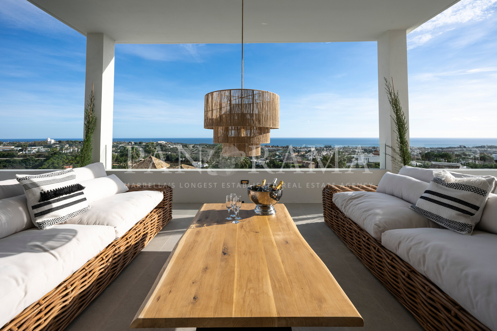 Schon beim Betreten des großen Eingangsbereichs werden Sie von einer Atmosphäre der Raffinesse und Pracht empfangen. Der Mittelpunkt der Eingangshalle ist eine imposante, elegant geschwungene Treppe, die mit einem dramatischen hängenden Lichtobjekt geschmückt ist und sofort Aufmerksamkeit erregt. Wenn Ihr Blick wandert, werden Sie von den atemberaubenden Ausblicken auf das Mittelmeer angezogen, die einen wirklich spektakulären ersten Eindruck hinterlassen und den Ton für den Rest des Hauses setzen.