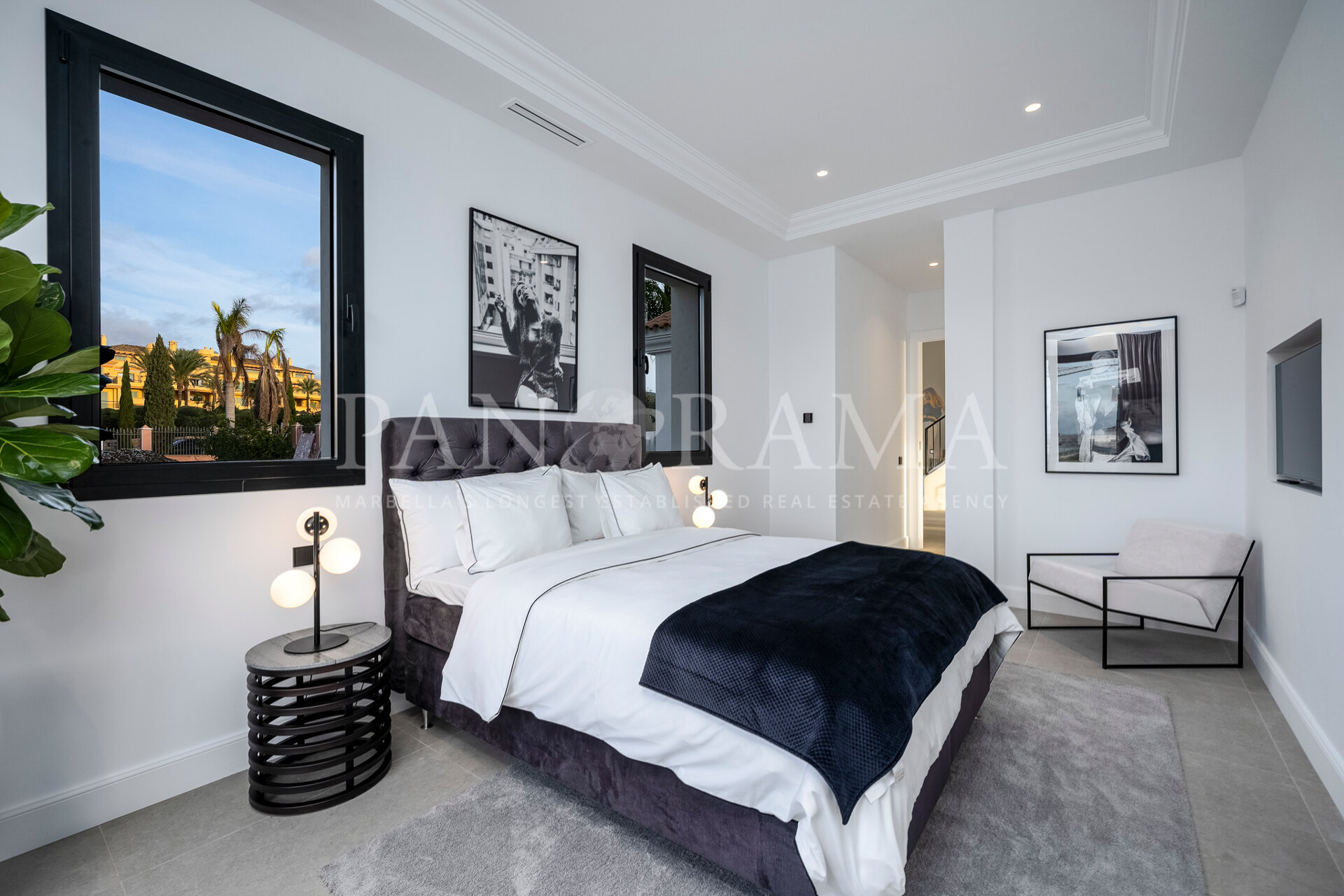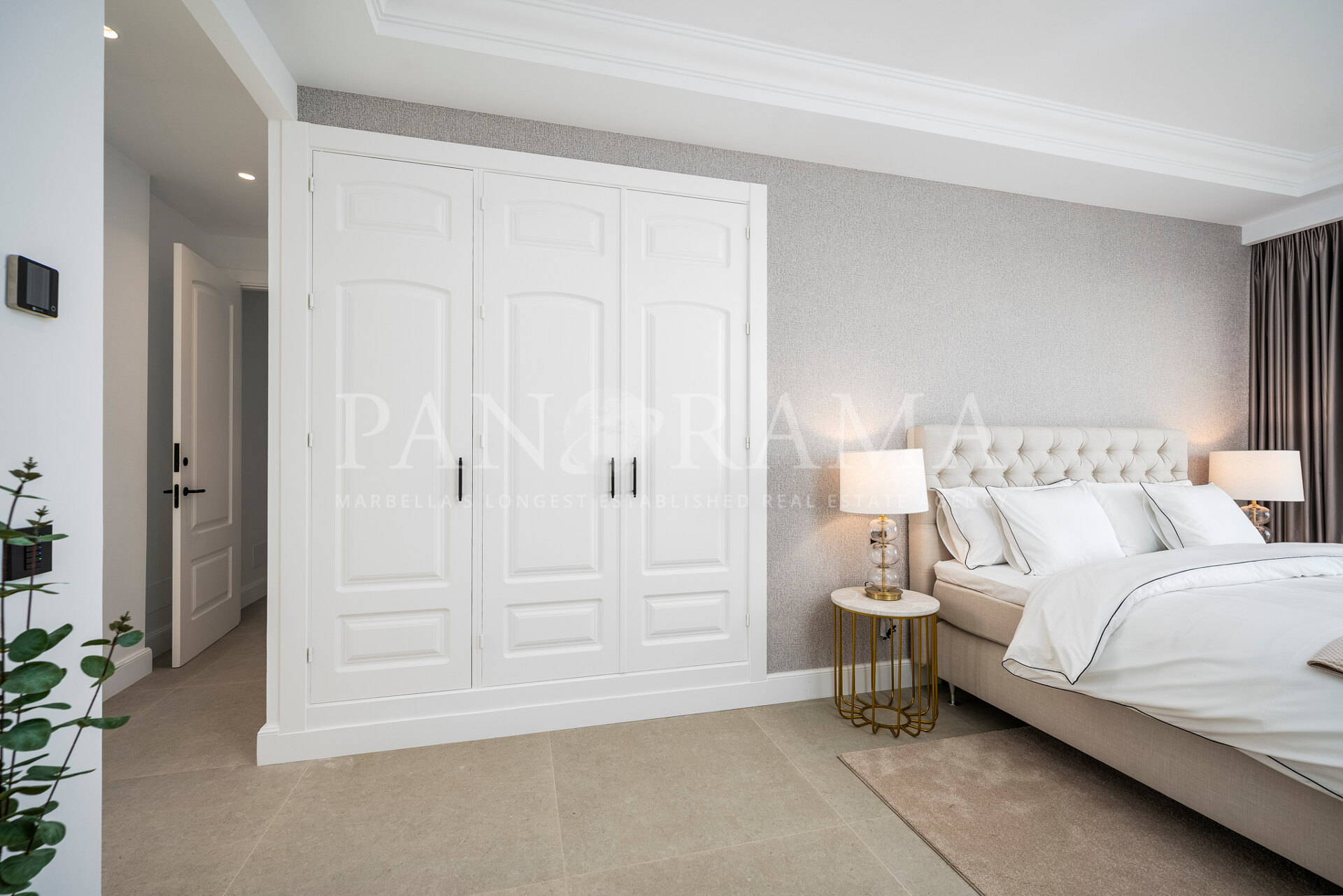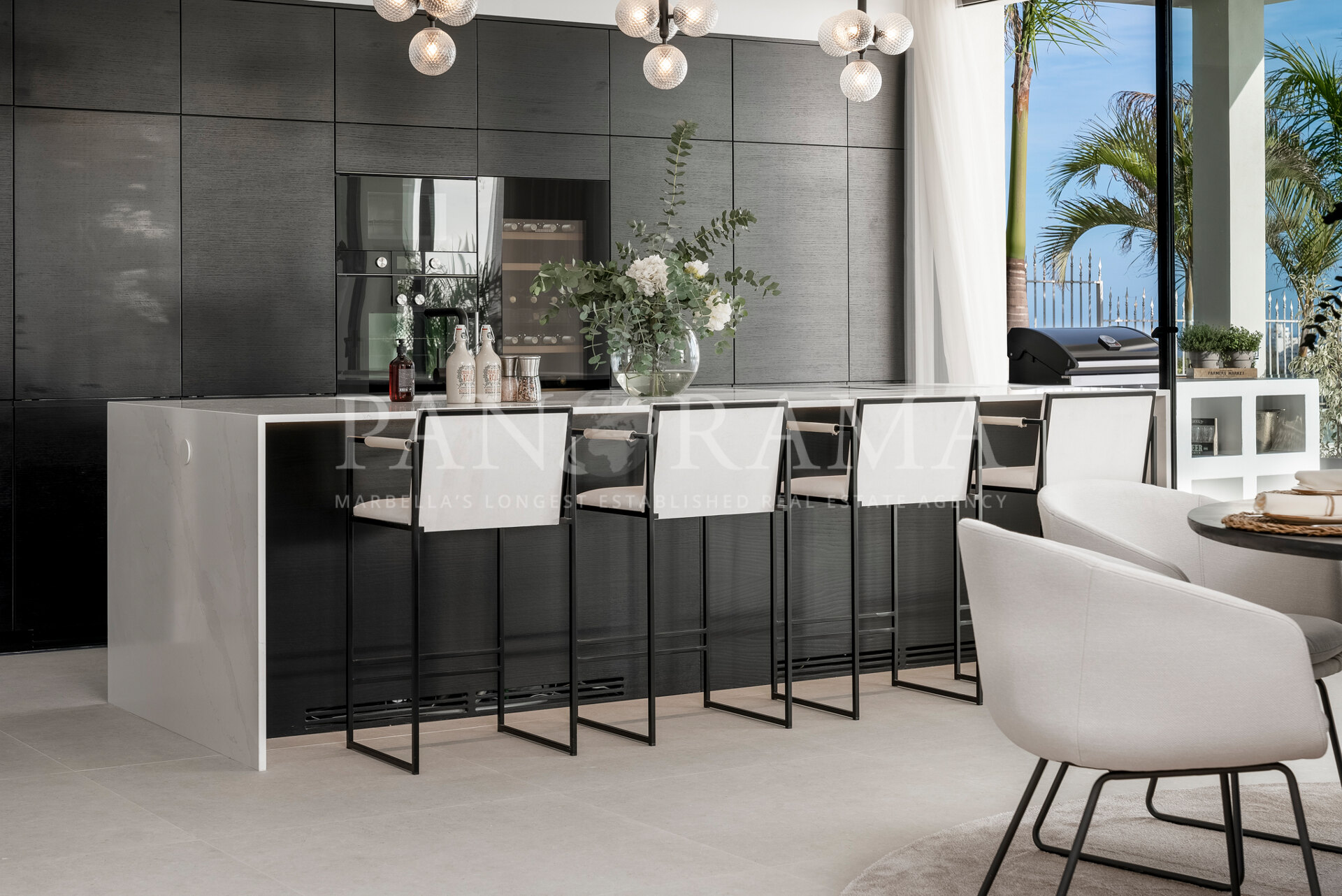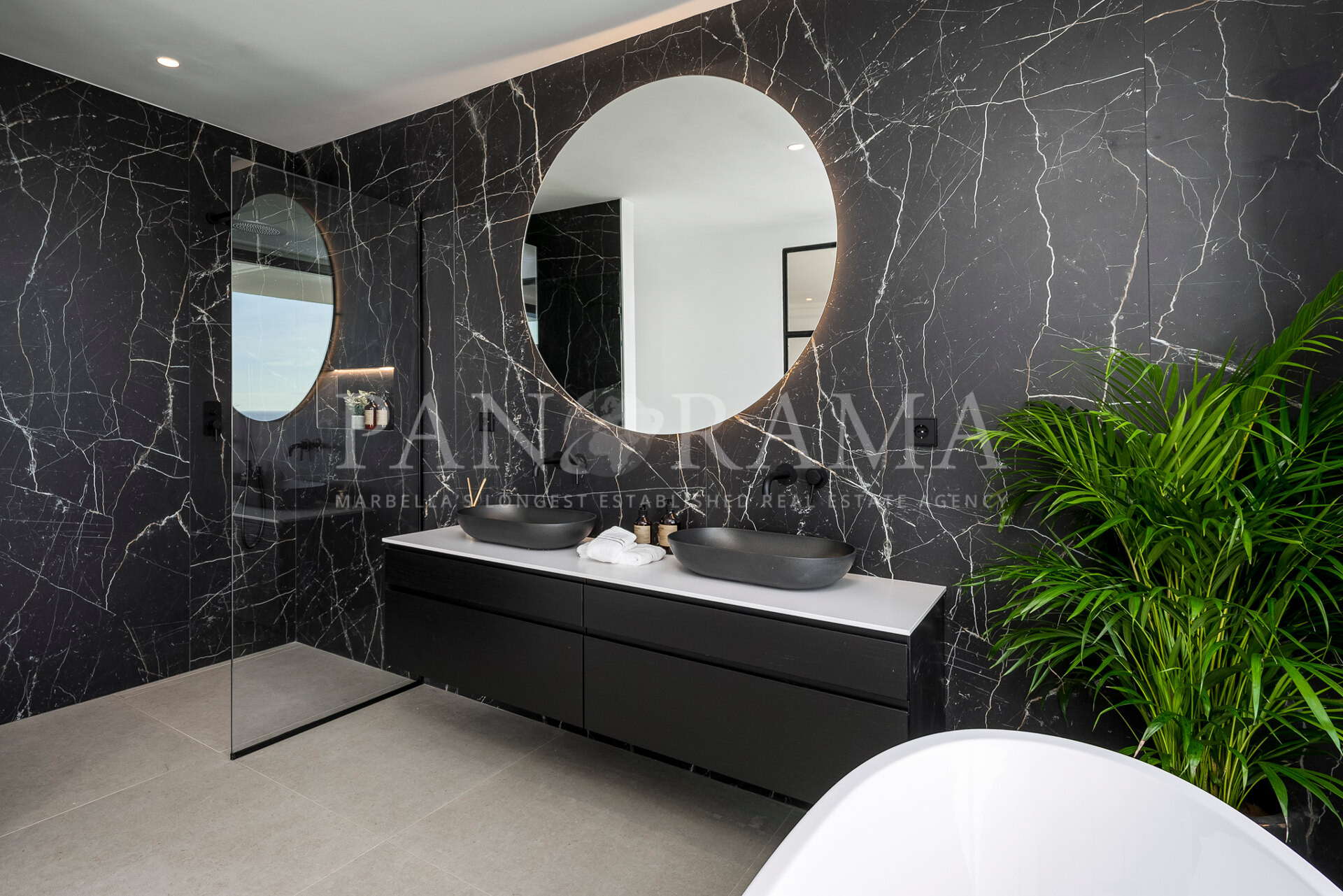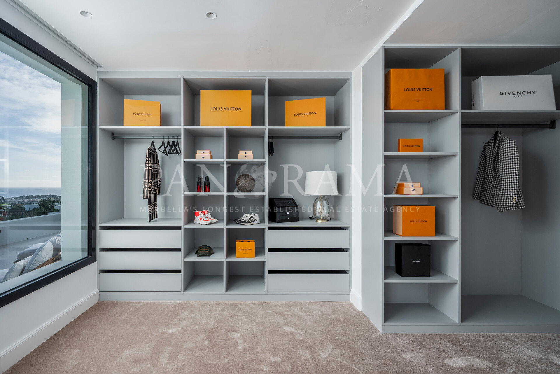 Schon beim Betreten des großen Eingangsbereichs werden Sie von einer Atmosphäre der Raffinesse und Pracht empfangen. Der Mittelpunkt der Eingangshalle ist eine imposante, elegant geschwungene Treppe, die mit einem dramatischen hängenden Lichtobjekt geschmückt ist und sofort Aufmerksamkeit erregt. Wenn Ihr Blick wandert, werden Sie von den atemberaubenden Ausblicken auf das Mittelmeer angezogen, die einen wirklich spektakulären ersten Eindruck hinterlassen und den Ton für den Rest des Hauses setzen.