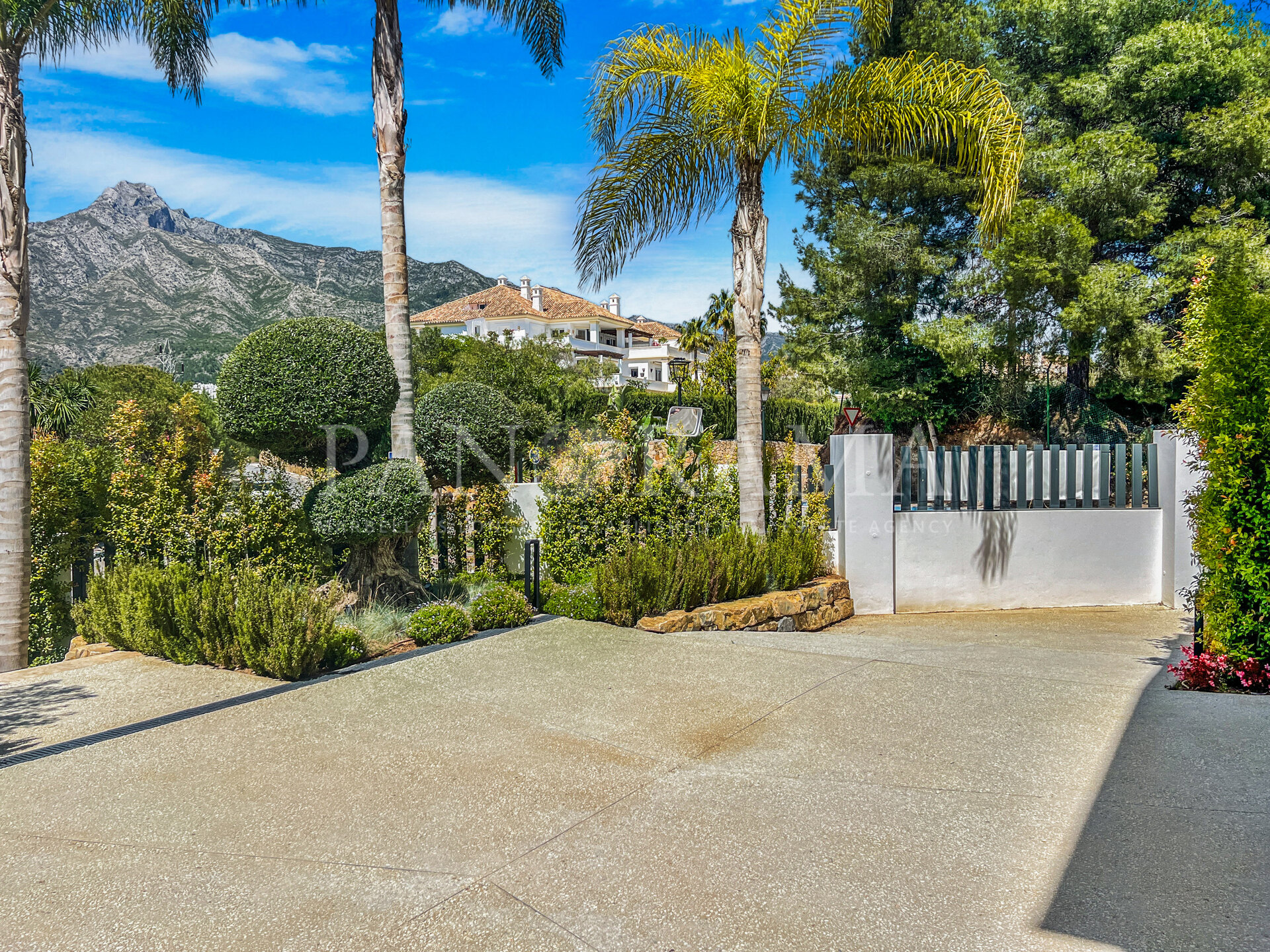 Auf einem erhöhten Grundstück erbaut, bietet die Villa atemberaubende Ausblicke auf das Mittelmeer und den ikonischen La Concha-Berg. Umgeben von einem wunderschön angelegten Garten mit üppigen Rasenflächen, lebhaften Blumenpflanzen und majestätischen Palmen strahlt die Immobilie Ruhe und Eleganz aus. Ein beheizter Salzwasserpool bereichert das Outdoor-Erlebnis und bietet den perfekten Ort, um das sonnige Klima Marbellas zu genießen.
