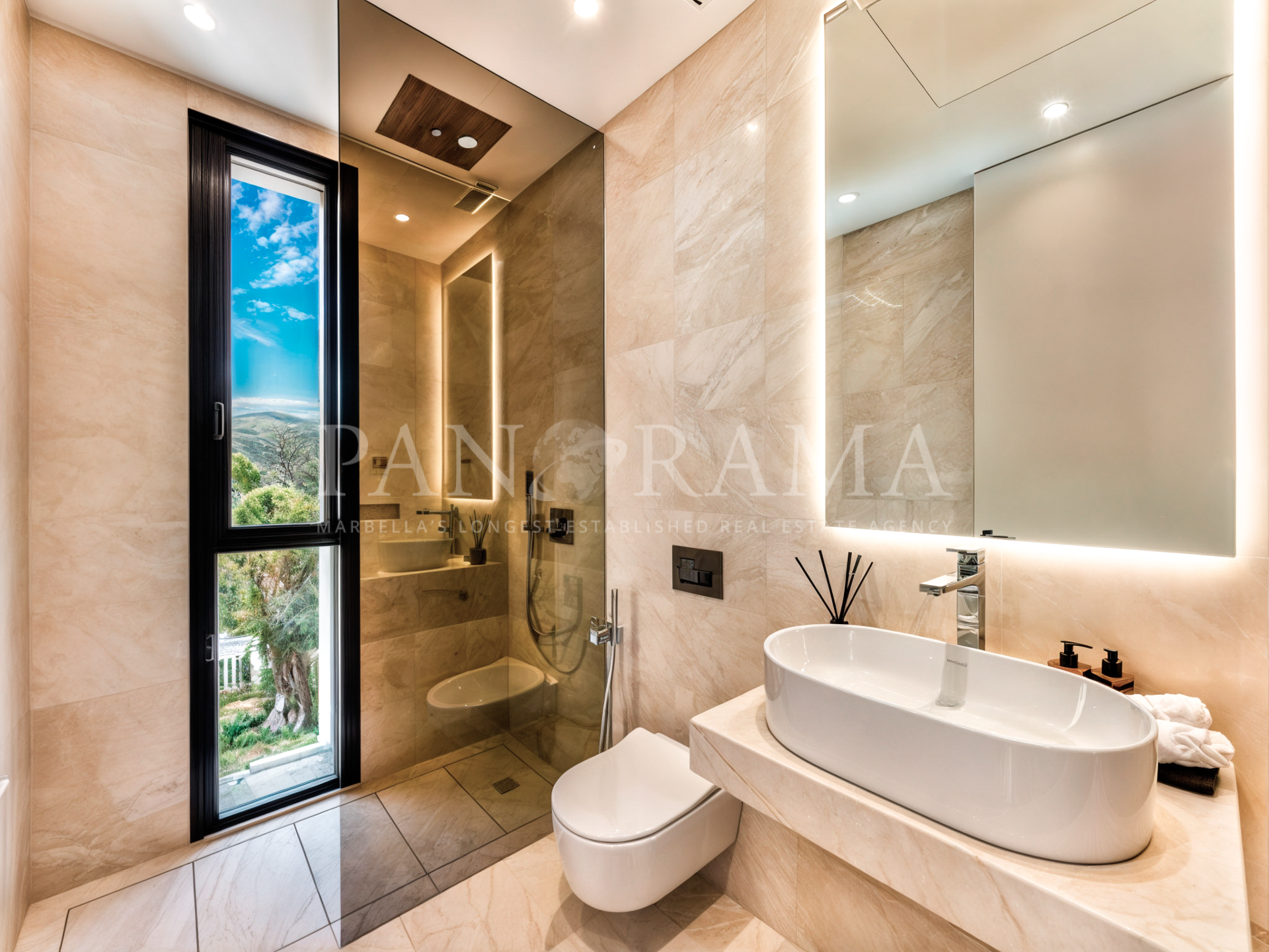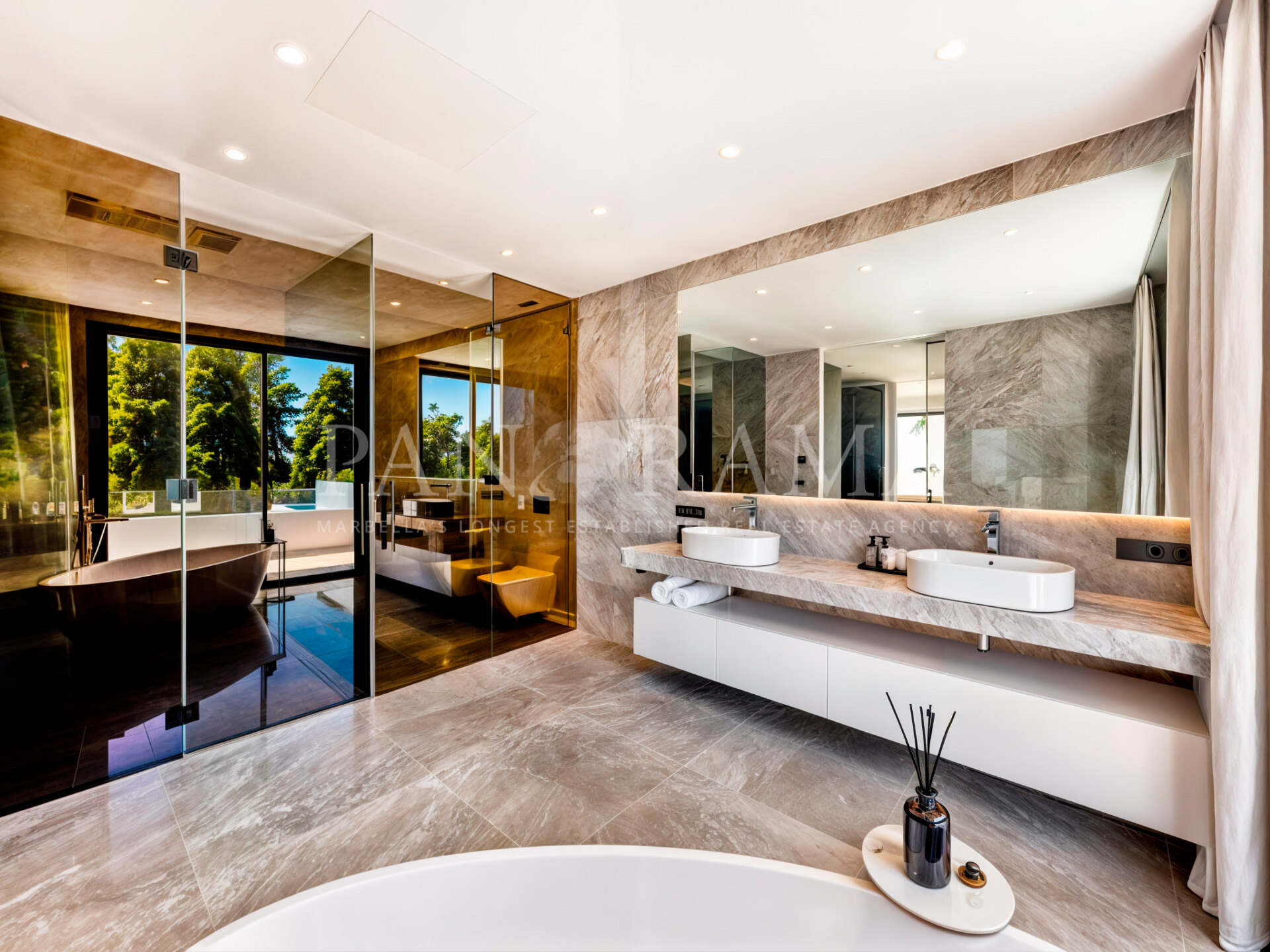 Eingebettet in eine der prestigeträchtigsten Gegenden der Goldenen Meile befindet sich diese exquisite Villa in Las Lomas del Marbella Club, in der Nähe von Puente Romano und dem Strand. Die Immobilie besticht durch ein modernes Design, das energieeffiziente Systeme und avantgardistische Architektur integriert und ein Zuhause schafft, das sowohl luxuriös als auch nachhaltig ist.