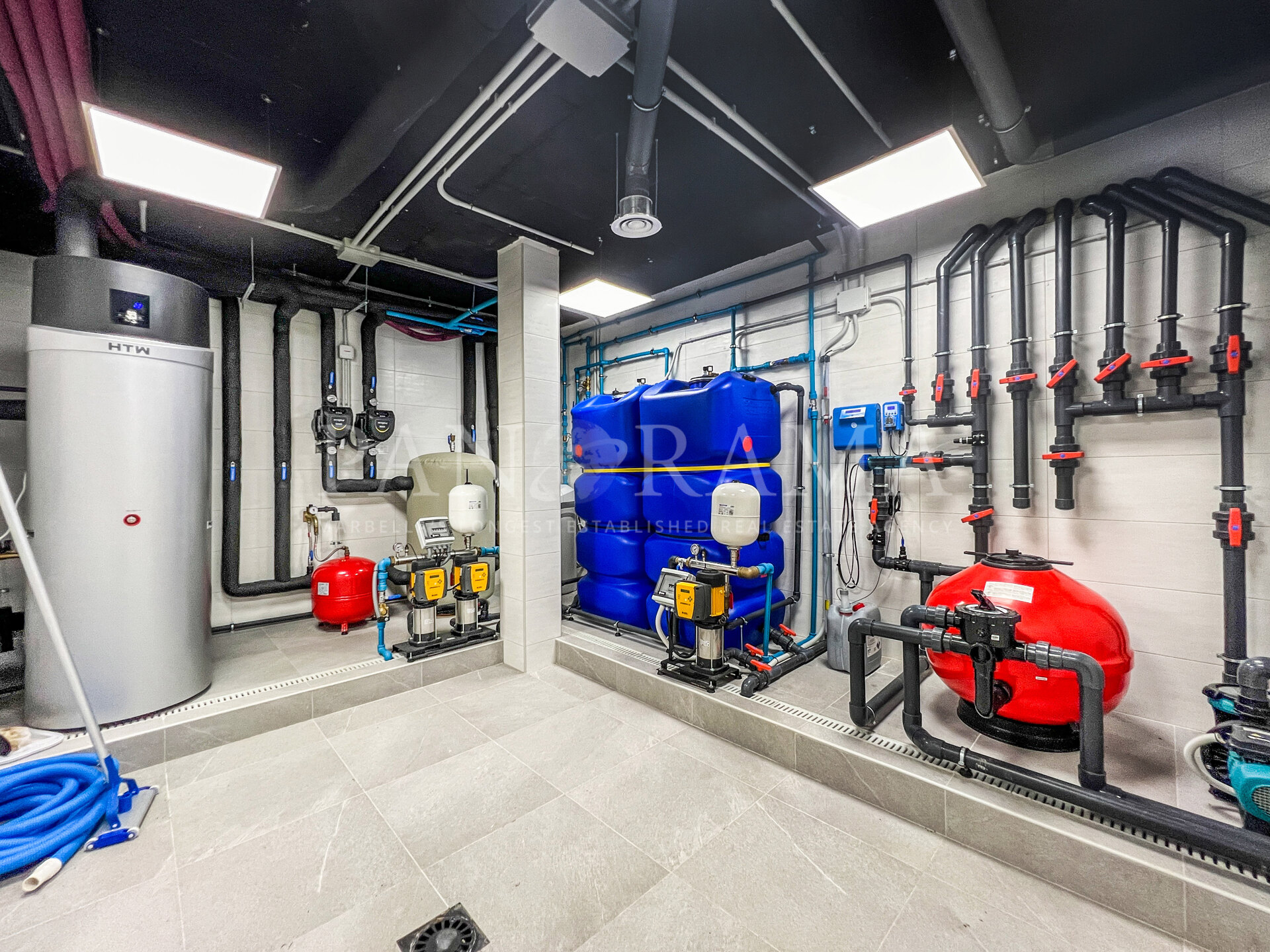 Das Kronjuwel der Villa ist ihre Dachterrasse, ein Solarium, das einen Panoramablick auf das Meer bietet. Dieser Raum ist perfekt für das Leben im Freien geeignet, mit Bereichen für ein Fitnessstudio, Entspannung und gesellschaftliche Zusammenkünfte, während Sie die mediterrane Brise und die atemberaubende Aussicht genießen.