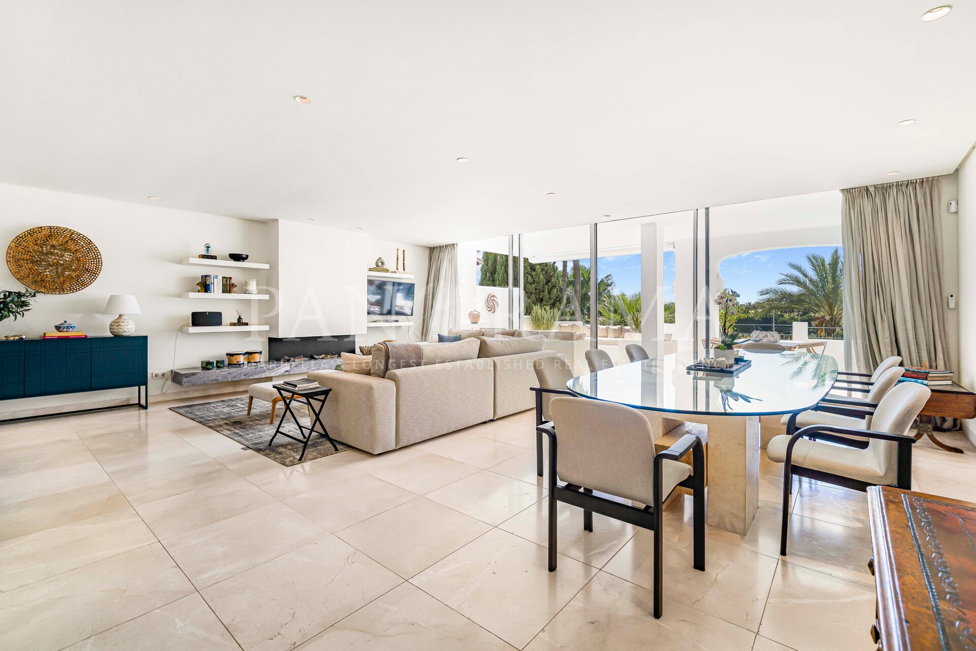 Der großzügige Wohn- und Essbereich ist das Herzstück des Hauses und wurde sowohl zum Entspannen als auch zum Unterhalten konzipiert. Dieser offene Raum ist lichtdurchflutet und schafft eine warme und einladende Atmosphäre. Große Schiebetüren öffnen sich auf eine großzügige überdachte Terrasse, die sich perfekt für Mahlzeiten im Freien oder einfach nur zum Genießen der Aussicht eignet. Mit Blick auf die Tennisplätze und teilweise Meerblick ist diese Terrasse eine private Oase, in der Sie sich entspannen und die ruhige Umgebung genießen können.