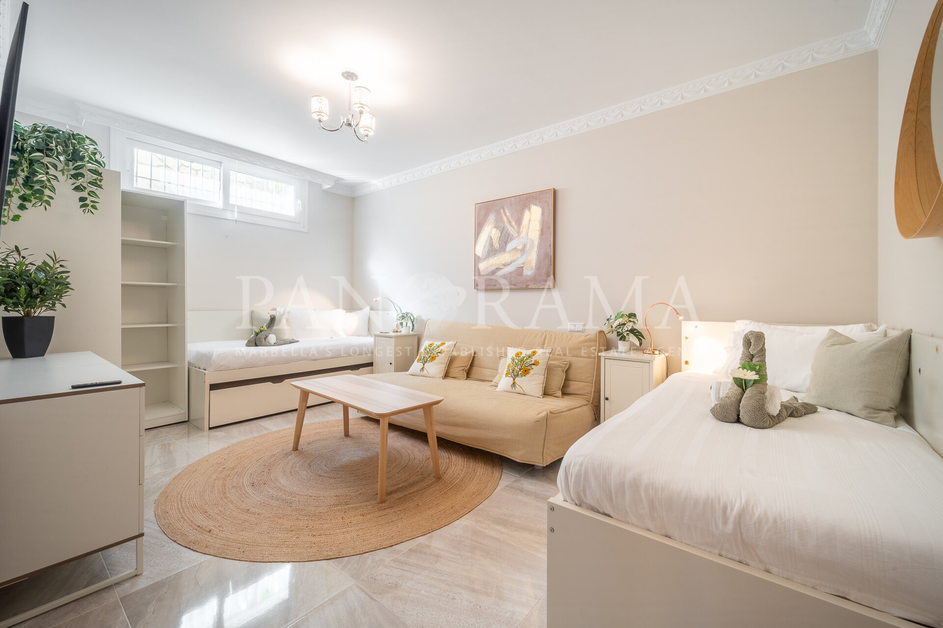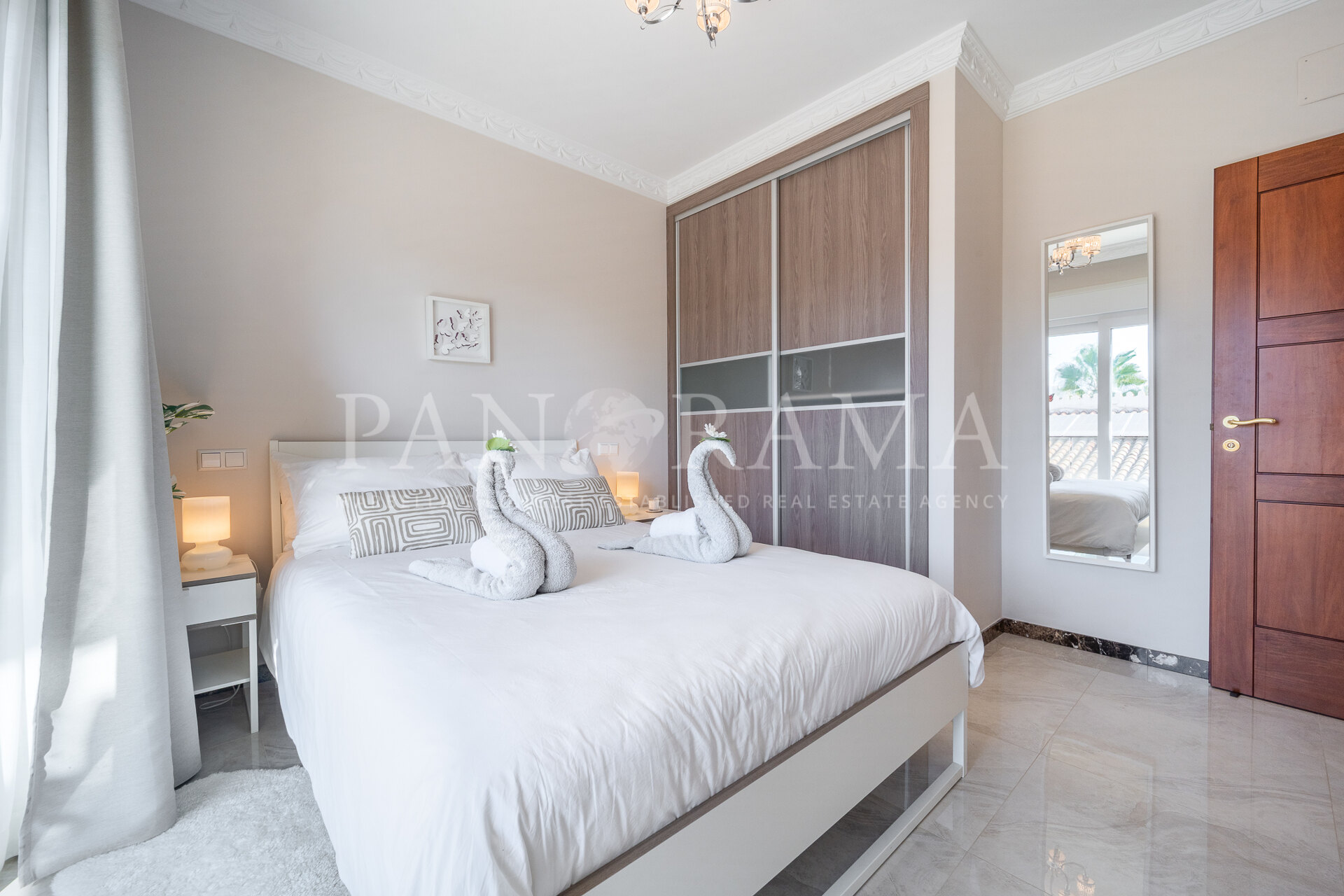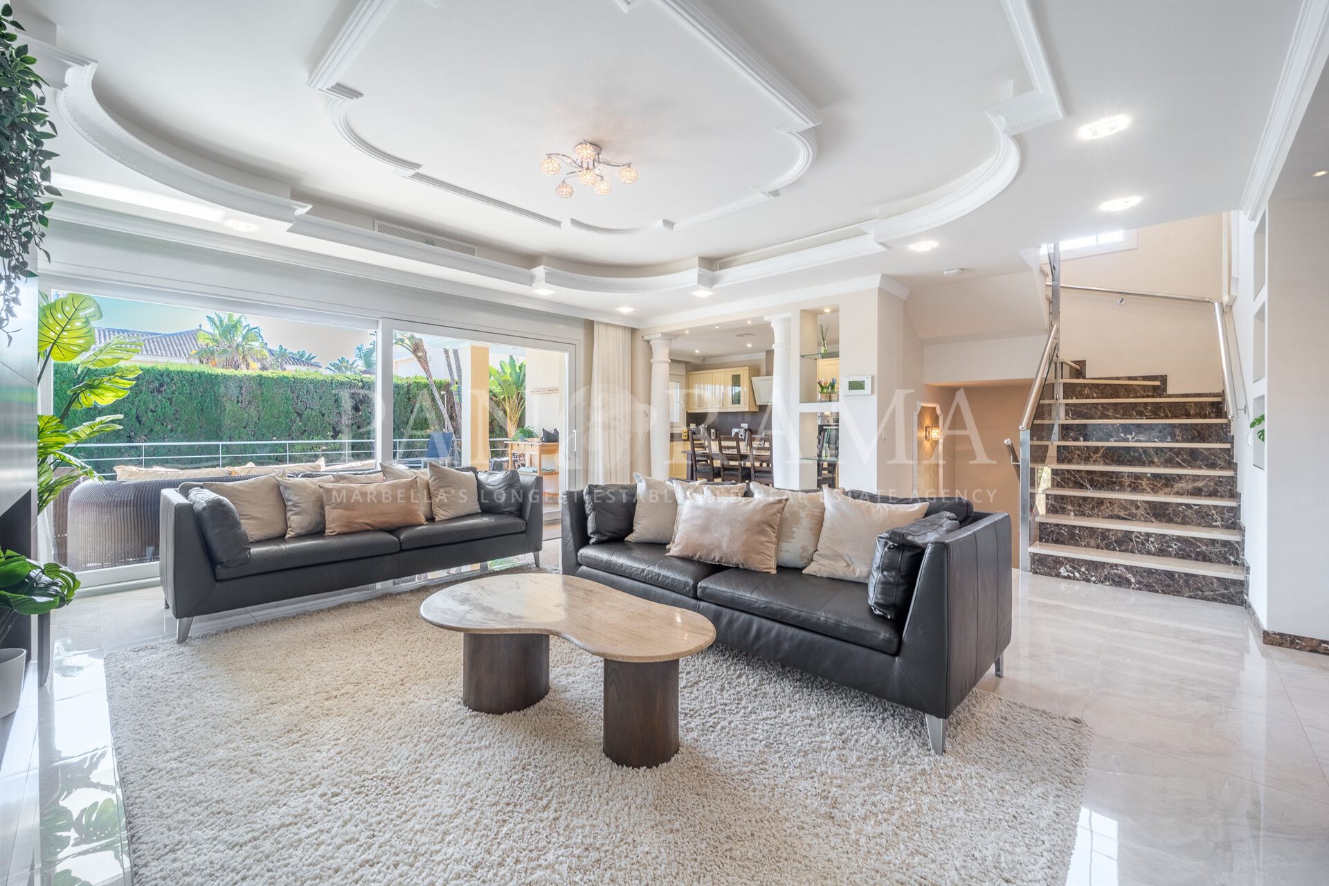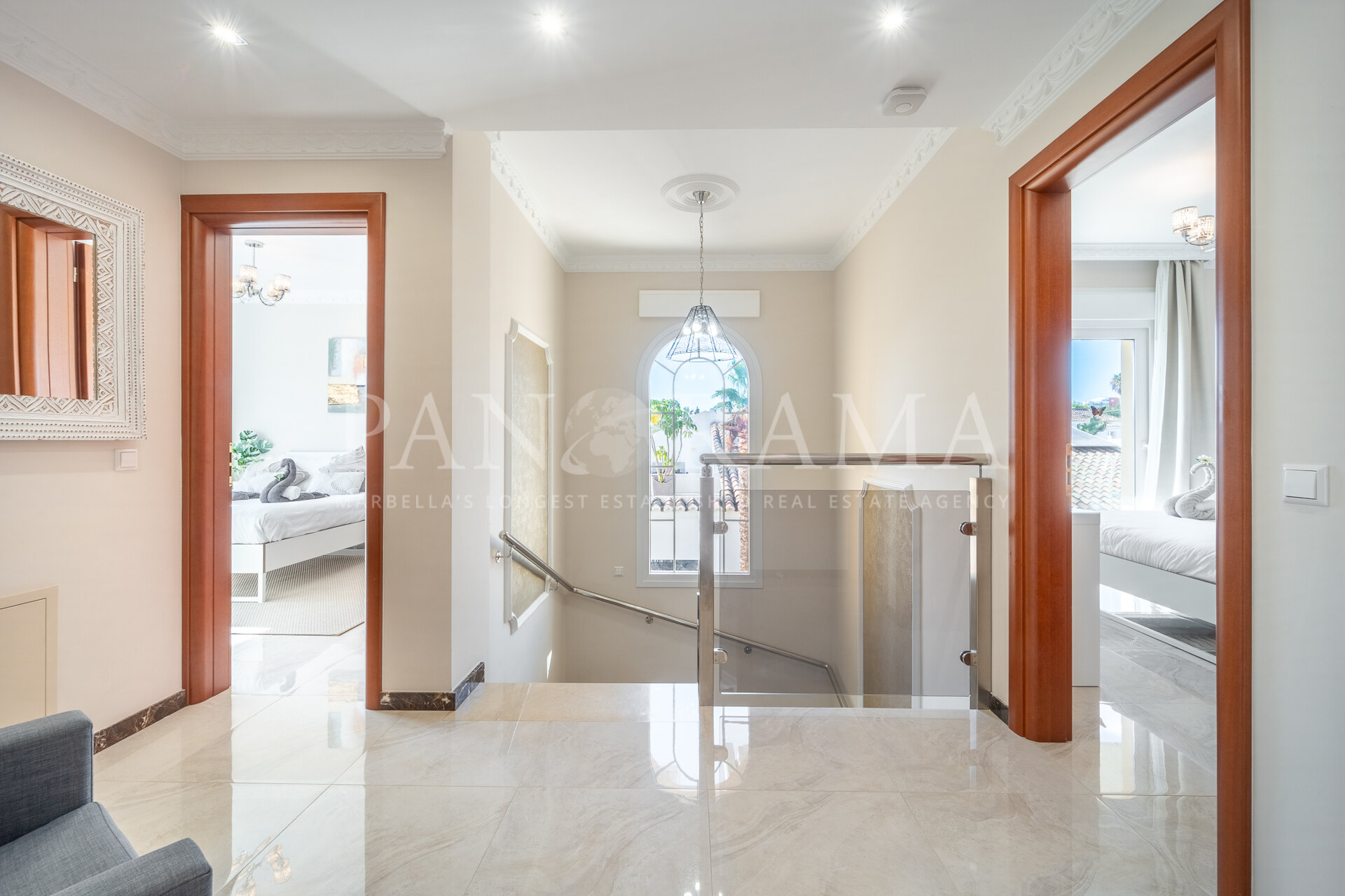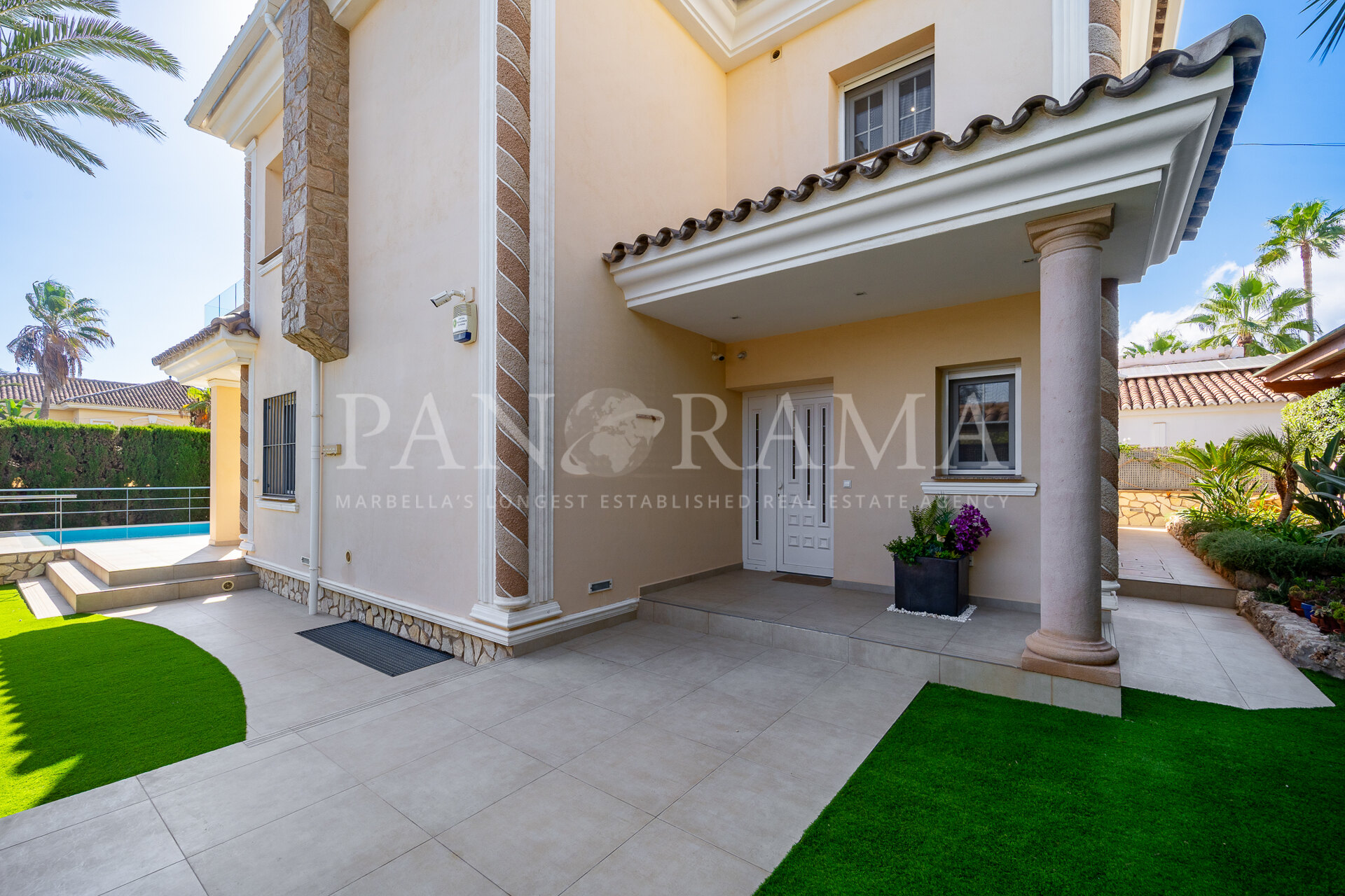 Diese wunderschön präsentierte Strandvilla befindet sich in der begehrten Gegend von Marbesa, Ost-Marbella – nur wenige Schritte von den goldenen Sandstränden Marbellas und einen kurzen Spaziergang von den bekannten Strandrestaurants Moosa Bay und Sinbad entfernt. Die Immobilie vereint Luxus, Komfort und Bequemlichkeit auf perfekte Weise und bietet eine außergewöhnliche Gelegenheit für alle, die ein Familienhaus, ein Feriendomizil oder eine Investition suchen, da sie über eine gültige Kurzzeitvermietungslizenz verfügt.
