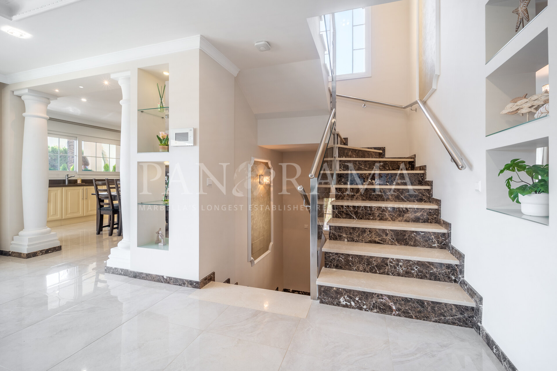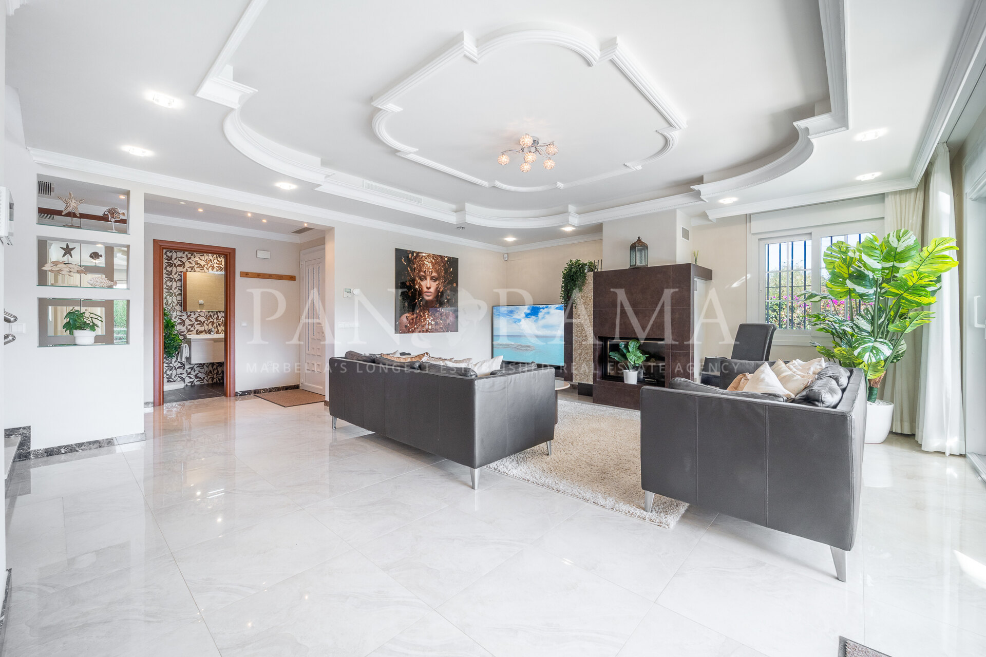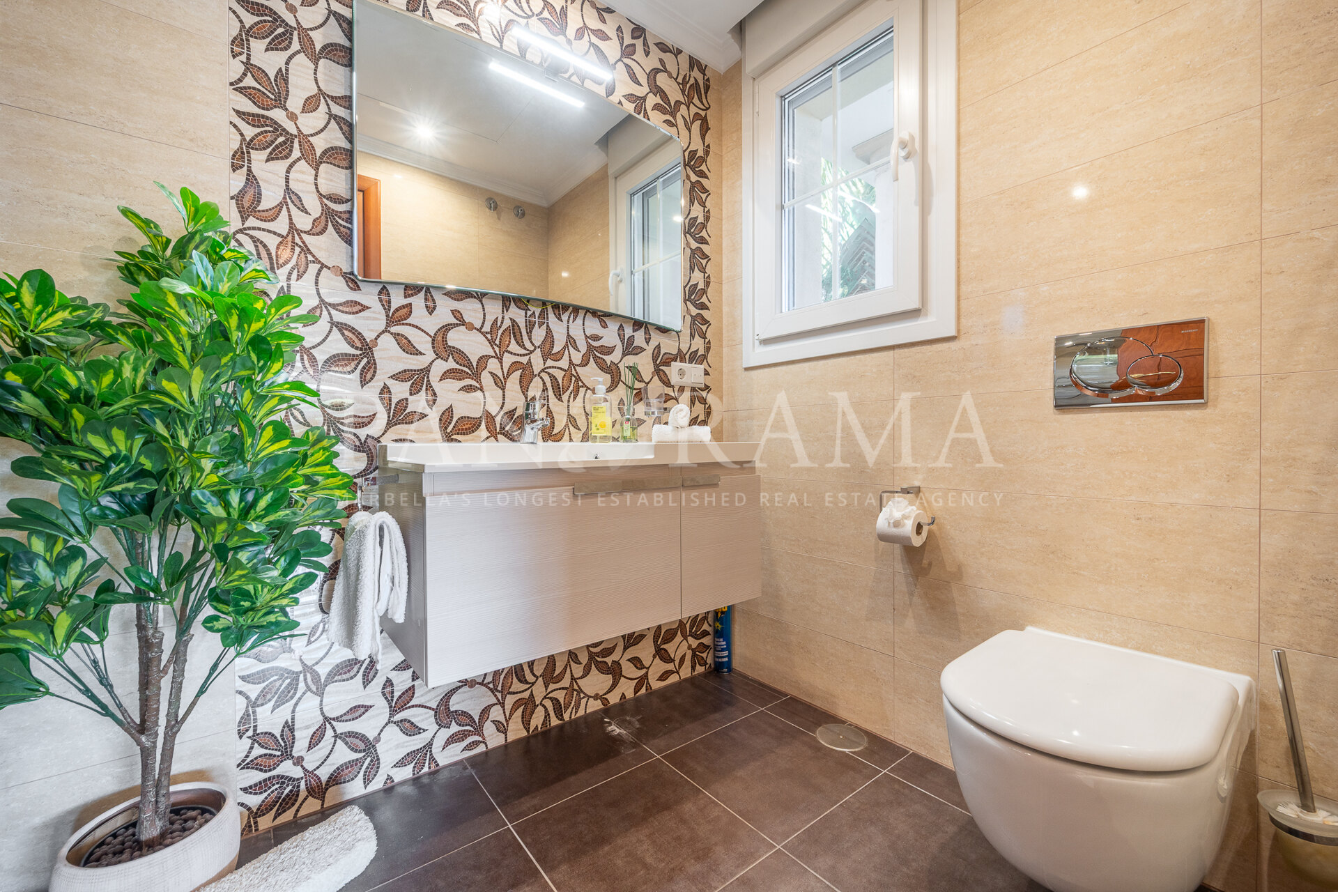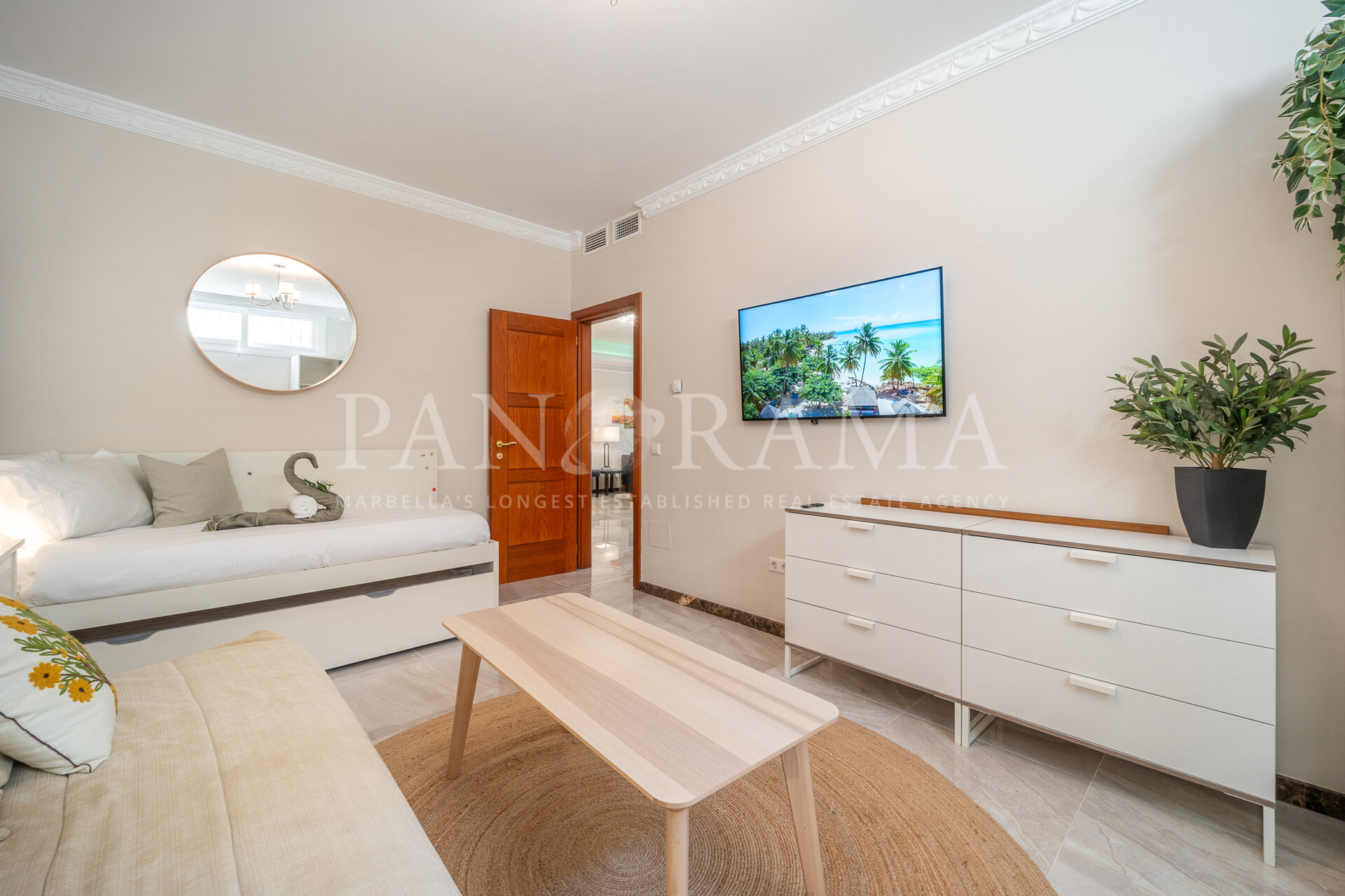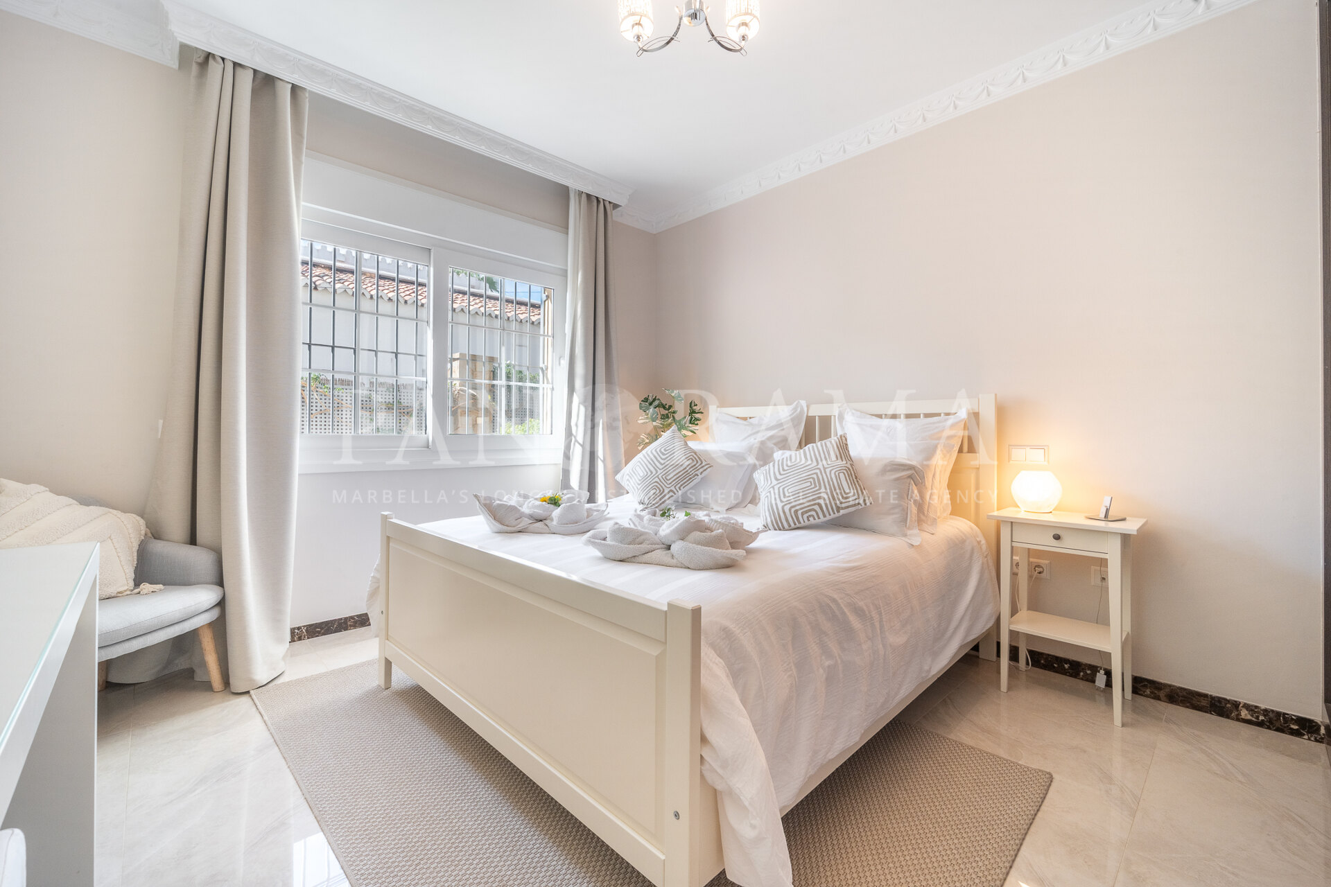 Diese wunderschön präsentierte Strandvilla befindet sich in der begehrten Gegend von Marbesa, Ost-Marbella – nur wenige Schritte von den goldenen Sandstränden Marbellas und einen kurzen Spaziergang von den bekannten Strandrestaurants Moosa Bay und Sinbad entfernt. Die Immobilie vereint Luxus, Komfort und Bequemlichkeit auf perfekte Weise und bietet eine außergewöhnliche Gelegenheit für alle, die ein Familienhaus, ein Feriendomizil oder eine Investition suchen, da sie über eine gültige Kurzzeitvermietungslizenz verfügt.
