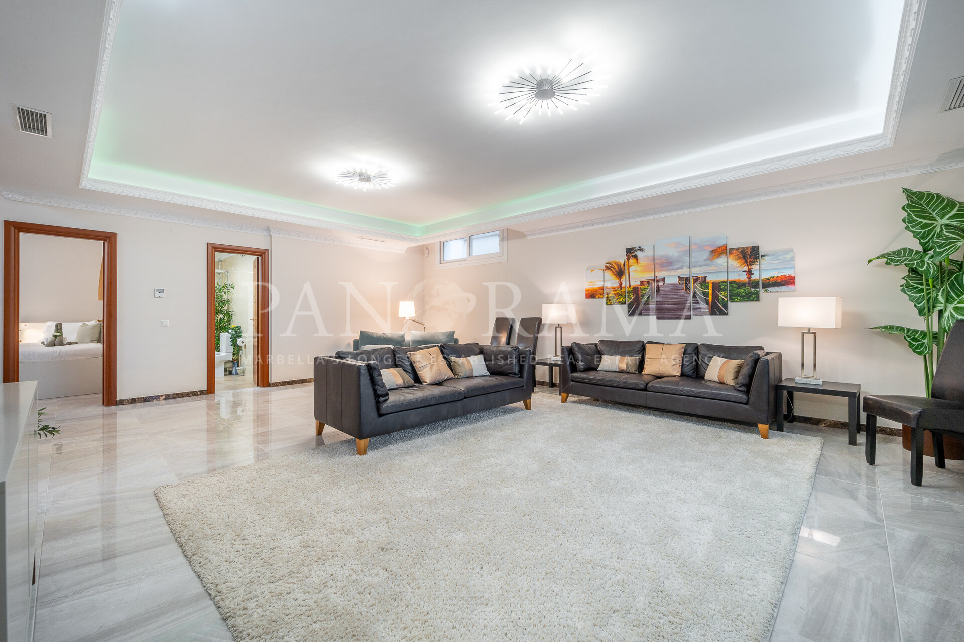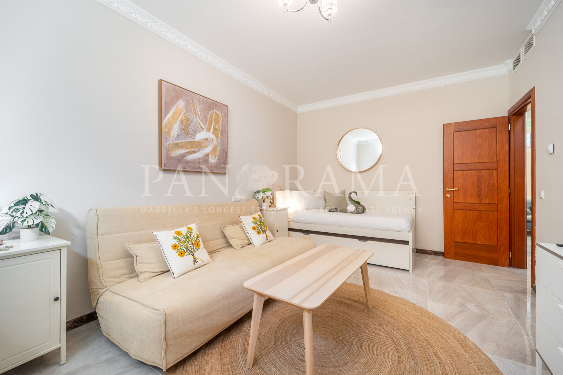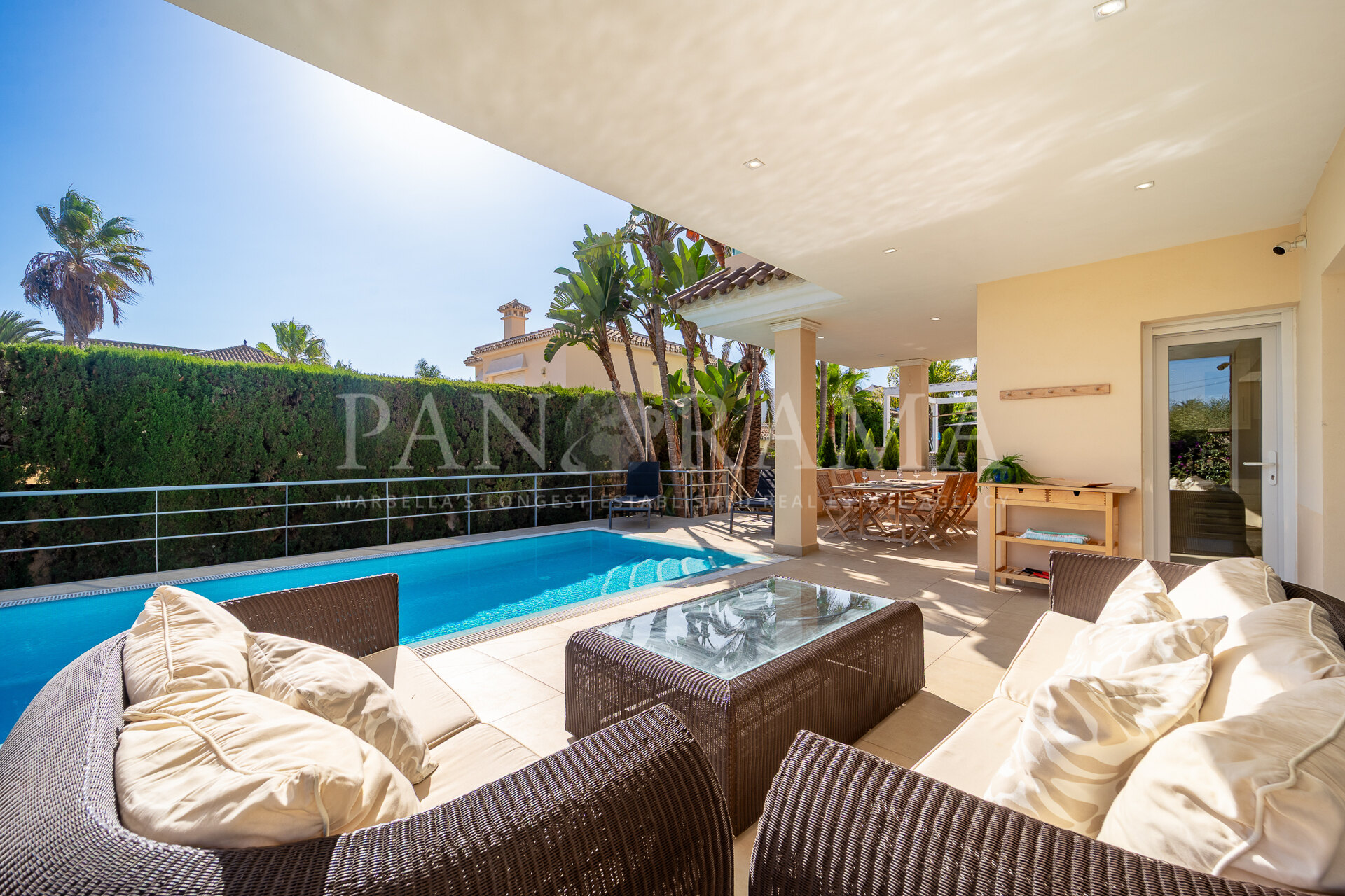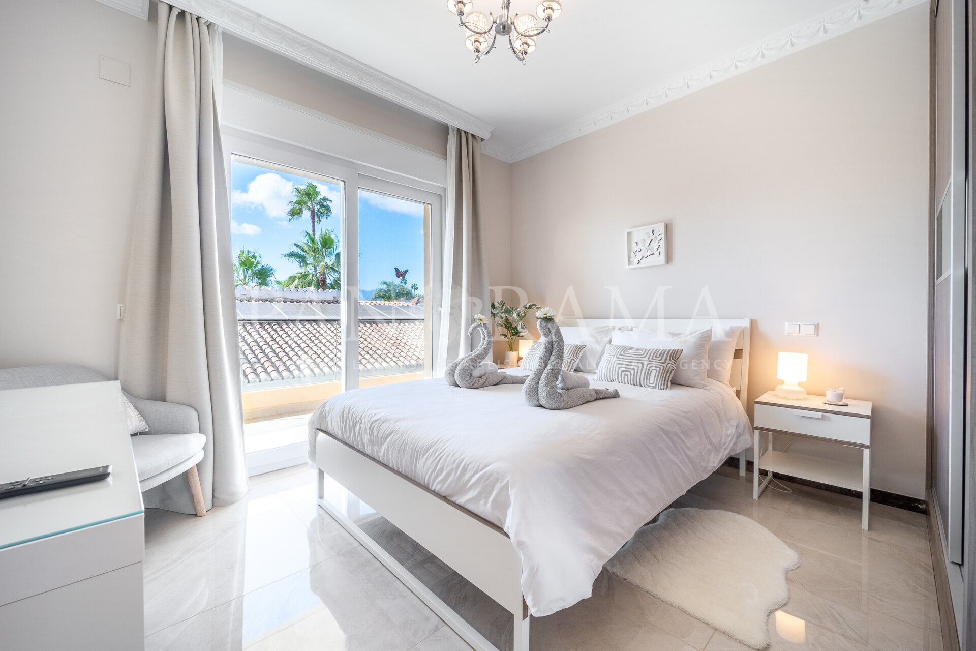 Diese wunderschön präsentierte Strandvilla befindet sich in der begehrten Gegend von Marbesa, Ost-Marbella – nur wenige Schritte von den goldenen Sandstränden Marbellas und einen kurzen Spaziergang von den bekannten Strandrestaurants Moosa Bay und Sinbad entfernt. Die Immobilie vereint Luxus, Komfort und Bequemlichkeit auf perfekte Weise und bietet eine außergewöhnliche Gelegenheit für alle, die ein Familienhaus, ein Feriendomizil oder eine Investition suchen, da sie über eine gültige Kurzzeitvermietungslizenz verfügt.