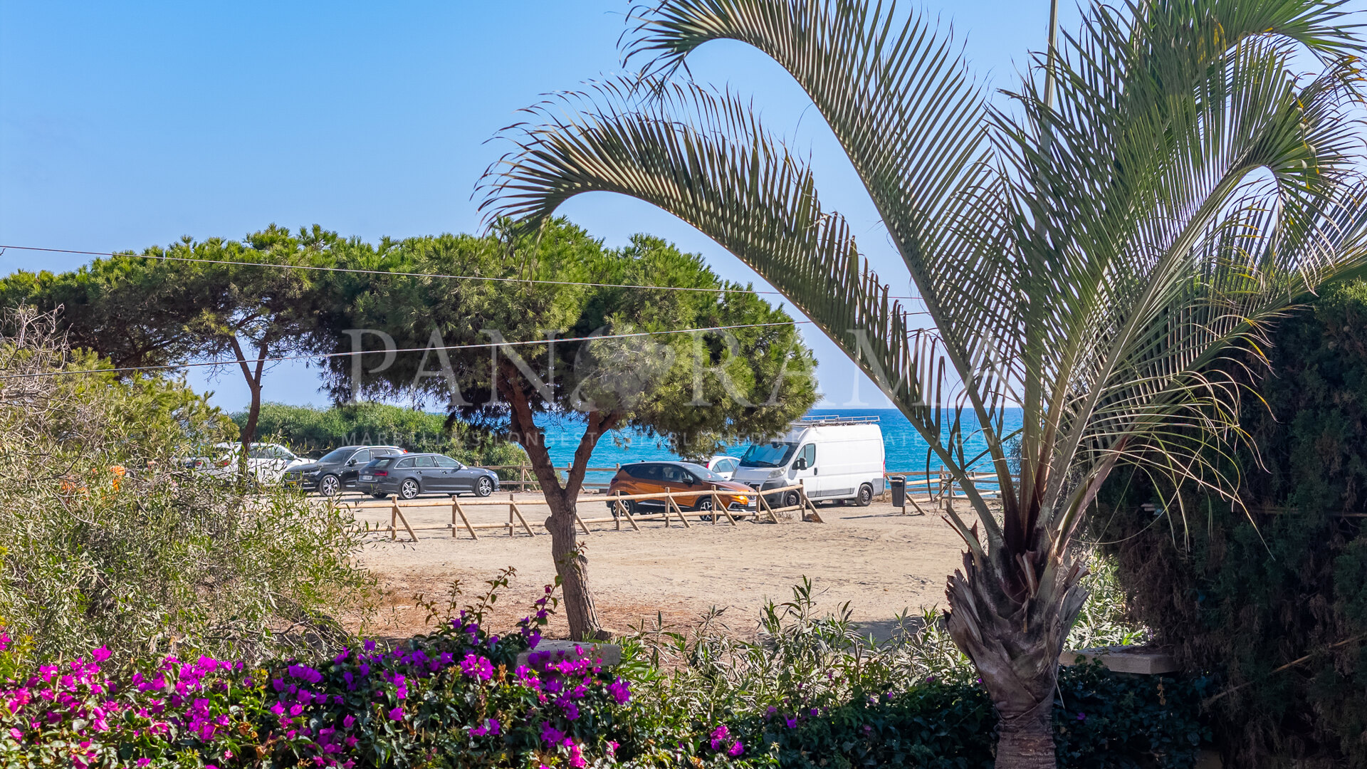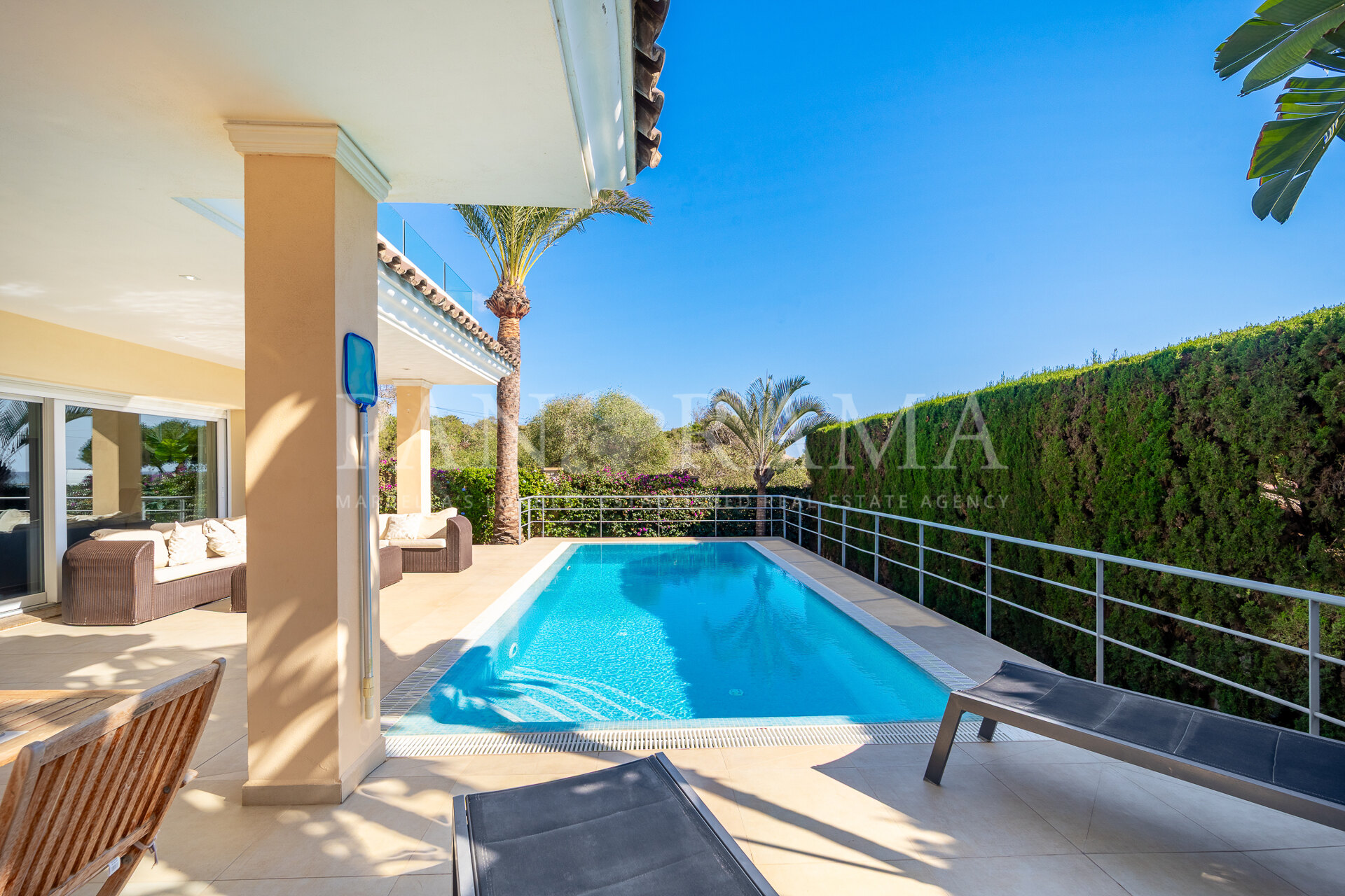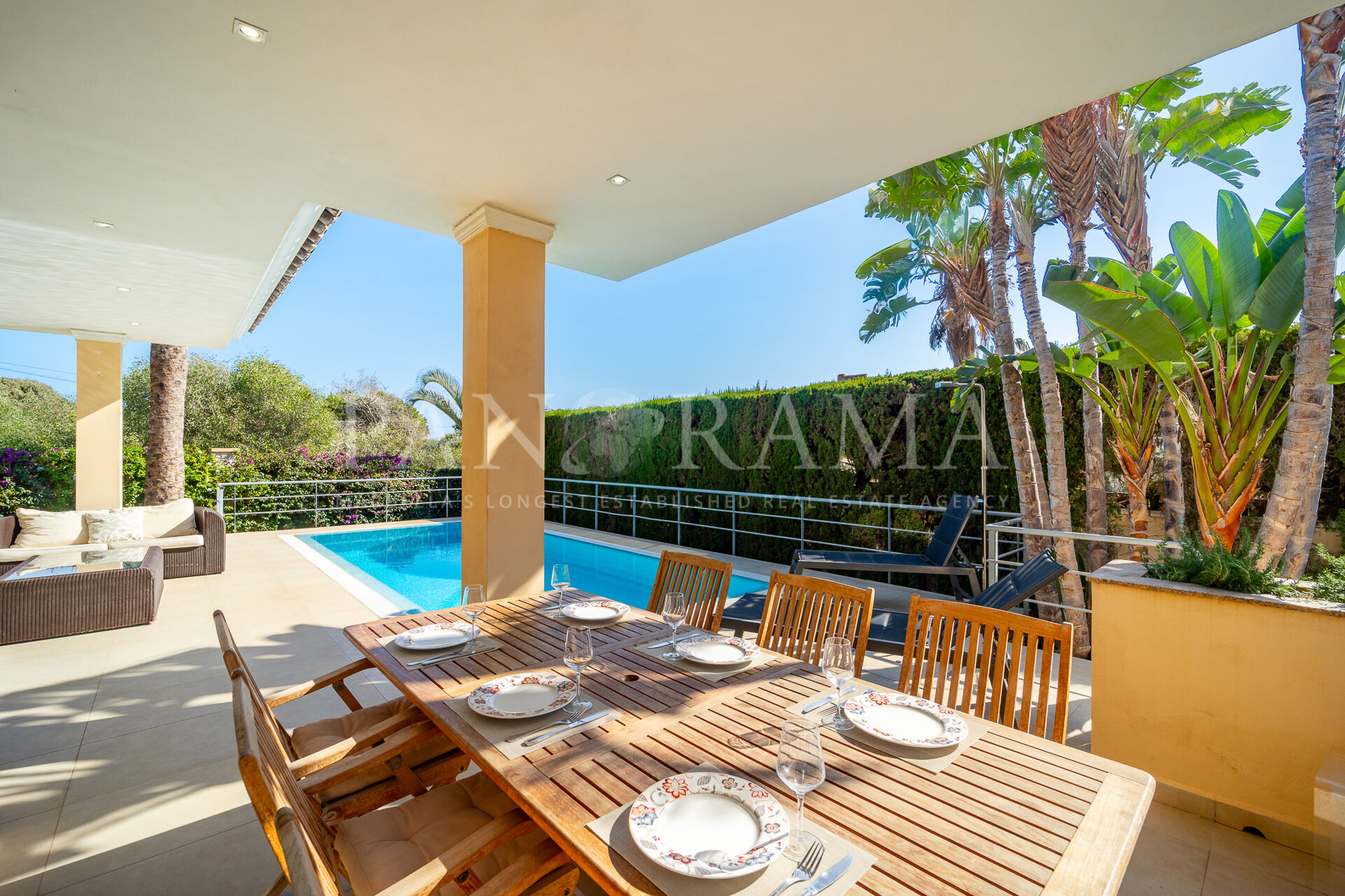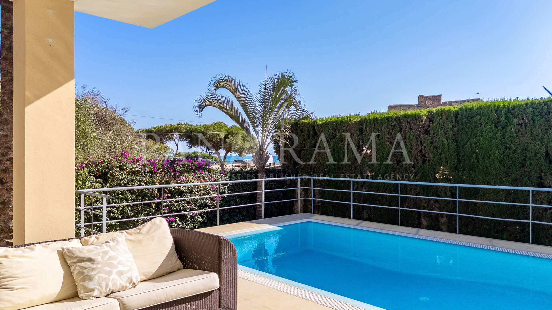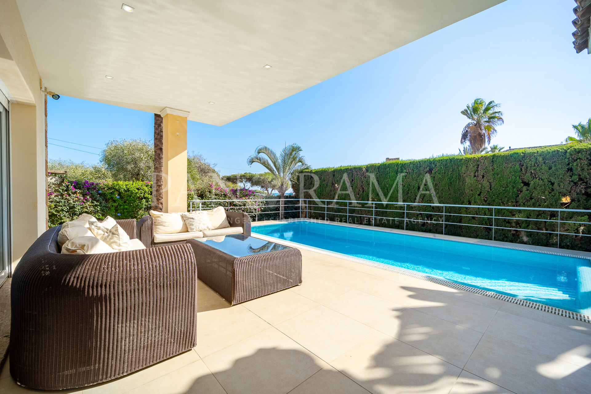 Der Wohnbereich öffnet sich direkt auf eine großzügige Terrasse mit Blick auf den Swimmingpool und den gepflegten Garten, die beide auf einfache Wartung ausgelegt sind. Dieser Außenbereich ist ideal, um den mediterranen Lebensstil zu genießen – sei es beim Essen im Freien, beim Sonnenbaden am Pool oder bei ruhigen Abenden mit dem Klang des Meeres im Hintergrund.