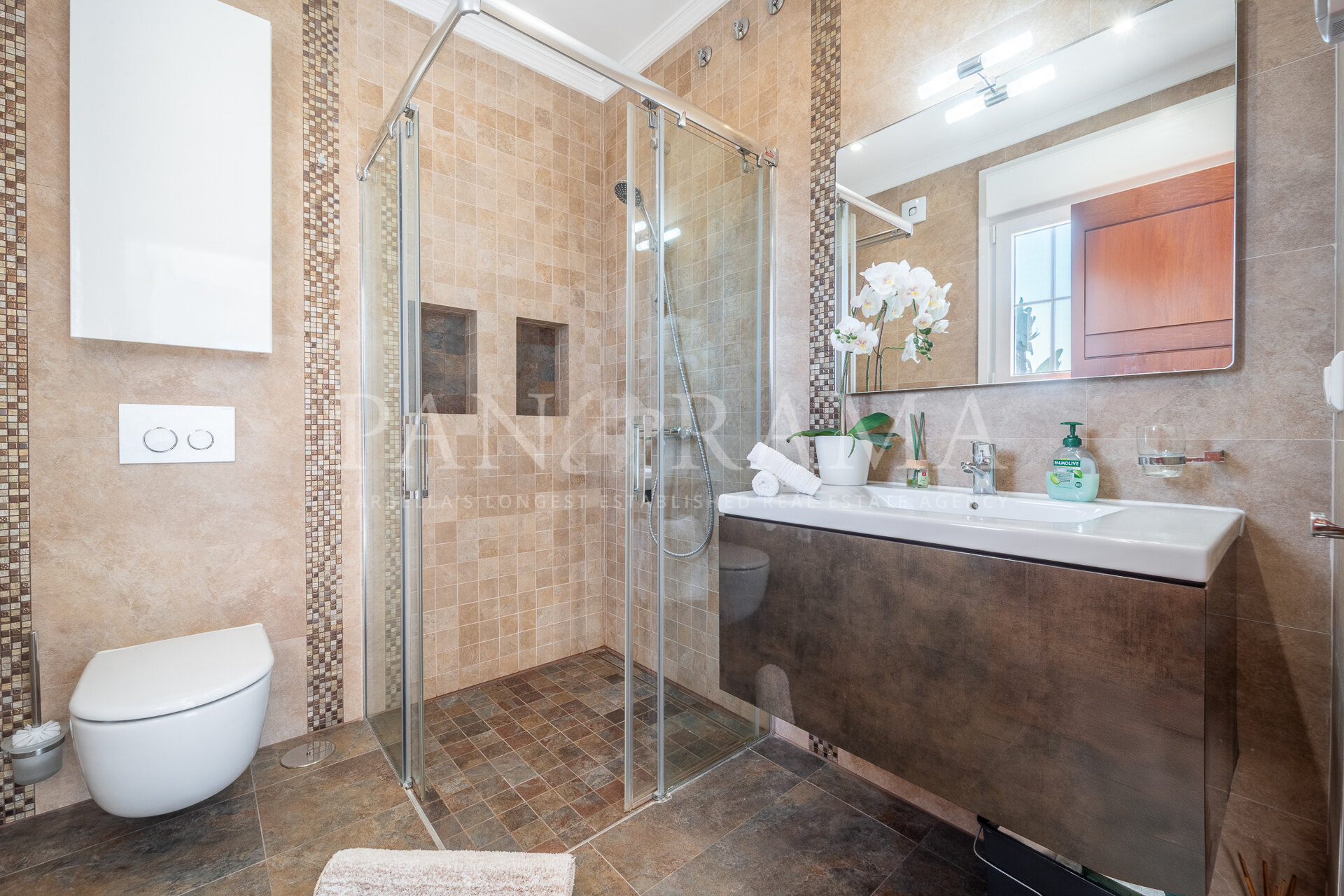 Im Obergeschoss verfügt die Villa über drei komfortable Schlafzimmer, die jeweils durchdacht gestaltet wurden, um Privatsphäre und Ruhe zu bieten. Die Master-Suite verfügt über ein elegantes eigenes Bad, während die beiden Gästezimmer sich ein wunderschön ausgestattetes Familienbad mit begehbarer Dusche teilen. Natürliches Licht durchflutet jeden Raum und schafft ein Gefühl von Gelassenheit und Verbundenheit mit der Küstenumgebung. Von dieser Ebene aus kann man sogar einen Blick auf das Meer erhaschen, was an die privilegierte Lage des Hauses erinnert.