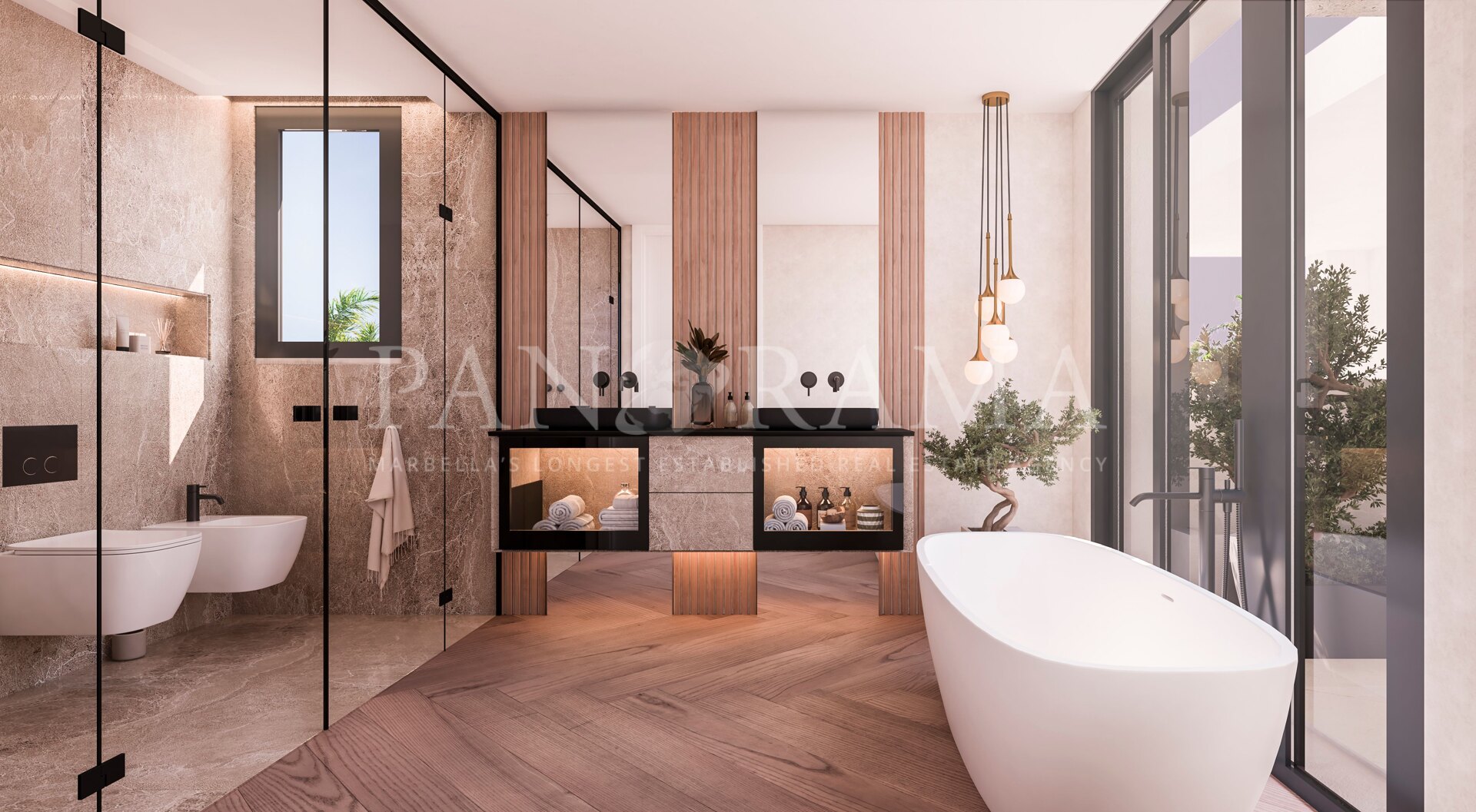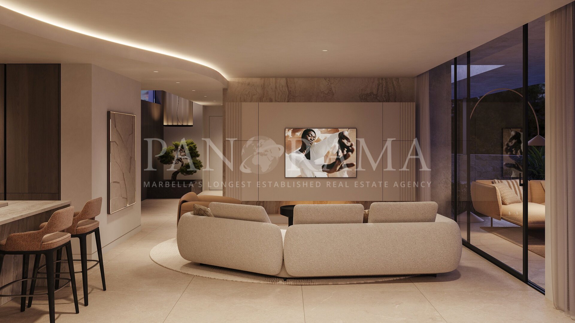 Das Hauptkonzept der Anlage ist es, helle, großzügige Wohnräume zu schaffen, die die Natur ins Haus holen. Jede Villa ist nach Süden ausgerichtet und verfügt über große, offene Innenräume, die nahtlos in den Außenbereich übergehen. Fensterfronten vom Boden bis zur Decke, weitläufige Terrassen, angelegte Gärten und private Swimmingpools schaffen einen fließenden Übergang zwischen Innen- und Außenbereich – ideal, um das warme Klima Marbellas das ganze Jahr über zu genießen.