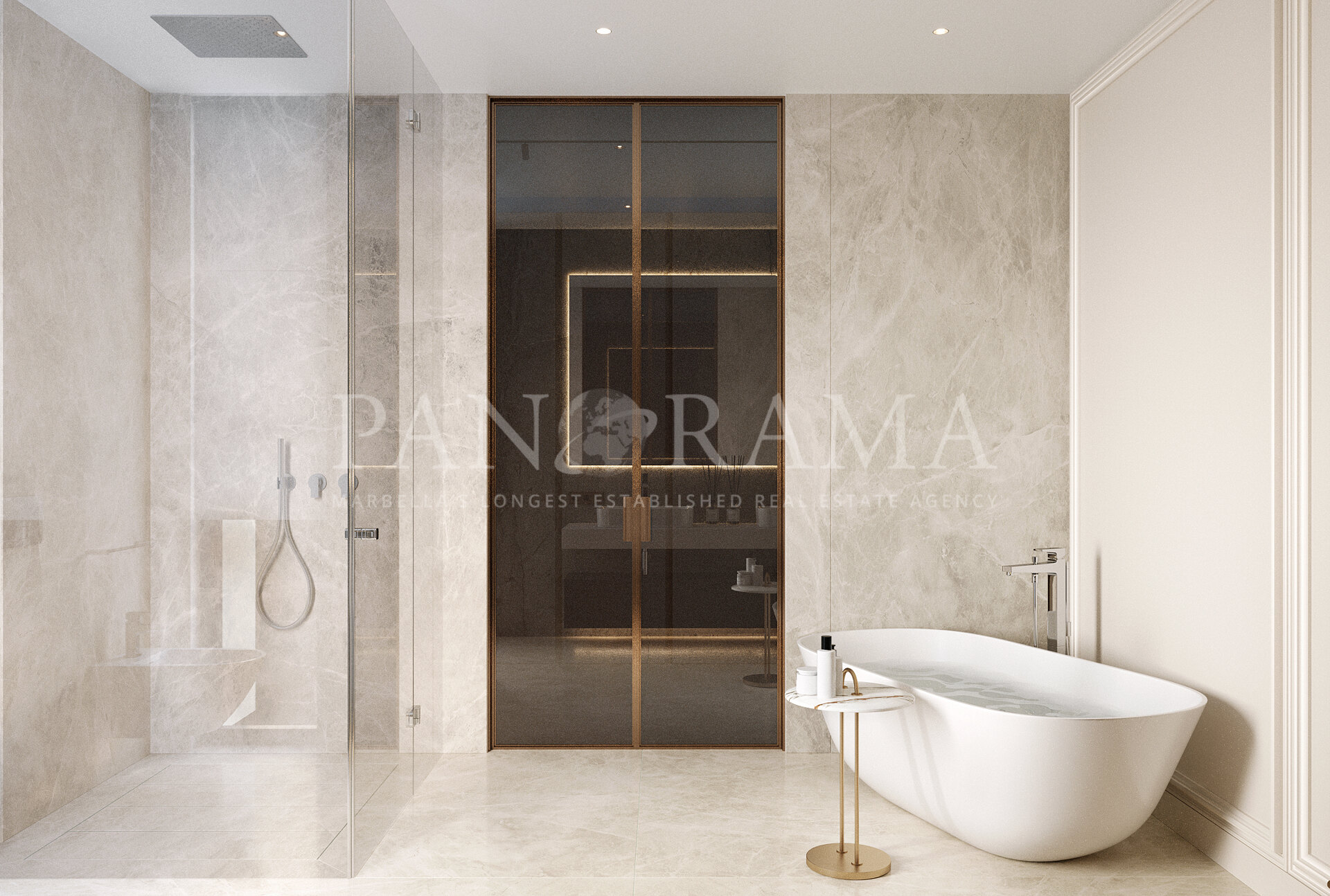 Das Obergeschoss beherbergt zwei luxuriöse Schlafzimmer mit eigenem Bad, darunter die Master-Suite. Die Master-Suite ist ein privater Rückzugsort mit begehbarem Kleiderschrank, elegantem Badezimmer und eigener Terrasse mit ruhigem Ausblick. Ein zweites Schlafzimmer mit eigenem Bad bietet ebenfalls Zugang zu einer privaten Terrasse, was das Gefühl von Raum und Ruhe verstärkt.