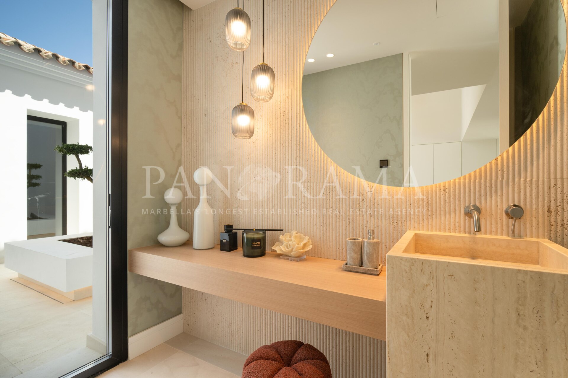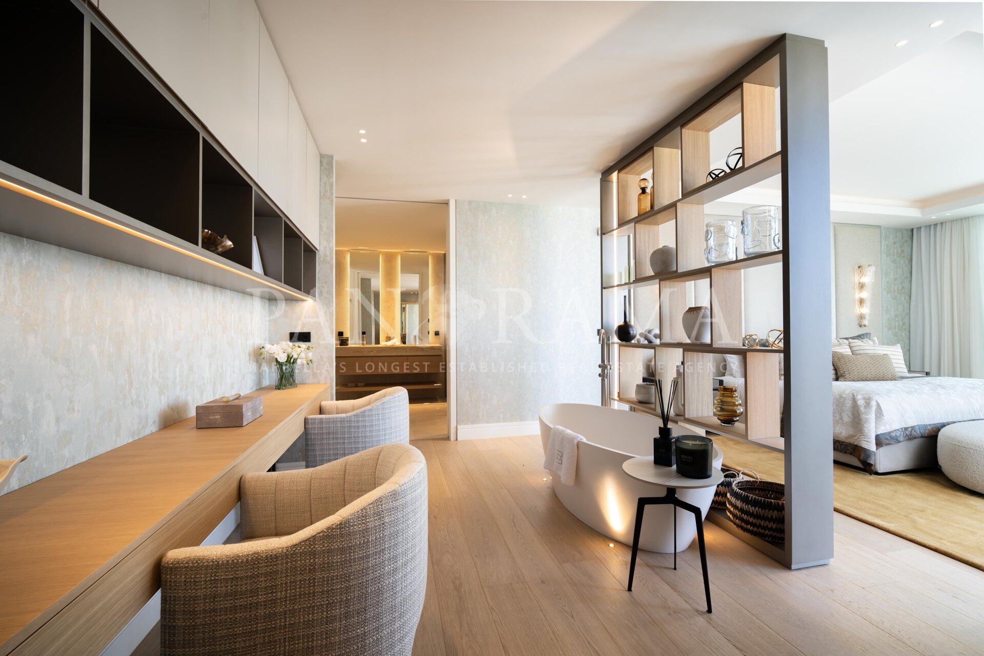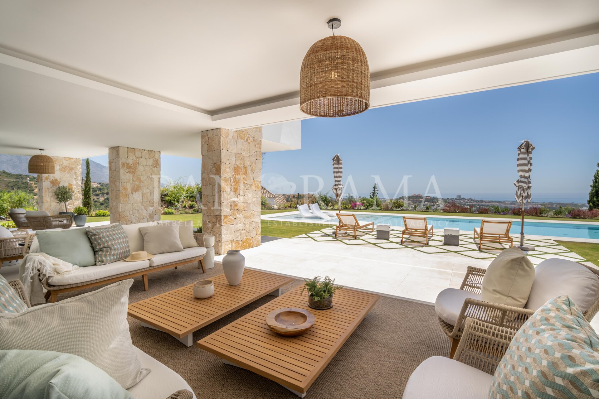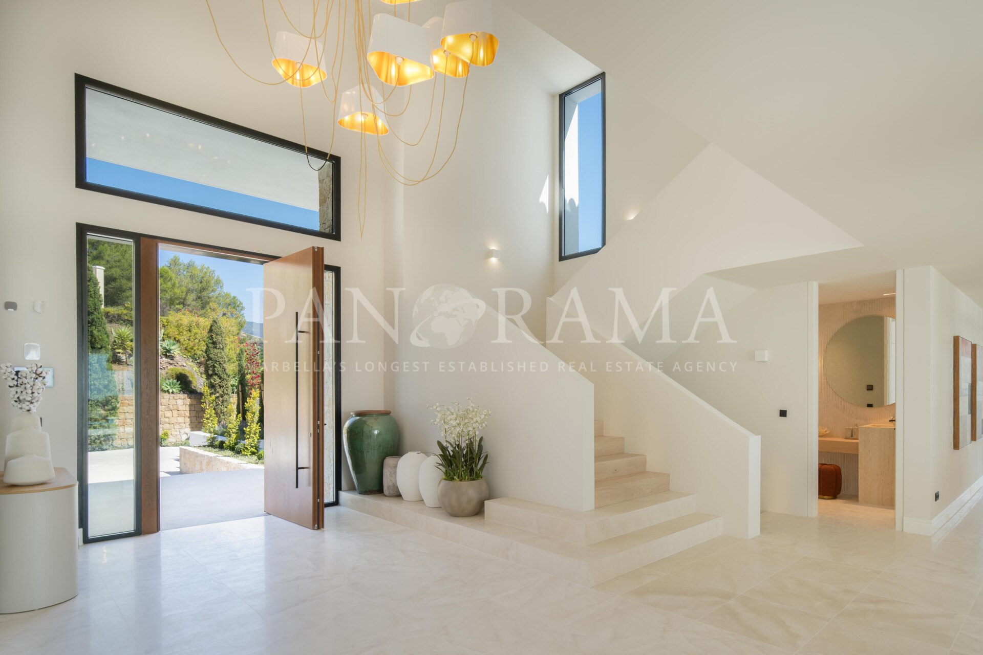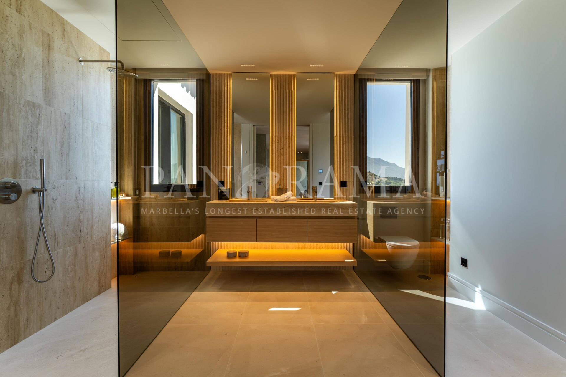 La villa cuenta con una integración perfecta entre la sala de estar, el comedor y una cocina moderna que constituye el corazón del hogar, destacándose por una impresionante isla y amplio espacio de almacenamiento. Los dormitorios están elegantemente decorados, con el dormitorio principal como un oasis privado conectado a una terraza privada que ofrece vistas panorámicas al mar Mediterráneo y al entorno verde circundante, ideal para relajarse y disfrutar del entorno.