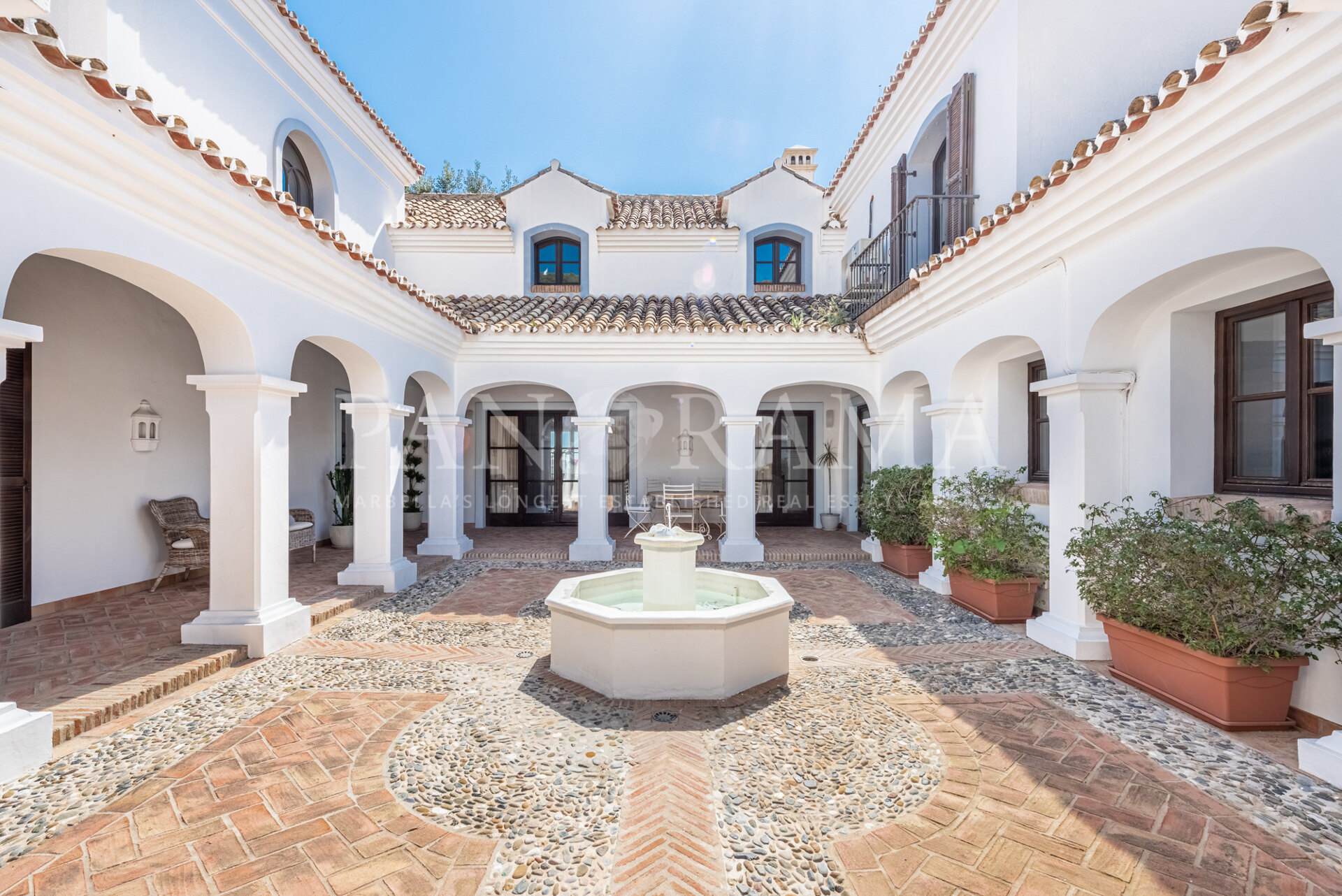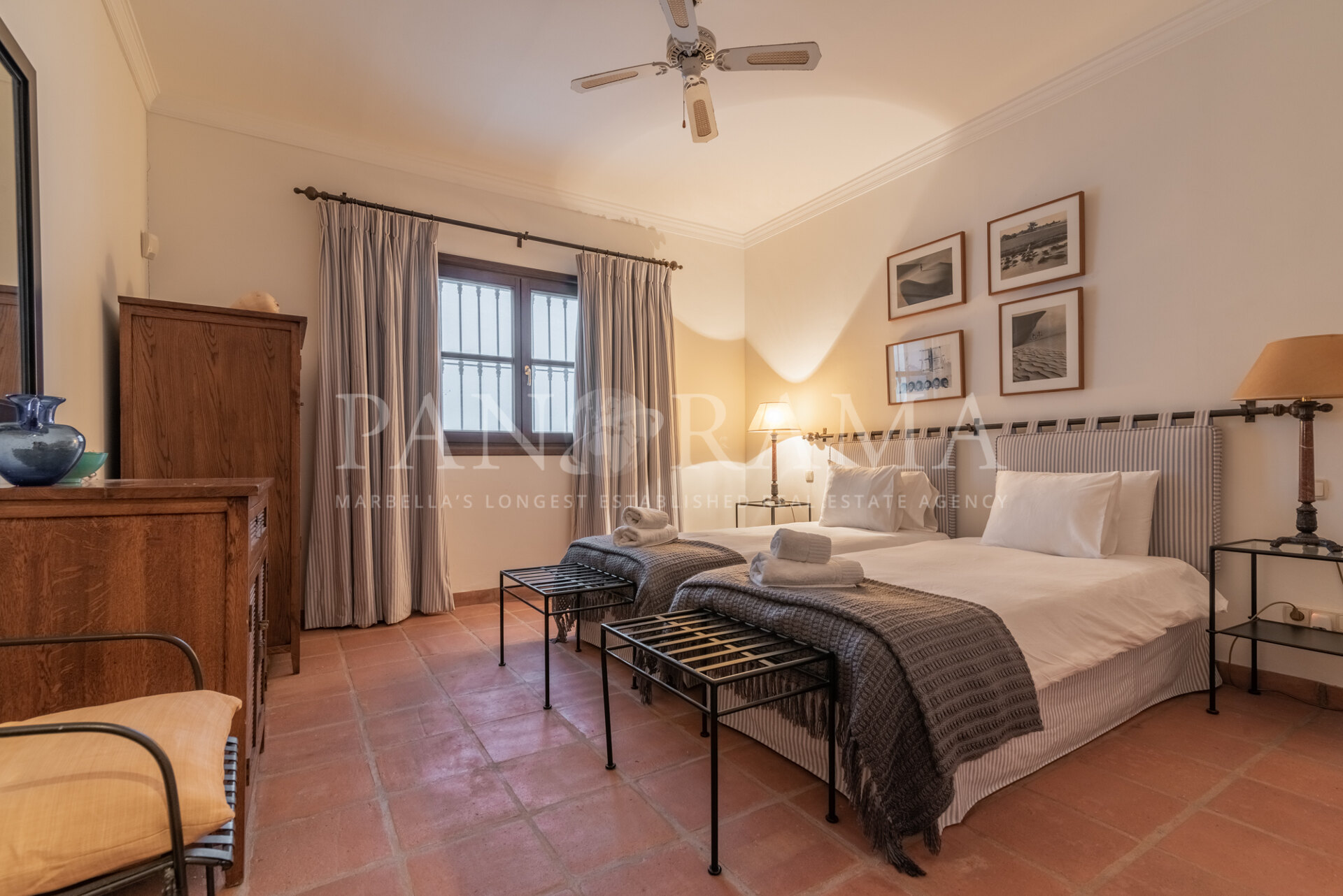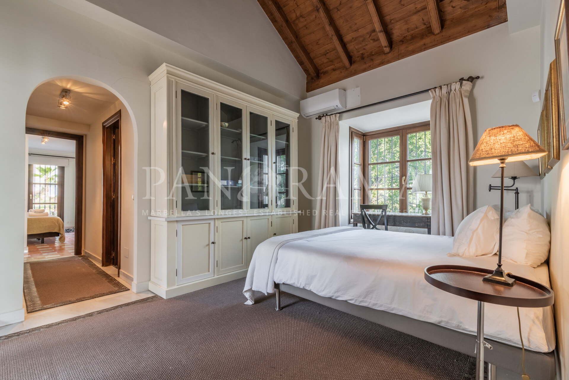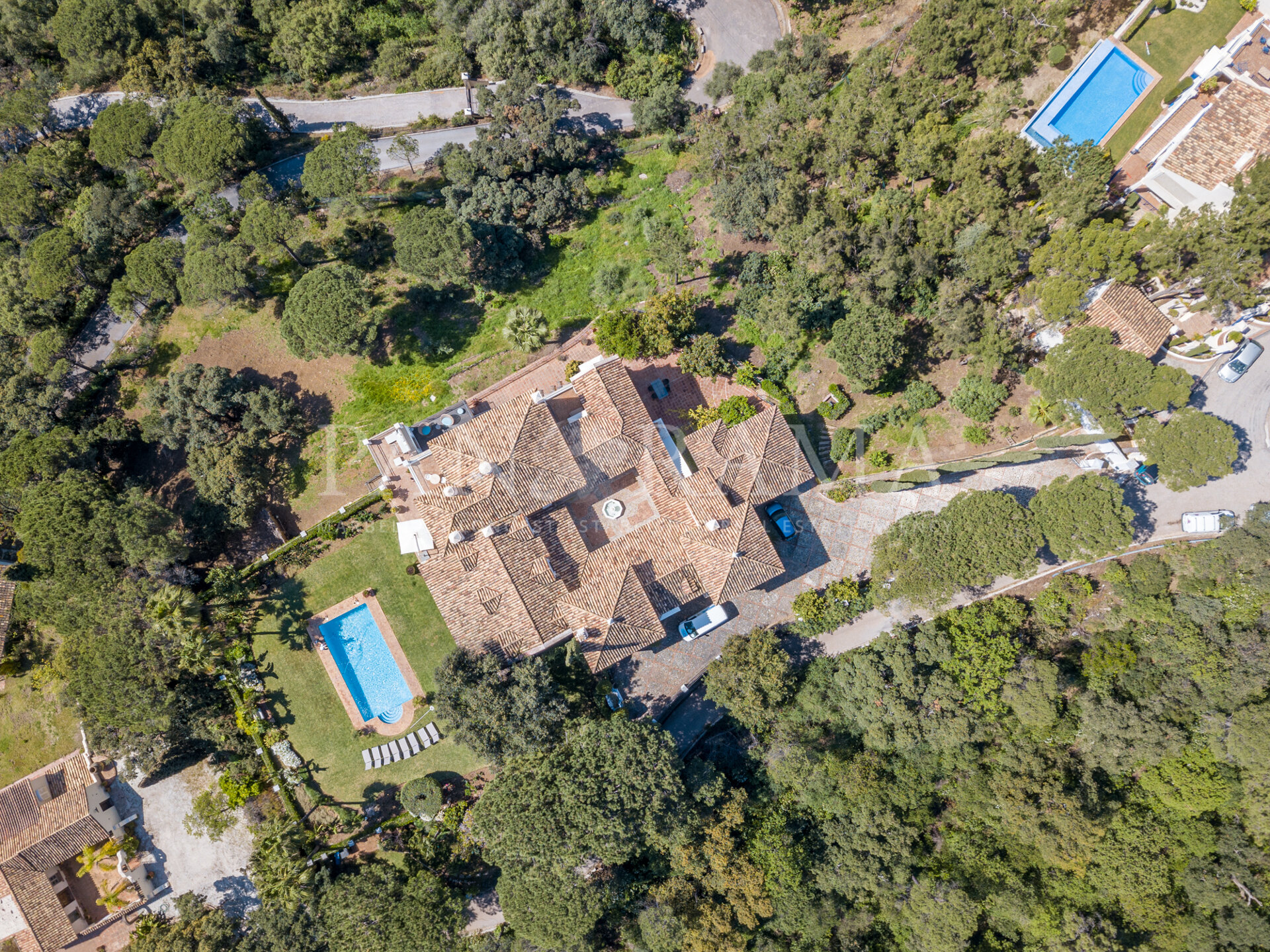 Esta es una oportunidad única para poseer una propiedad extraordinaria en la prestigiosa zona de El Madroñal, ubicada en una comunidad cerrada y altamente exclusiva. Situada a poca distancia de la puerta de seguridad principal, esta magnífica finca se alza en un entorno sereno rodeado de pinos y encinas que bordean la entrada privada y majestuosa. Desde el momento en que entras, el carácter único de la propiedad se hace evidente, con detalles distintivos como techos altos con vigas de madera, una amplia sala de estar y una de las suites principales más grandes disponibles en el mercado.