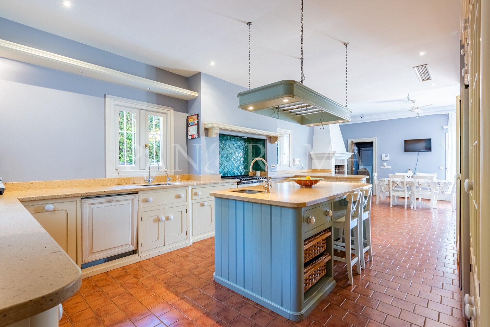 La casa principal ofrece un ambiente cálido y elegante con interiores espaciosos y características clásicas. El vestíbulo de entrada conduce a una gran sala de estar con chimenea y acceso a una terraza con vistas impresionantes. Justo al lado de la sala de estar hay un acogedor dormitorio actualmente utilizado como sala de televisión, con su propio baño y chimenea. En el otro lado, hay un gran comedor—creado al combinar dos habitaciones—también con chimenea y acceso a un comedor informal junto a la cocina. La cocina es espaciosa e incluye una despensa y un espacio para comer. Desde aquí, se puede acceder al apartamento del personal, que cuenta con su propia sala de estar, cocina, dormitorio y baño. También hay una sala de billar junto a la casa para relajarse o entretenerse.