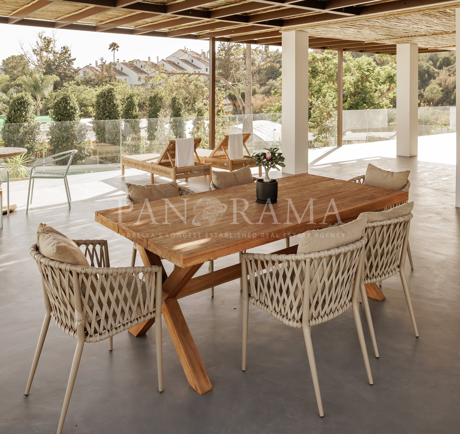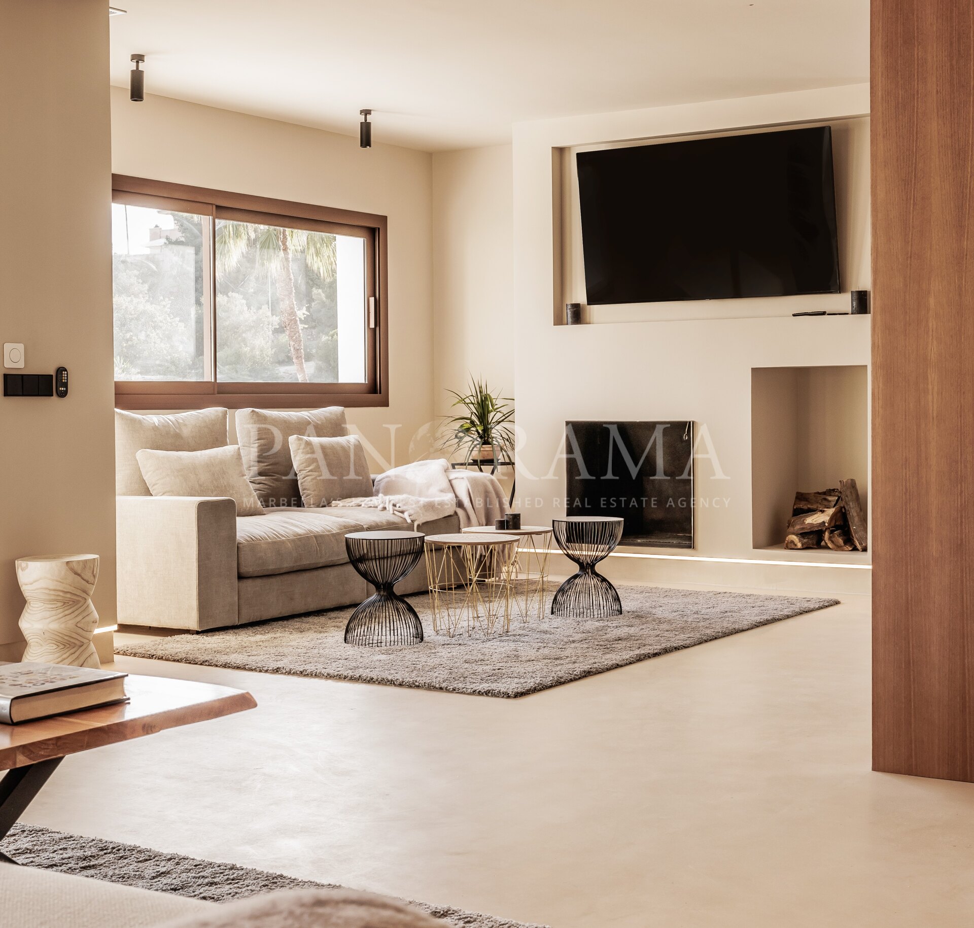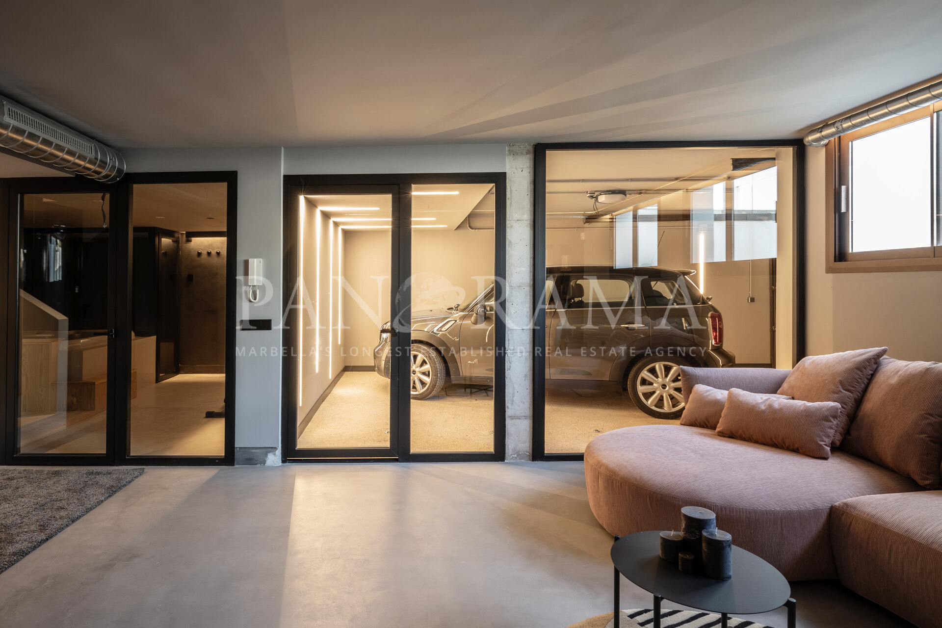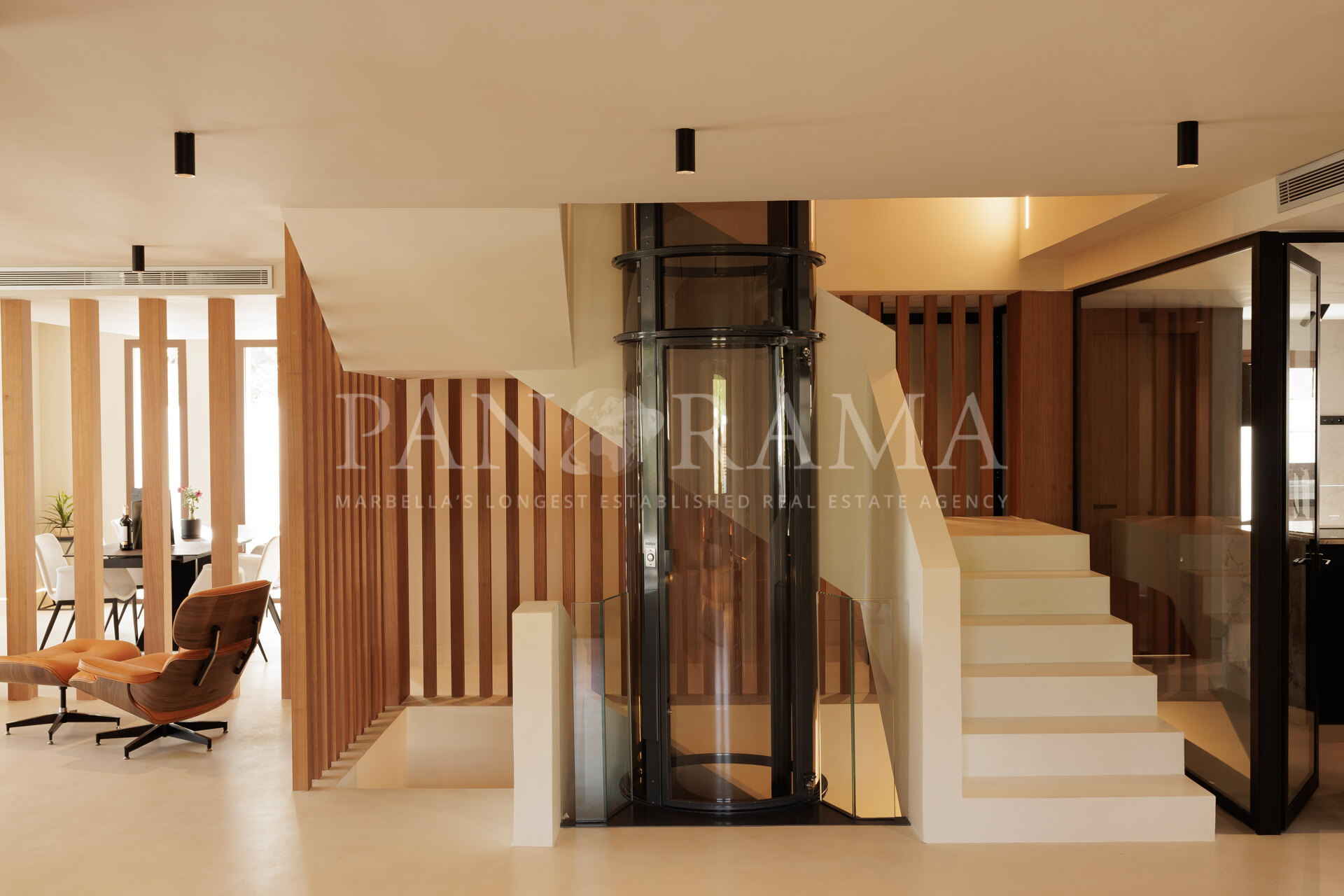 Esta villa está equipada con lo último en tecnología residencial, incluyendo un sistema de calefacción y refrigeración por suelo radiante, aire acondicionado de control individual tipo Airzone, electrodomésticos de cocina de alta gama, sistema domótico avanzado, cargador para vehículos eléctricos, puertas de vidrio automatizadas y un ascensor panorámico privado. El diseño arquitectónico combina un estilo moderno con toques sofisticados boho-chic.