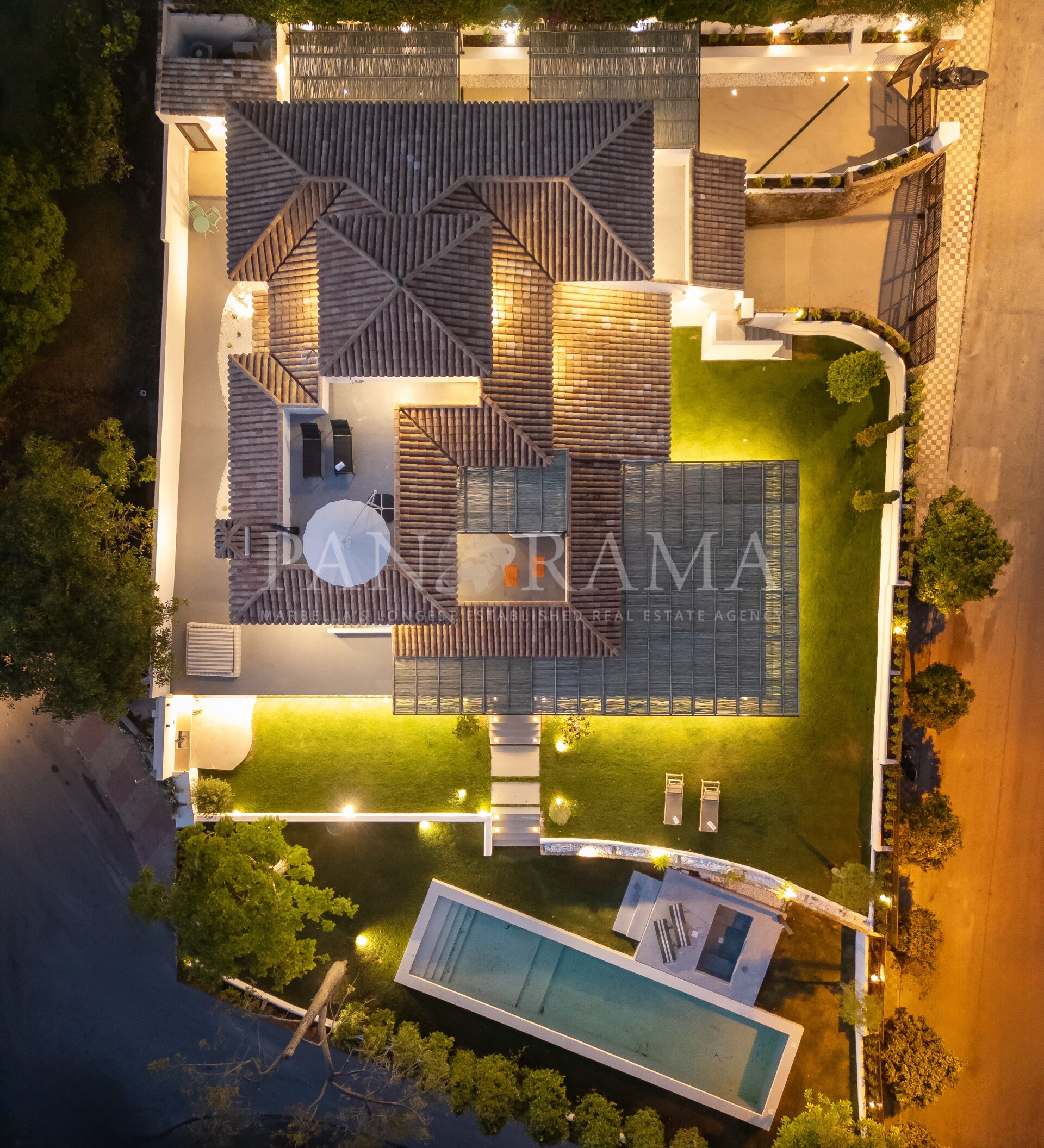 La villa está distribuida en tres niveles principales, además de una terraza solárium en el techo, todos conectados por una elegante escalera y un ascensor privado de última generación. En la planta baja, hay una sala de estar de concepto abierto, hábilmente dividida en varias áreas de uso, como una zona de relajación chill-out, una acogedora área con chimenea y un gran comedor. Desde la terraza principal se puede disfrutar de vistas al cuidado jardín en terrazas y una gran piscina climatizada con sistema de agua salina. Este nivel también incluye una cocina moderna equipada con electrodomésticos de alta gama y dos dormitorios con baños en suite. En el exterior, hay una práctica área de lavandería separada con un aseo de cortesía.