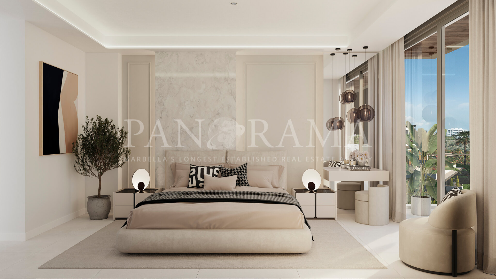 Situada entre colinas a las afueras de Marbella y acariciada por la brisa marina y el cielo infinito, esta nueva urbanización ha sido diseñada para personas que quieren disfrutar del ocio, el deporte, el aire libre y la tranquilidad. Por eso está situada muy cerca de Marbella pero lejos de las zonas más ruidosas y animadas. Su proximidad a la playa y a prestigiosos campos de golf lo convierten en el centro de atención de quienes buscan un nuevo hogar en la Costa del Sol. Un total de 104 viviendas de tres y cuatro dormitorios superarán sus expectativas y cumplirán su sueño de vivir el mejor momento en la mejor ubicación posible. Diseño contemporáneo y altas calidades en una urbanización cerrada de primera línea de golf que ofrece total privacidad y zonas ajardinadas pensadas para el descanso familiar bajo pinos centenarios. La comunidad contará con dos grandes piscinas con solárium donde disfrutar de las largas horas de sol que ofrece Marbella. Las zonas abiertas de salón y cocina, y los ventanales en dormitorios y salón aprovechan la luz natural a cualquier hora del día. Las espectaculares terrazas son perfectas para comer al aire libre y relajarse en la mejor compañía. Las cocinas se han diseñado como parte integrante de la zona de estar para crear un espacio amplio y luminoso que pueda utilizarse durante todo el día. Las características técnicas reflejan la calidad que cabe esperar de un proyecto de tan alta gama, con encimeras de cuarzo, electrodomésticos empotrados y luces LED integradas para aportar calidez y sofisticación. En los baños, la elegancia de los azulejos de porcelana de gran formato refleja el compromiso general con la calidad y el diseño.