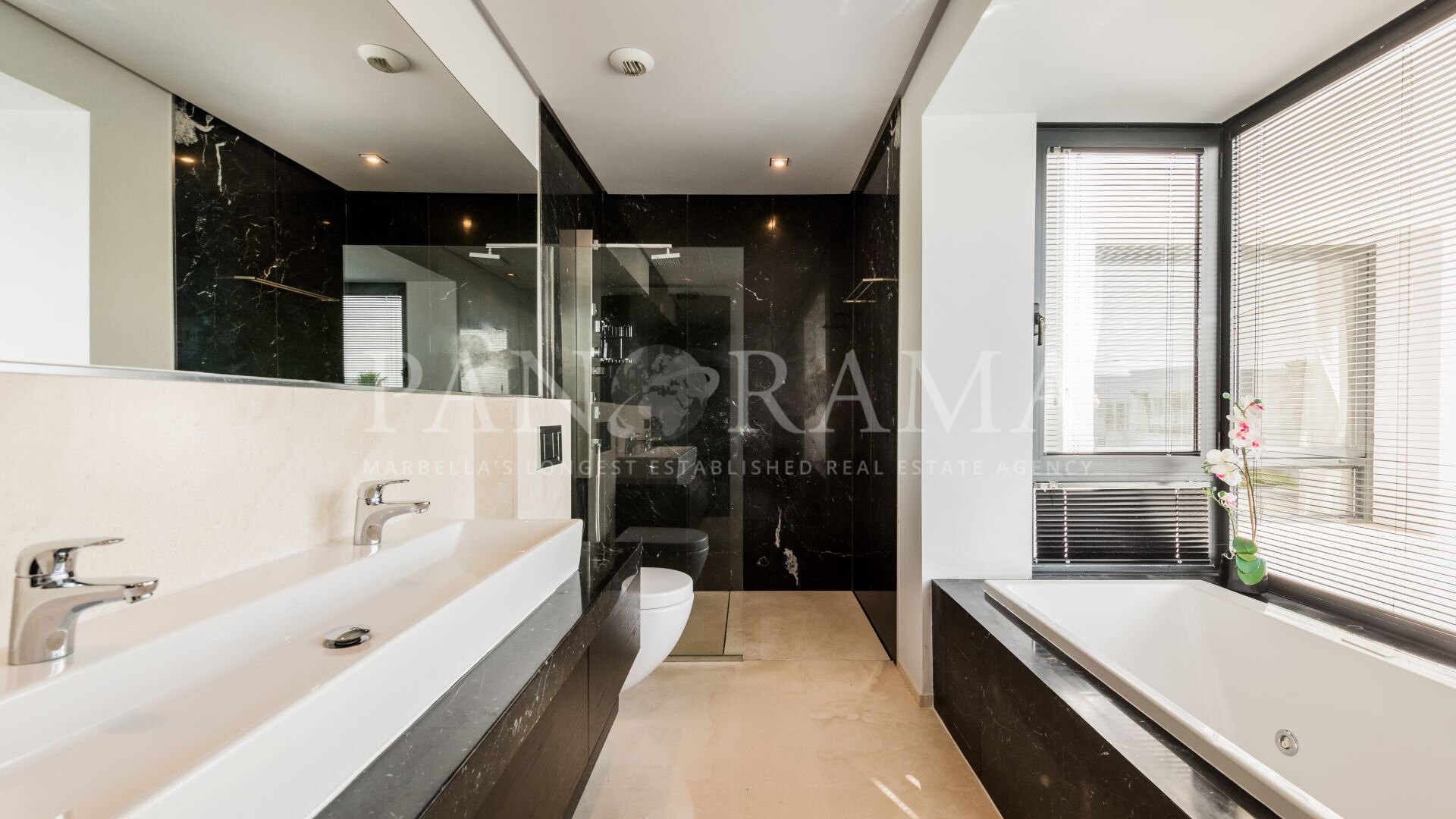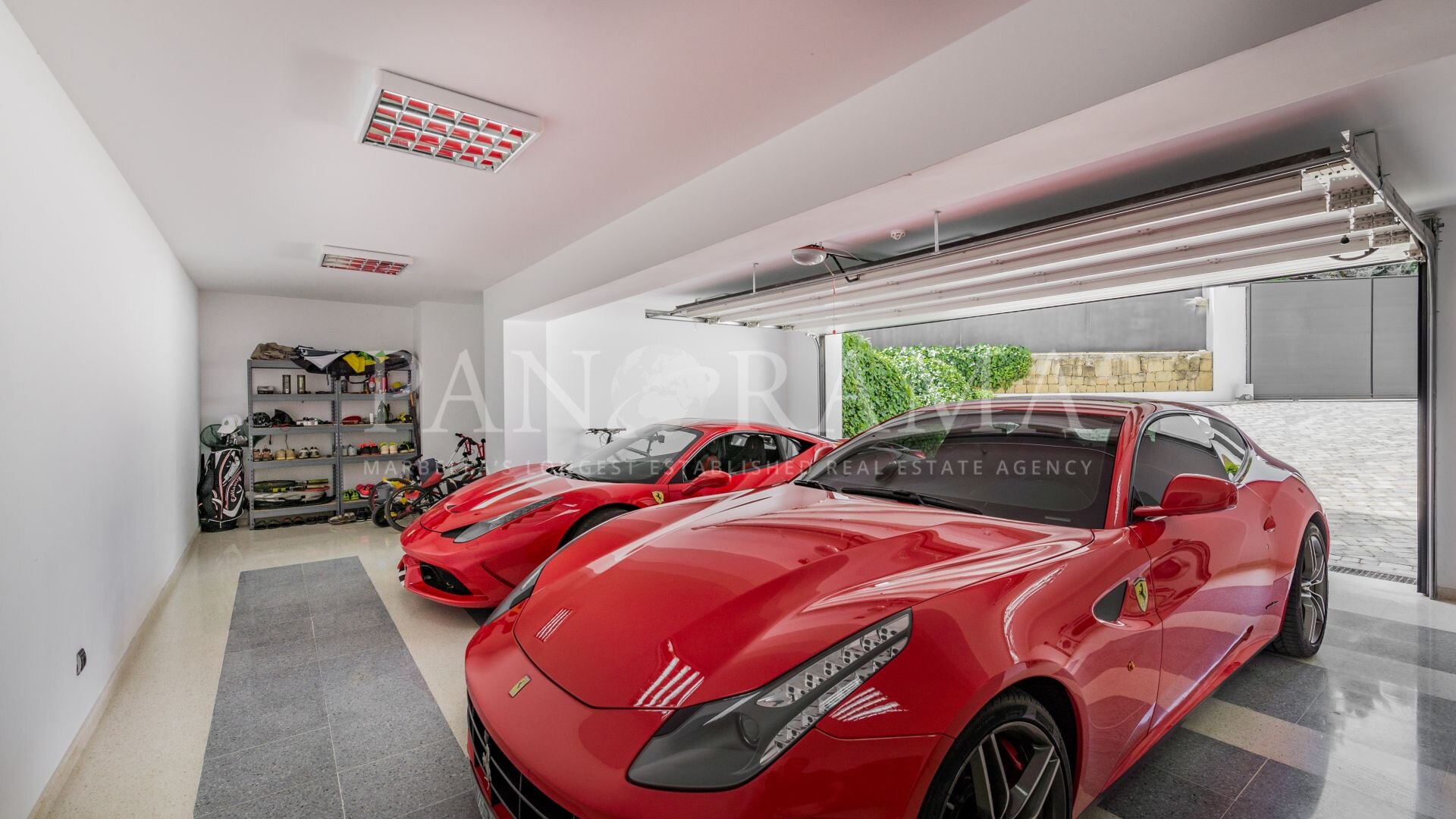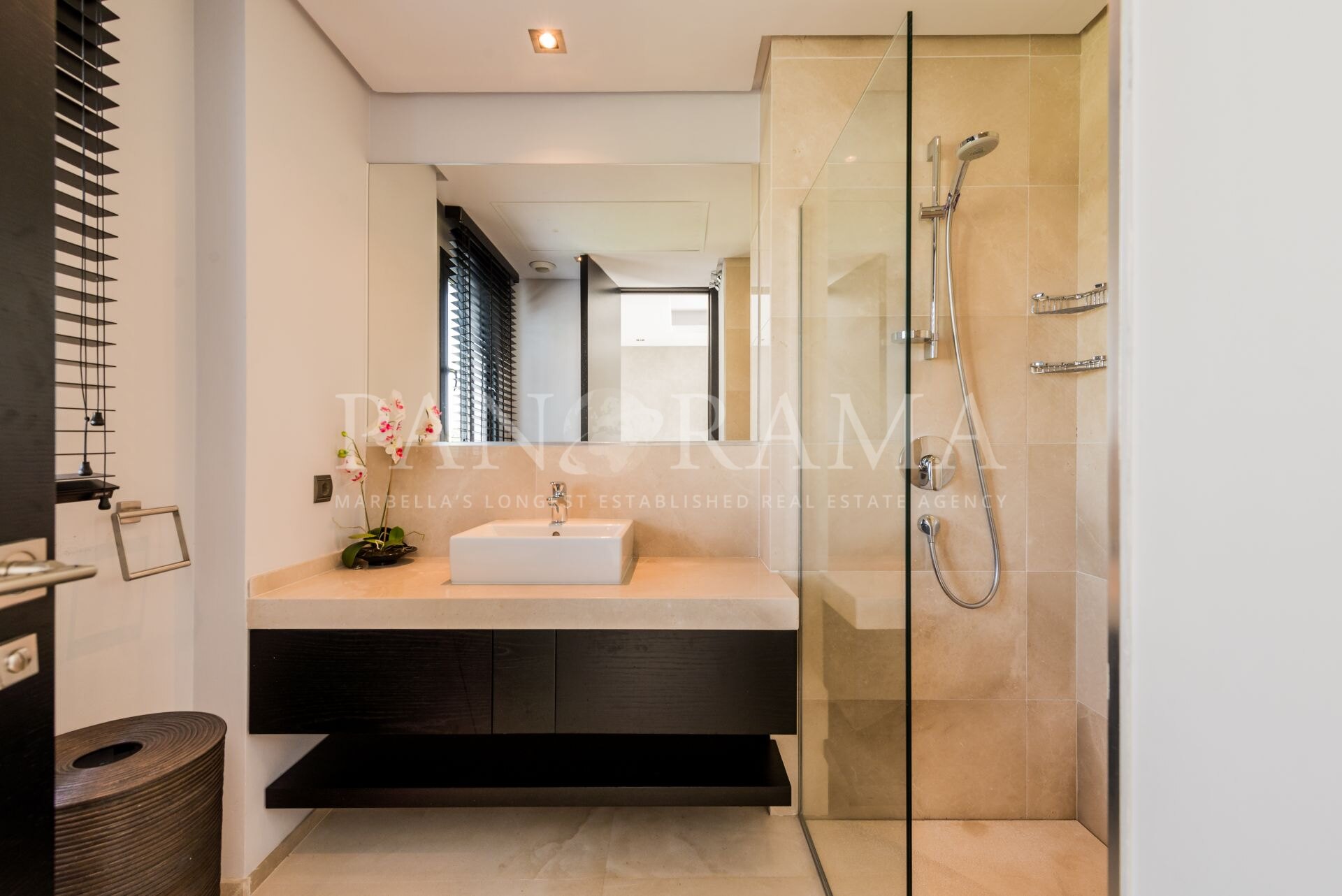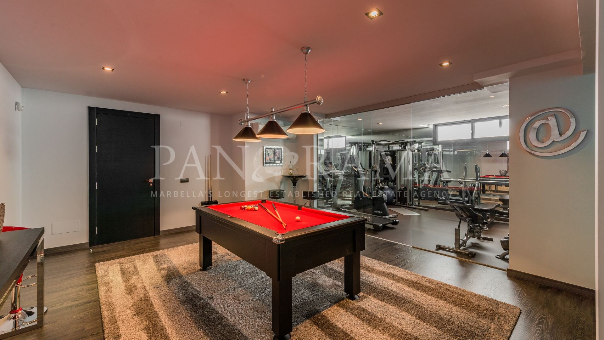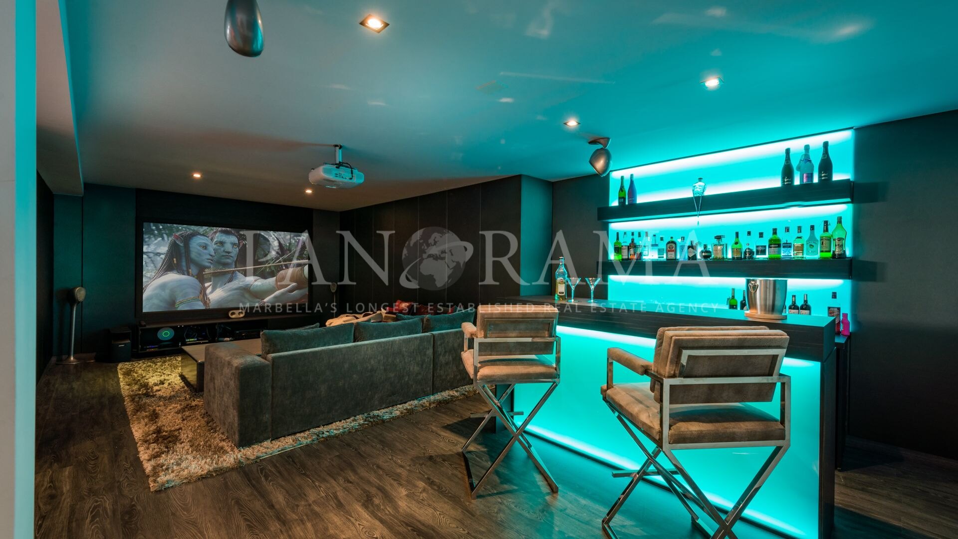 Elegante villa de estilo contemporáneo situada en un exclusivo enclave residencial cerrado con seguridad las 24 horas, a sólo diez minutos en coche del animado puerto deportivo de Puerto Banús y del encantador casco antiguo de Marbella. La propiedad tiene lujosas y amplias zonas de estar y un comedor interior, acogedoras terrazas y jardines meticulosamente cuidados, con una piscina climatizada de agua salada y una sofisticada zona de barbacoa. A través de un acogedor hall de entrada adornado con un aseo de invitados, encontrará una cocina moderna y totalmente equipada perfectamente integrada con el salón, decorado con muebles de lujo. En este nivel, un dormitorio de invitados de generosas proporciones, con una terraza privada con vistas al jardín. En la primera planta, tres opulentos dormitorios, cada uno con su propio cuarto de baño. El dormitorio principal, en particular, cuenta con una terraza cubierta privada con vistas al mar. Para disfrutar al máximo de la relajación y las vistas panorámicas, suba a la terraza de la azotea, meticulosamente diseñada con una elegante zona chill-out, con un cómodo salón y un Jacuzzi exterior de generosas dimensiones. En el nivel inferior de la propiedad encontrará una gran variedad de instalaciones de ocio y entretenimiento, como un sofisticado bar, una sala de cine/zona de juegos y un gimnasio bien equipado. Esta planta también alberga un amplio dormitorio con su propio cuarto de baño en-suite, proporcionando un elegante refugio tanto para la familia como para los invitados. Esta residencia meticulosamente diseñada combina a la perfección la elegancia con las comodidades modernas, ofreciendo una experiencia de vida verdaderamente refinada en un exclusivo paraíso mediterráneo.
