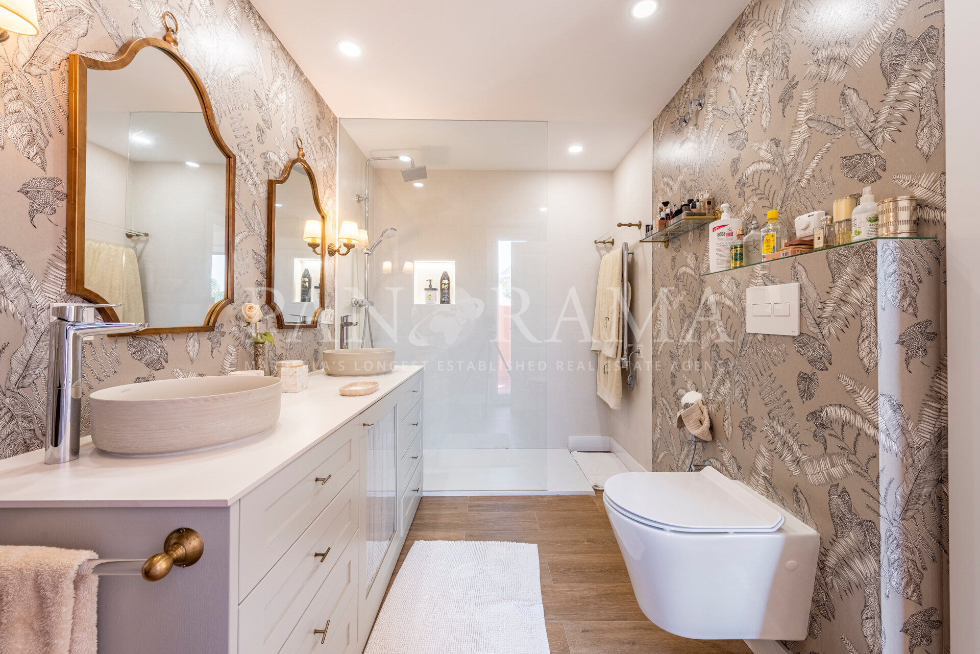 La planta baja de la villa añade aún más versatilidad, ofreciendo dos dormitorios adicionales que comparten un baño, una práctica lavandería, aparcamiento subterráneo seguro para dos coches y el punto culminante de la planta: una piscina cubierta privada con sauna, creando un spa personal para disfrutar durante todo el año.