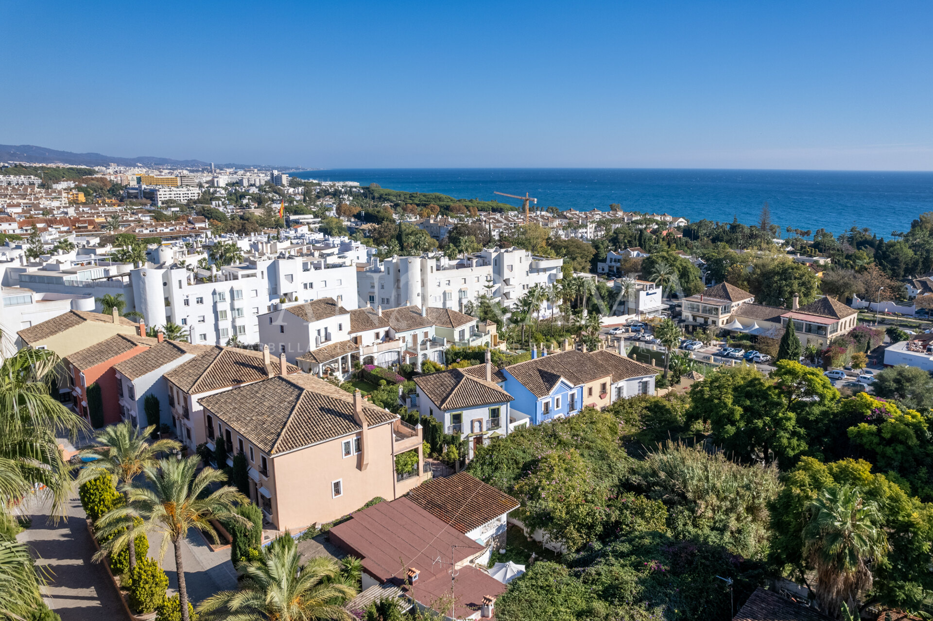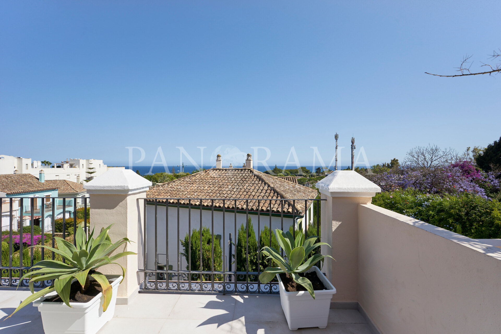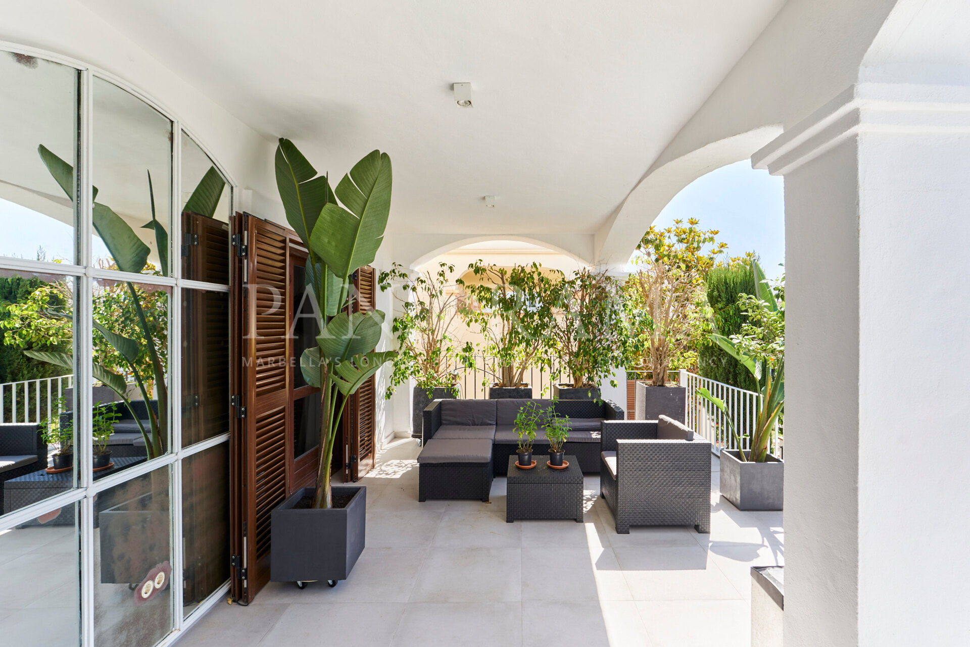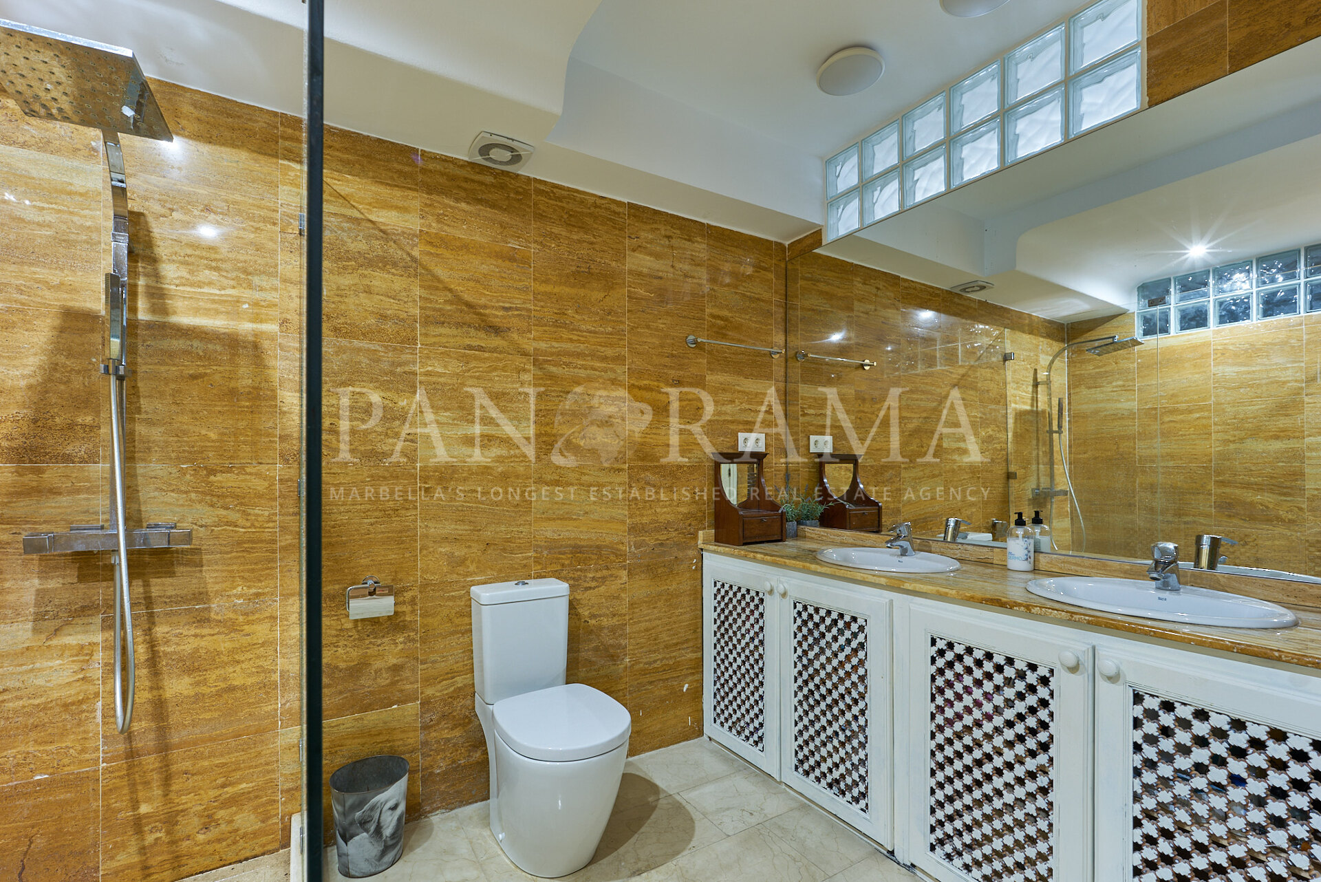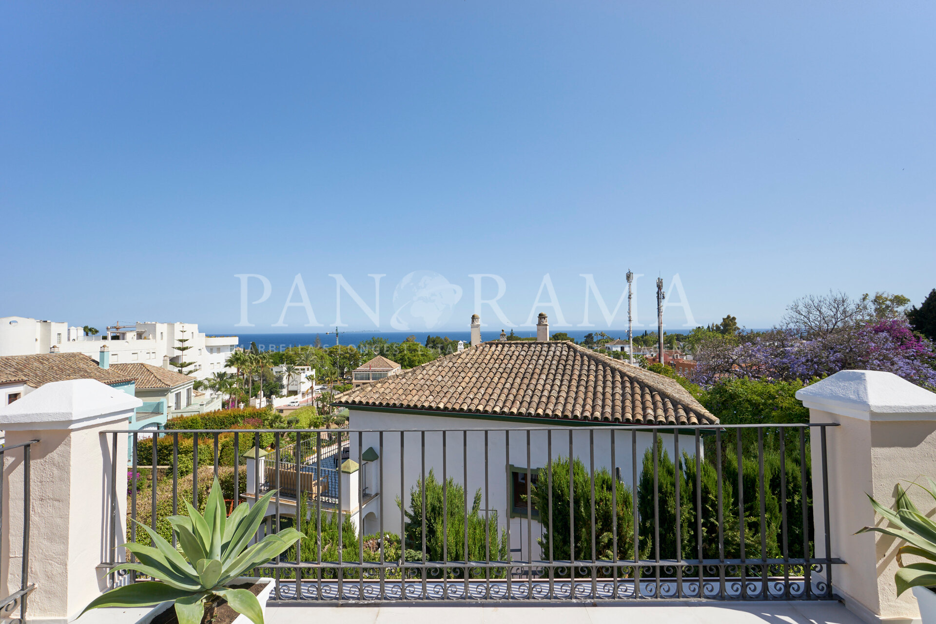 Chalet pareado de estilo andaluz ubicado en la prestigiosa zona residencial de la Milla de Oro de Marbella. Se trata de una de las propiedades de mayor tamaño dentro del exclusivo complejo en el que se encuentra, ocupando una privilegiada posición en la esquina oeste, lo que garantiza un entorno de máxima tranquilidad, privacidad y unas impresionantes vistas panorámicas al mar Mediterráneo.
