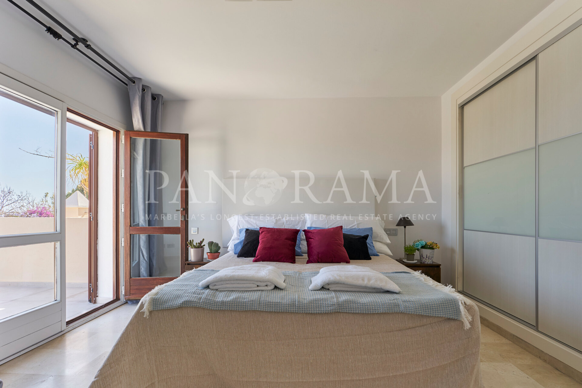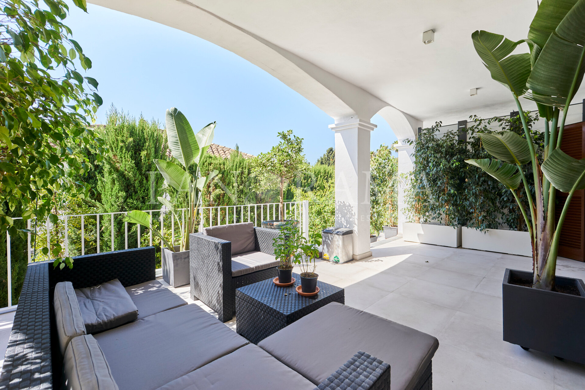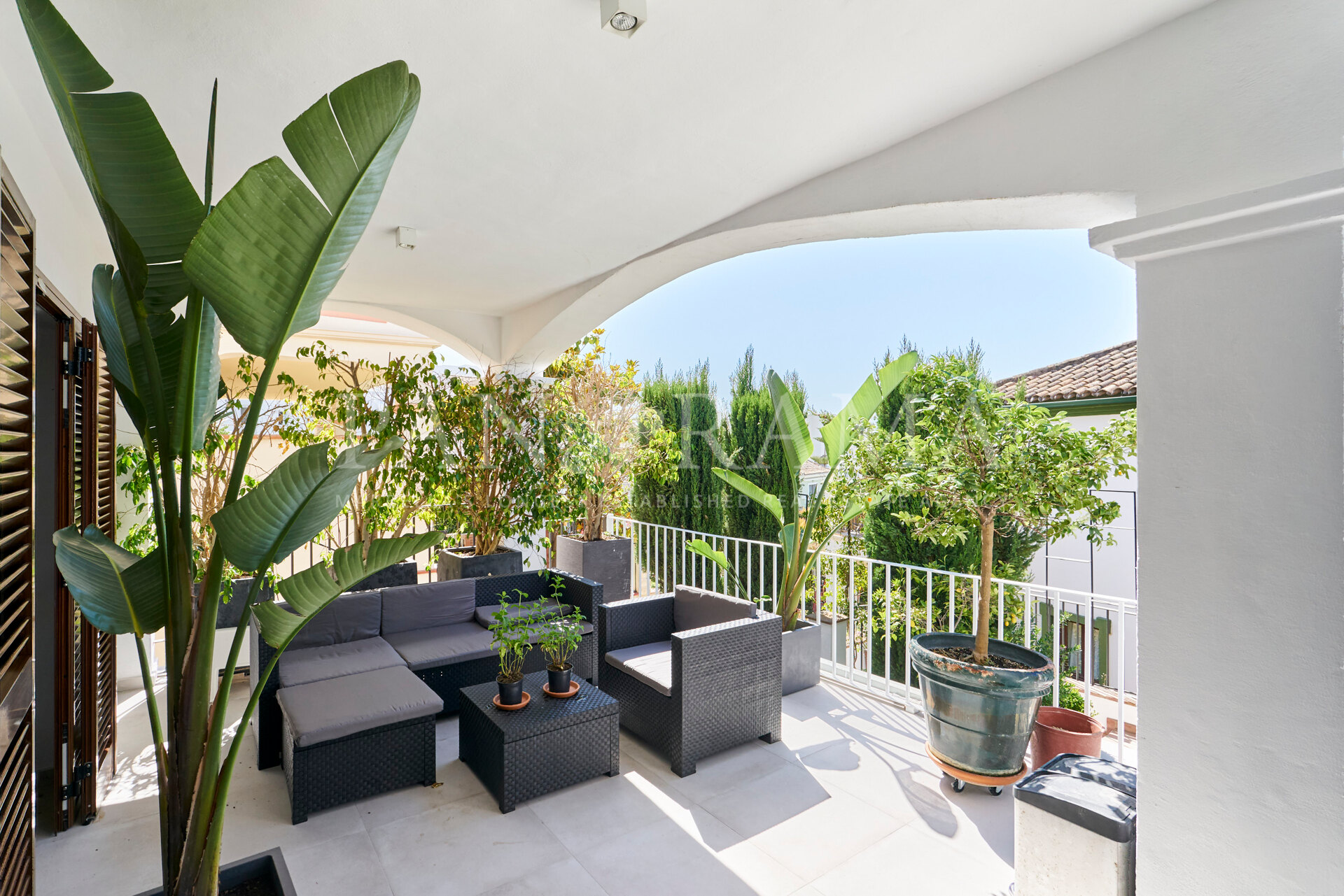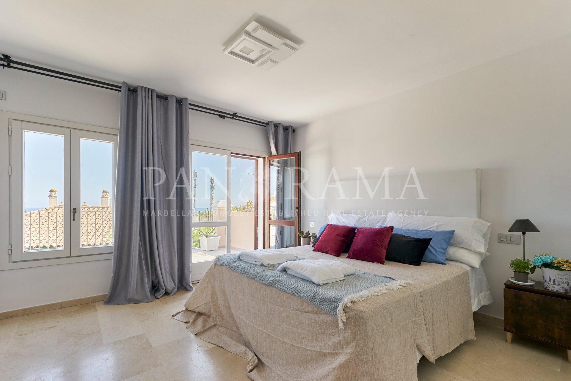 Chalet pareado de estilo andaluz ubicado en la prestigiosa zona residencial de la Milla de Oro de Marbella. Se trata de una de las propiedades de mayor tamaño dentro del exclusivo complejo en el que se encuentra, ocupando una privilegiada posición en la esquina oeste, lo que garantiza un entorno de máxima tranquilidad, privacidad y unas impresionantes vistas panorámicas al mar Mediterráneo.