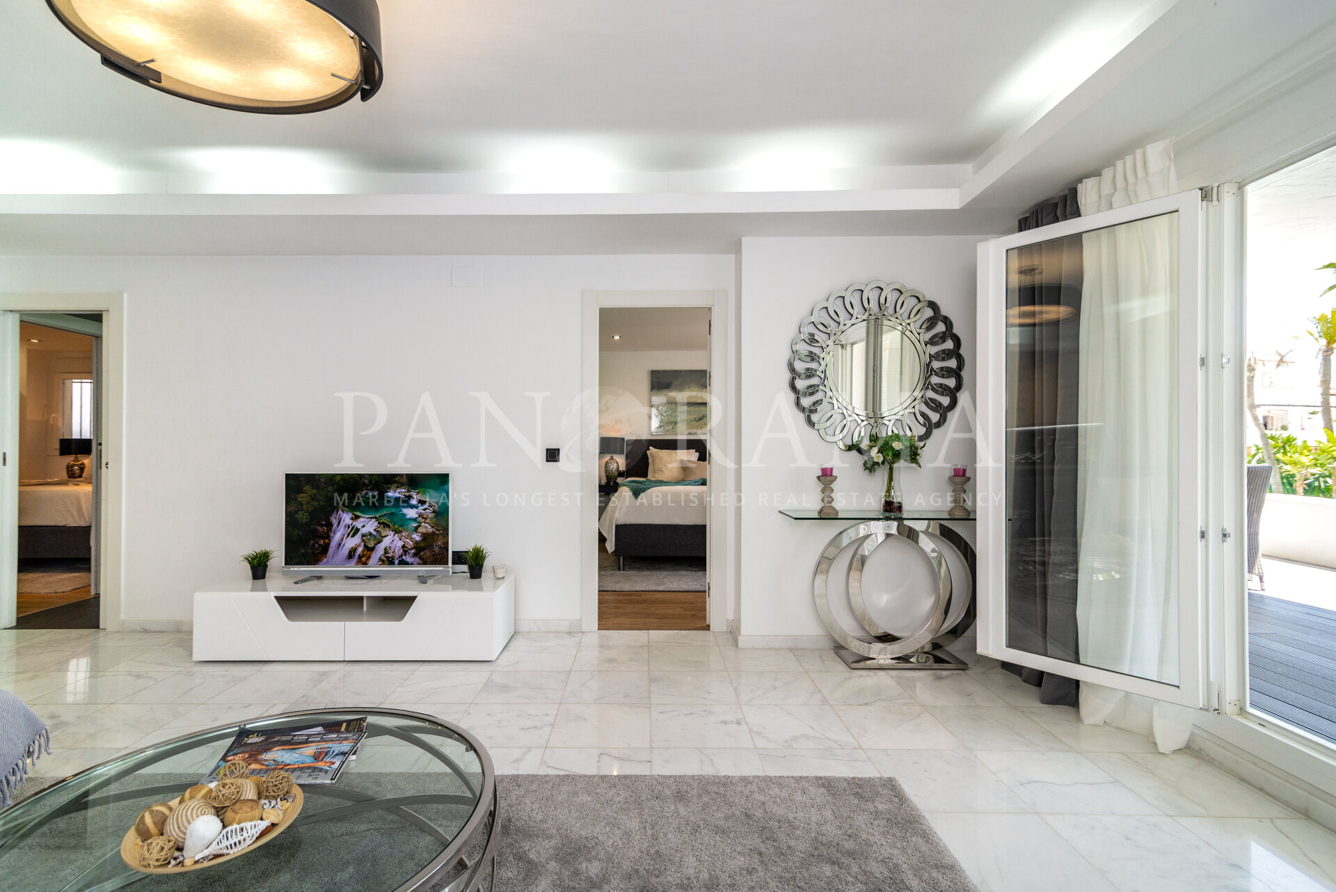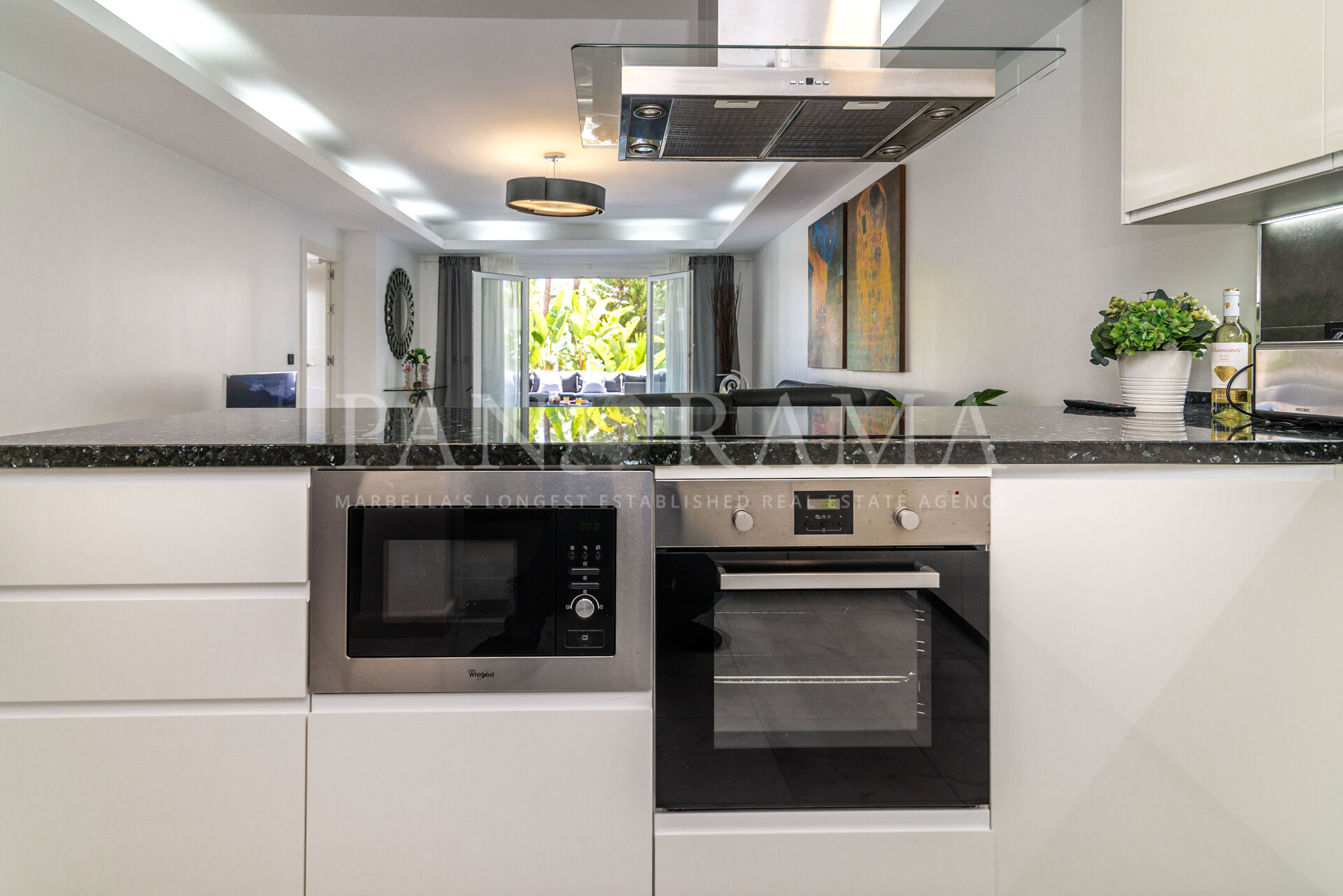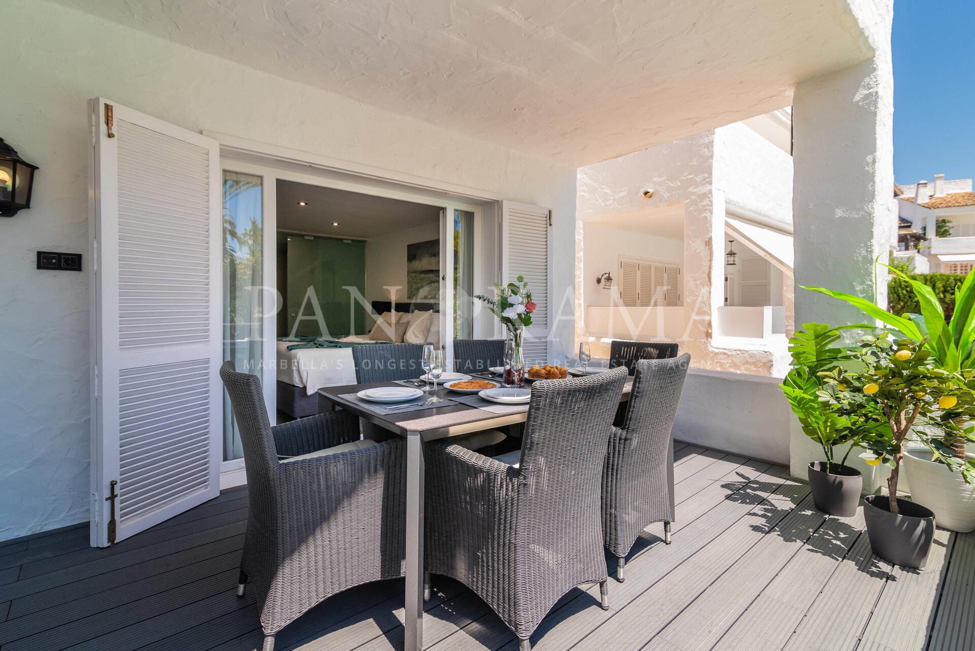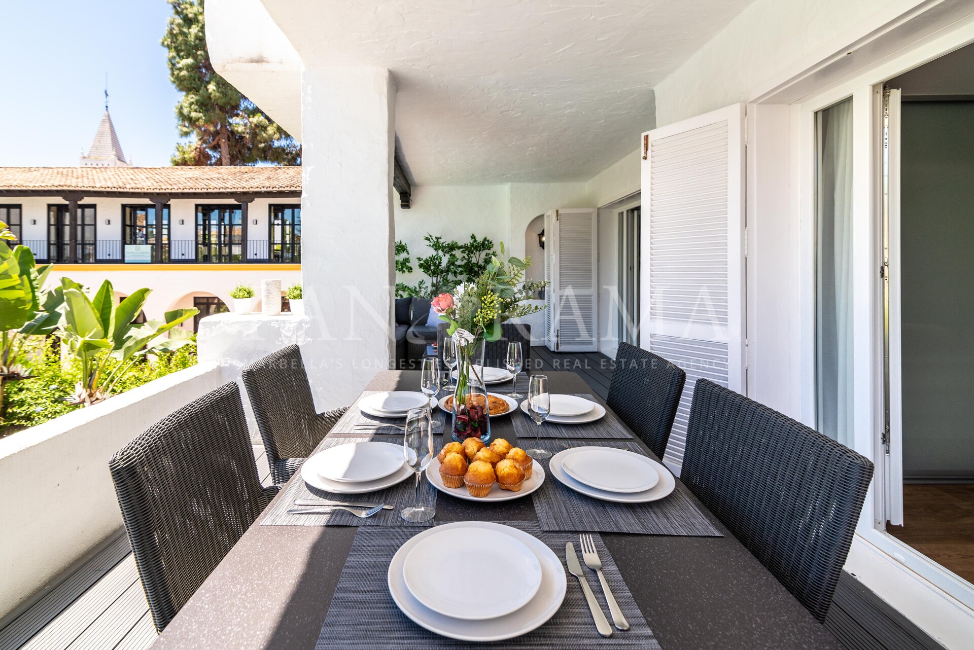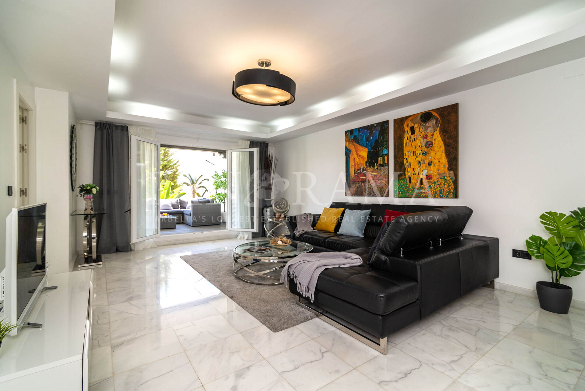 Apartamento en planta baja recientemente reformado, con una ubicación privilegiada dentro del famoso complejo Puente Romano Resort, la urbanización más exclusiva de la Milla de Oro de Marbella.