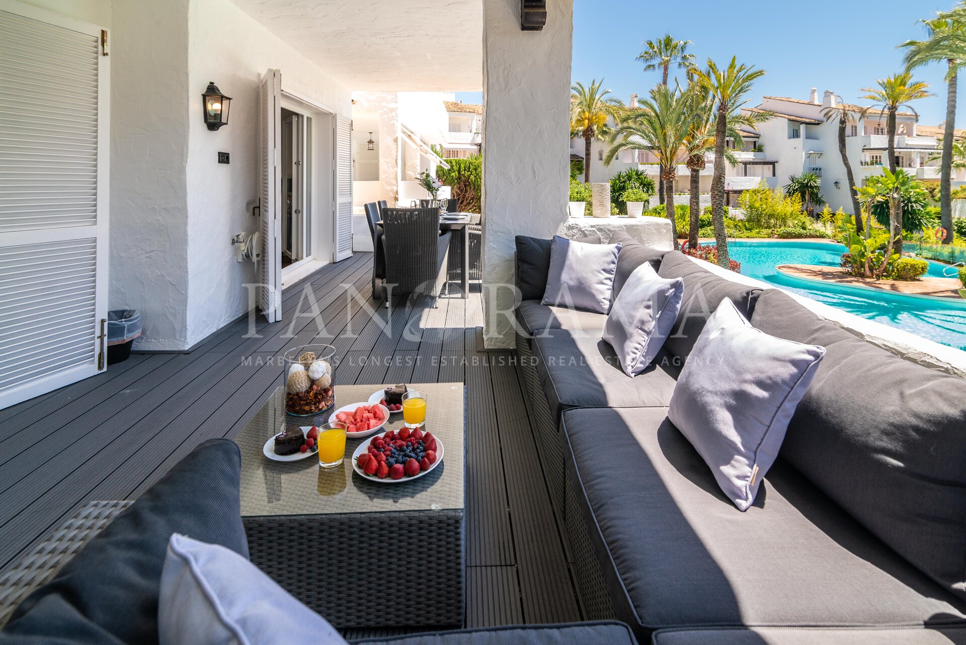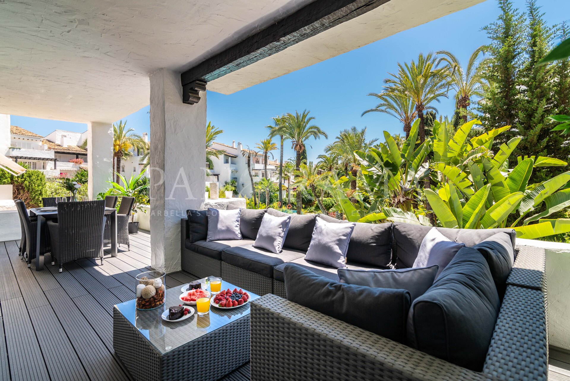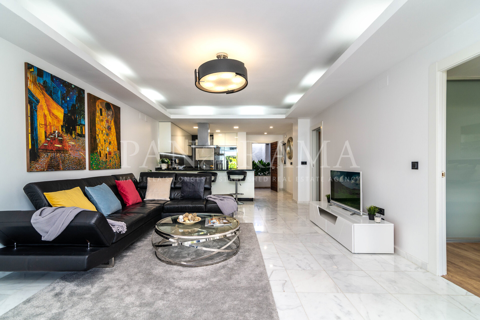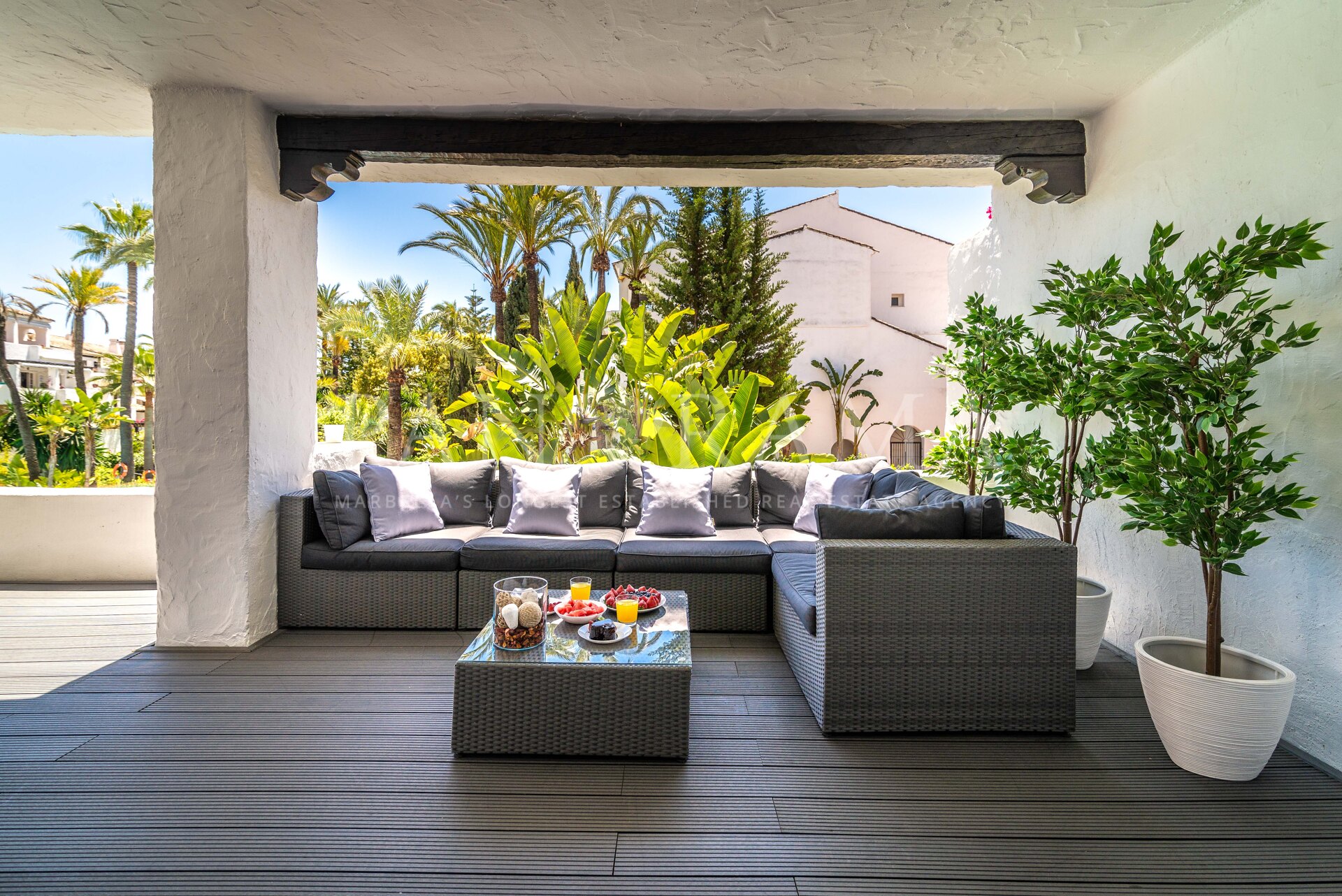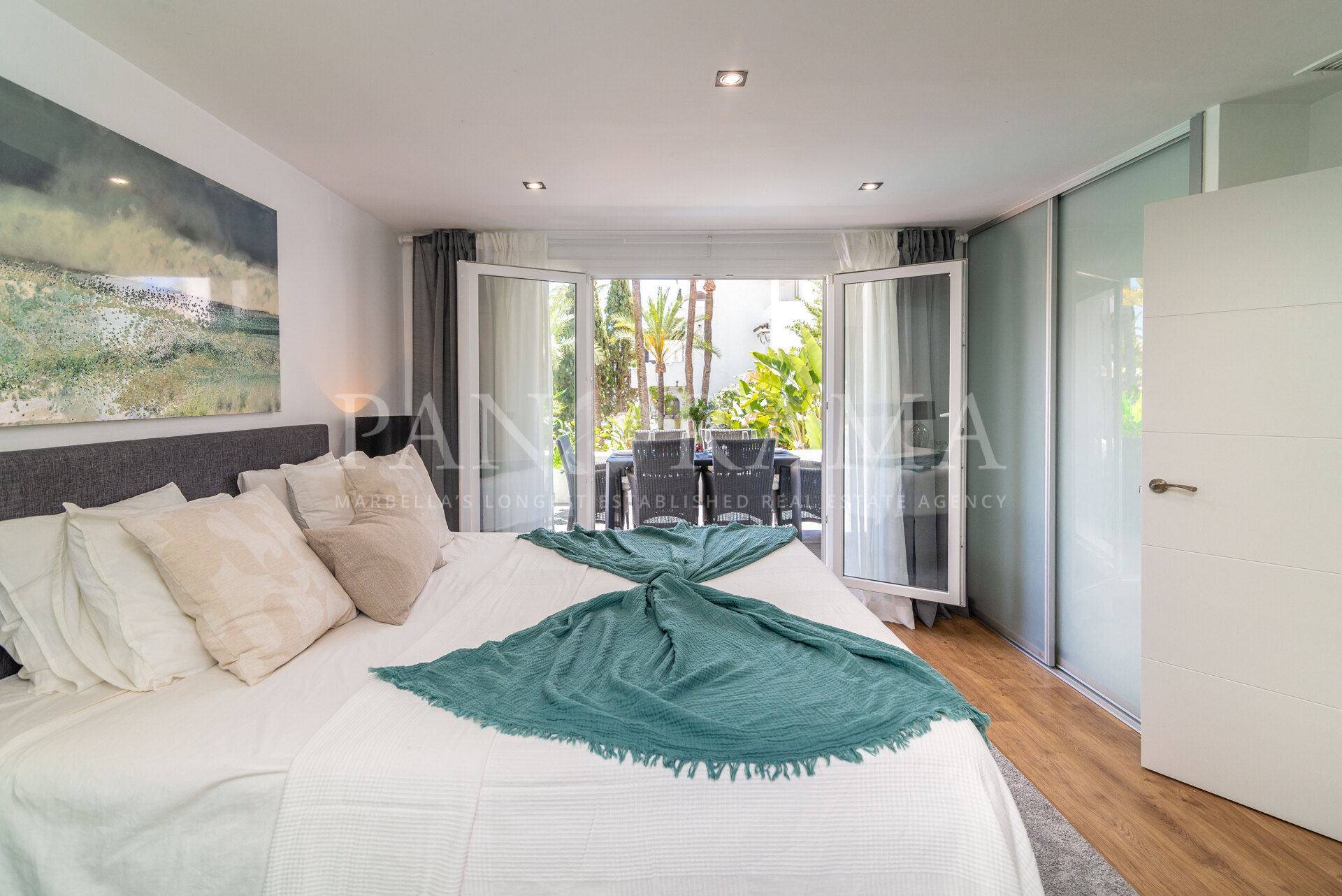 Apartamento en planta baja recientemente reformado, con una ubicación privilegiada dentro del famoso complejo Puente Romano Resort, la urbanización más exclusiva de la Milla de Oro de Marbella.
