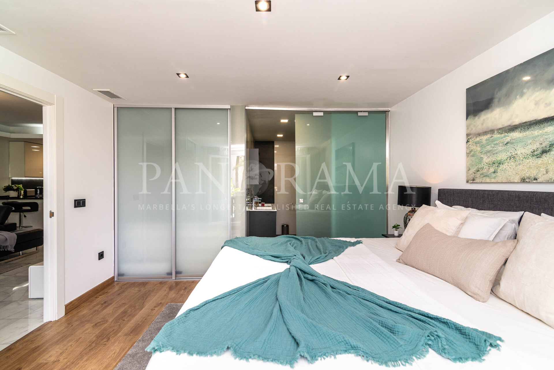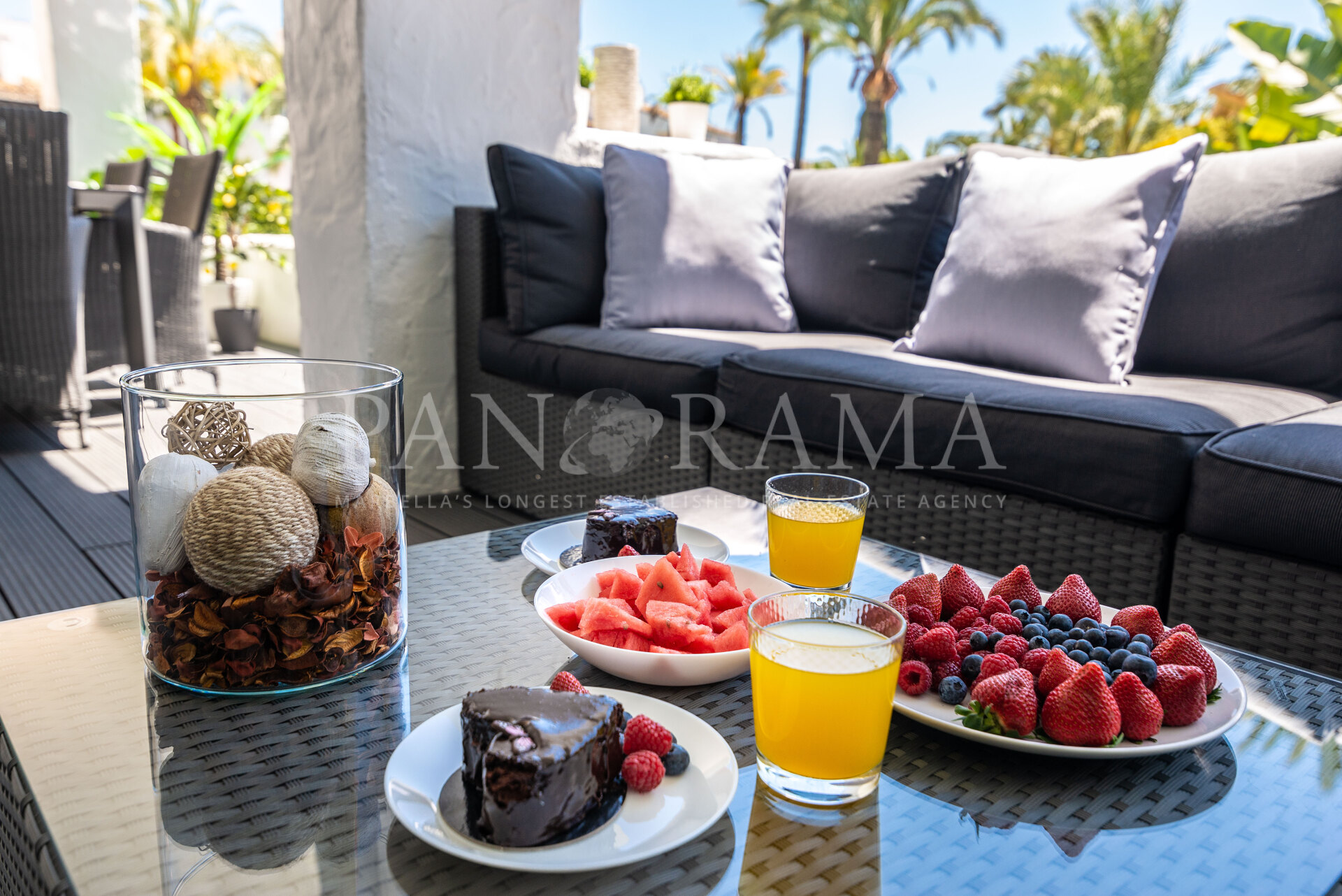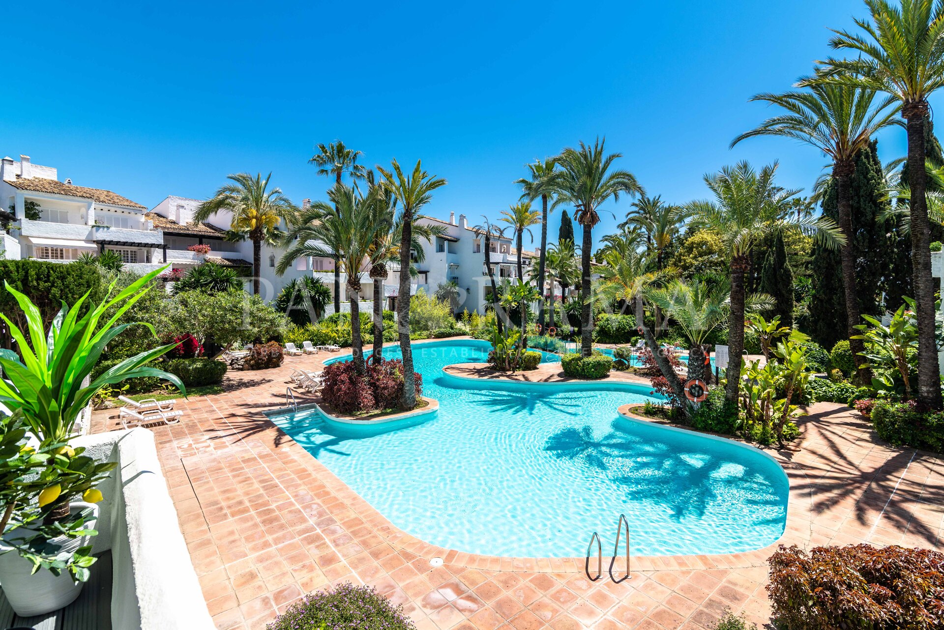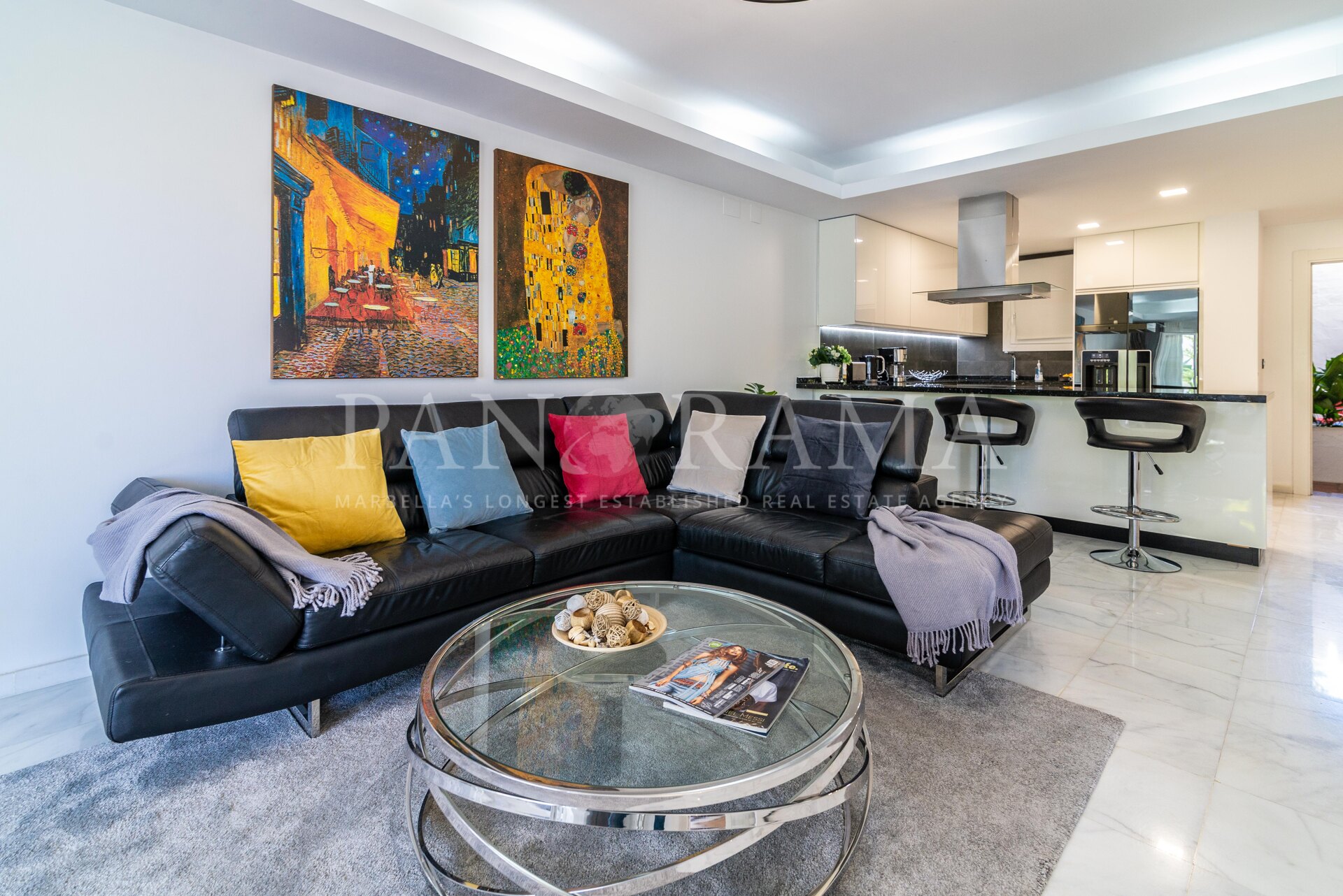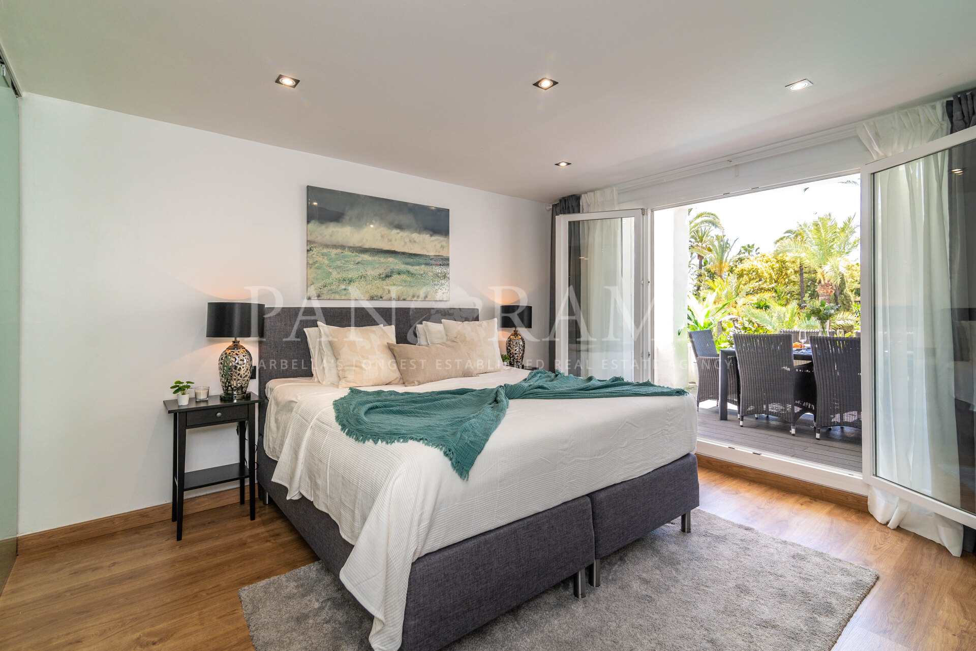 Apartamento en planta baja recientemente reformado, con una ubicación privilegiada dentro del famoso complejo Puente Romano Resort, la urbanización más exclusiva de la Milla de Oro de Marbella.