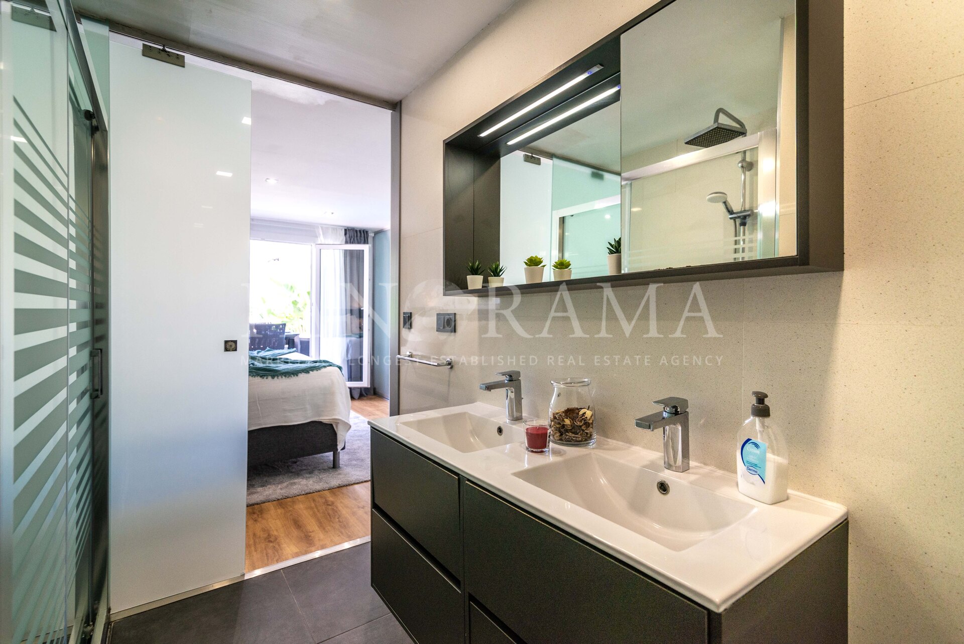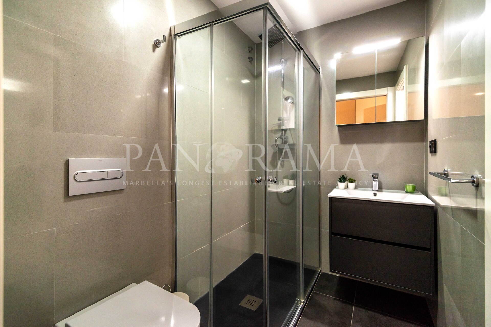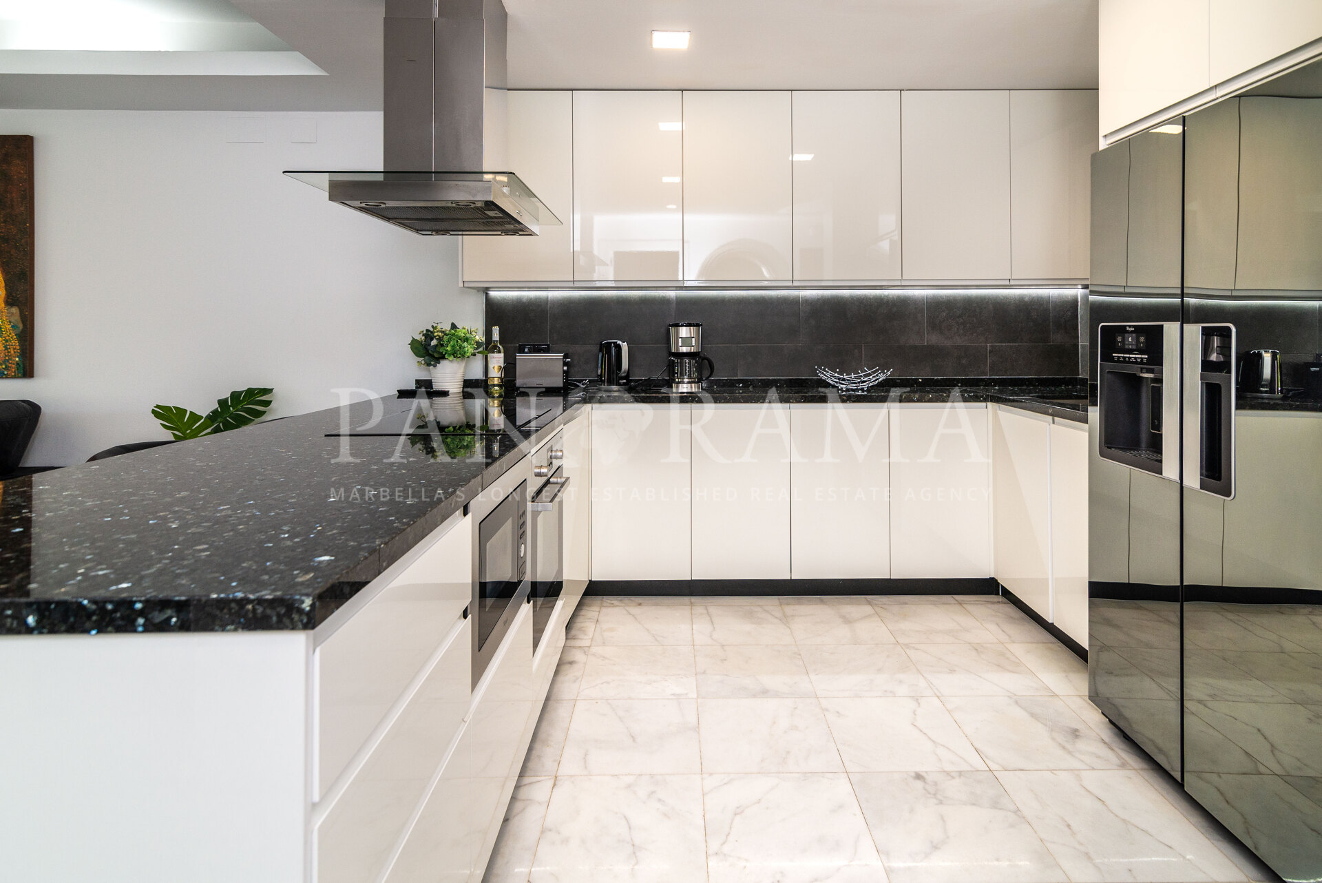 Al entrar en la vivienda los espacios de estar, el salon y la cocina son de concepto abierto, lo que permite un flujo inigualable entre los espacios. La cocina a medida es totalmente equipada y cuenta con una isla de mármol. La sala de estar impresiona por su amplitud, con meticulosa decoración, proporcionando colores que crean comodidad y sofisticación. Los 2 dormitorios cuentan con suelo de madera, ambos con baño en suite y aire acondicionado independiente. Por ultimo, la perla de esta exclusiva propiedad, una amplia terraza que ofrece unas agradables vistas a la piscina del complejo y sus preciosos jardines maduros.