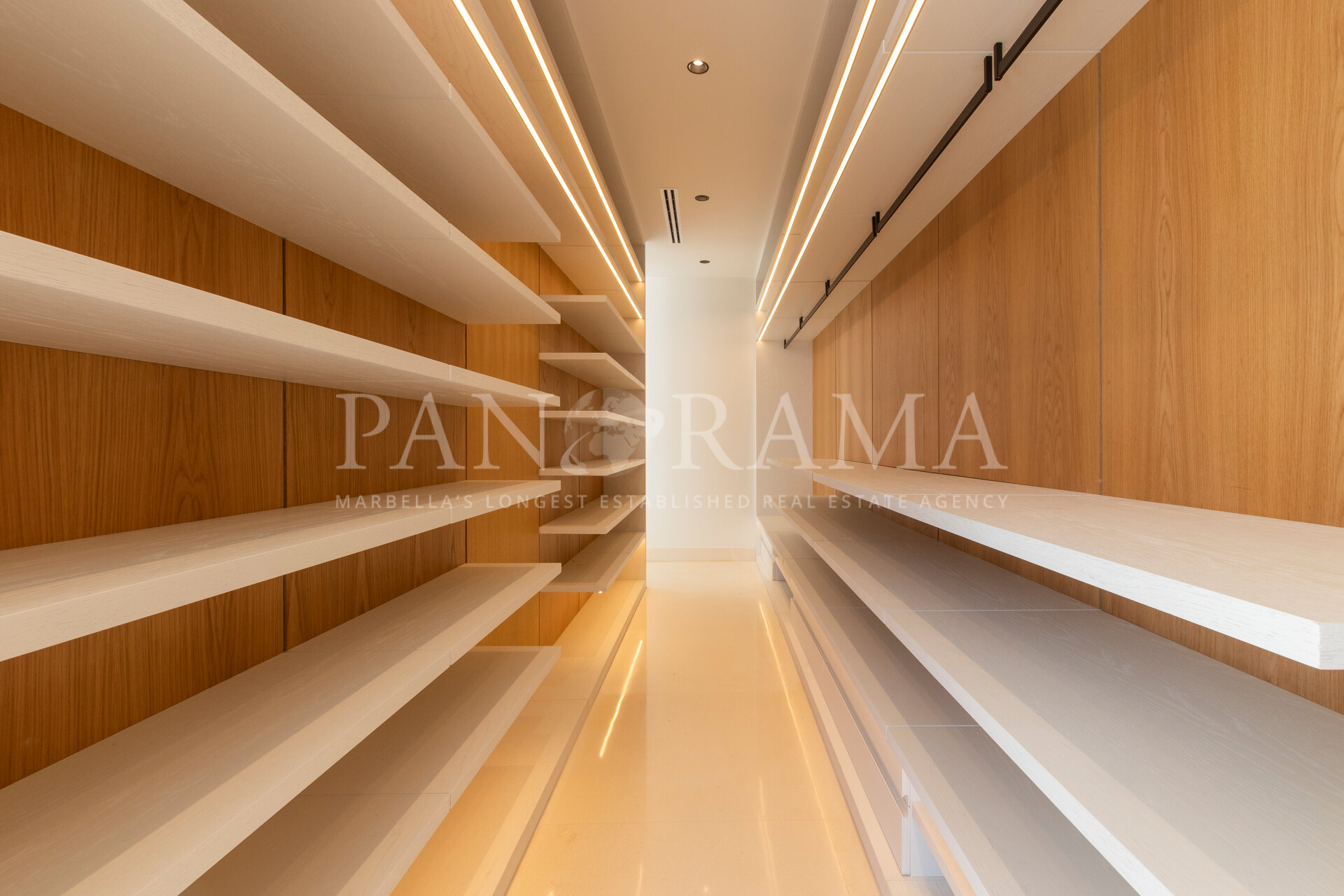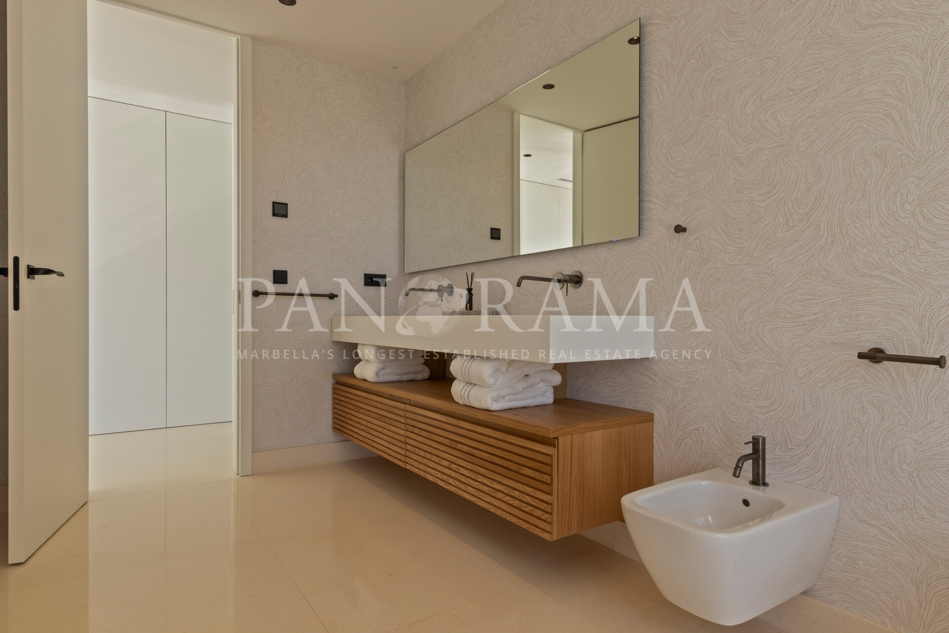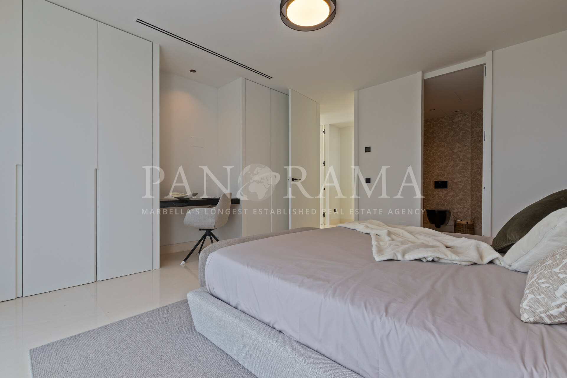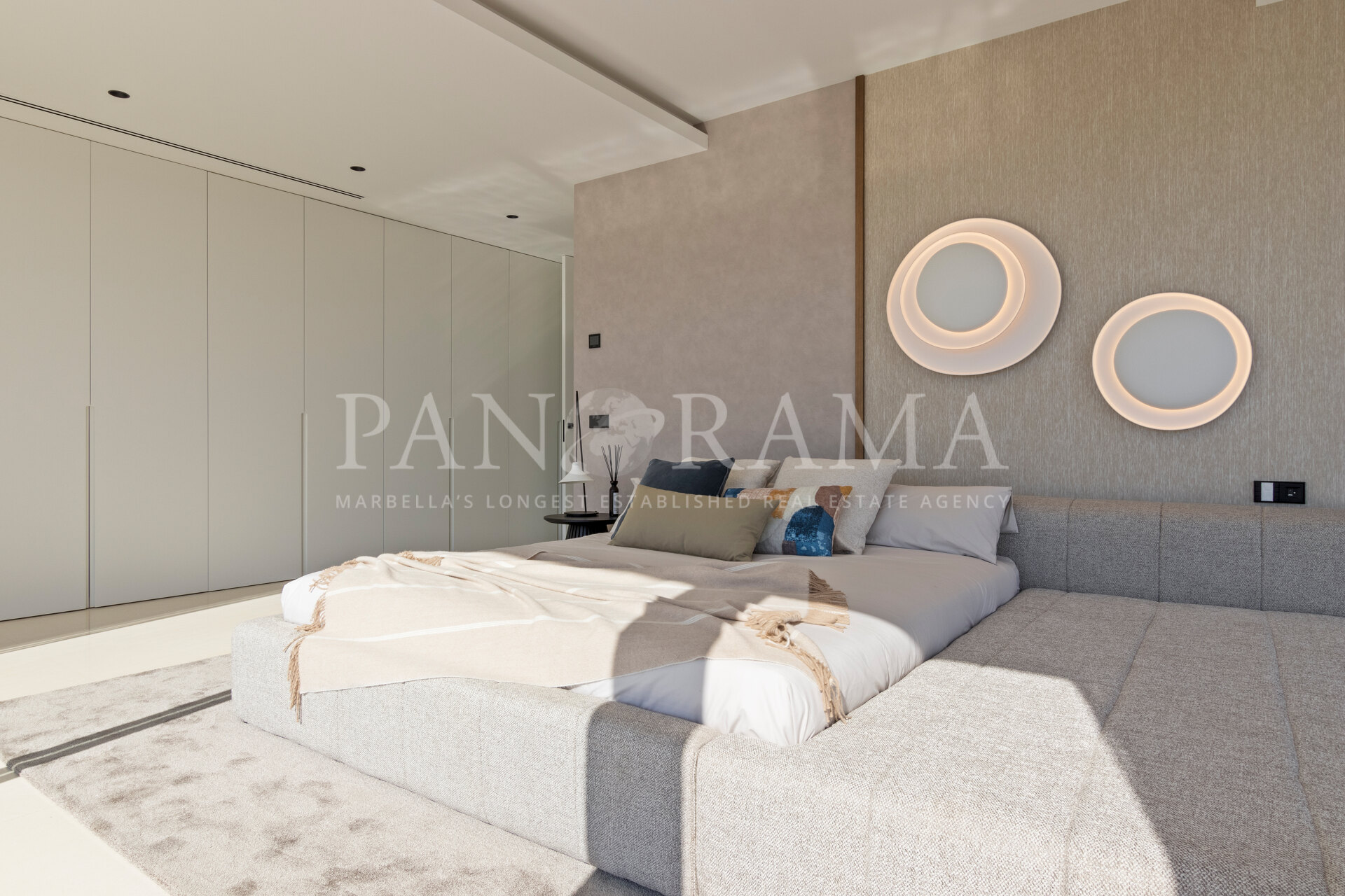 La planta superior está dedicada al descanso y la relajación, ofreciendo tres lujosos dormitorios, cada uno con baño en suite. La característica más destacada es la impresionante suite principal, que ocupa casi la mitad de esta planta. Incluye un gran vestidor, un elegante baño con accesorios de primera calidad y acceso a dos terrazas privadas que ofrecen impresionantes vistas panorámicas al mar Mediterráneo y la costa de Marbella.