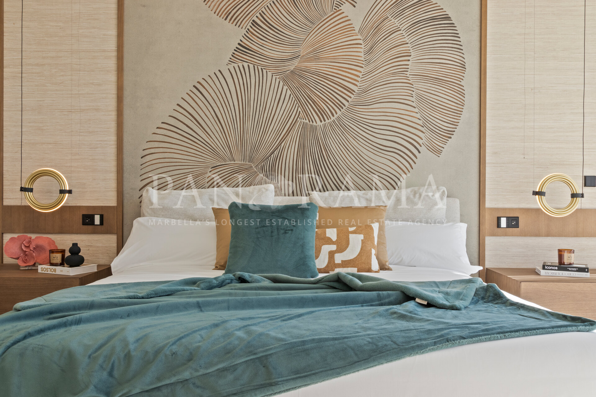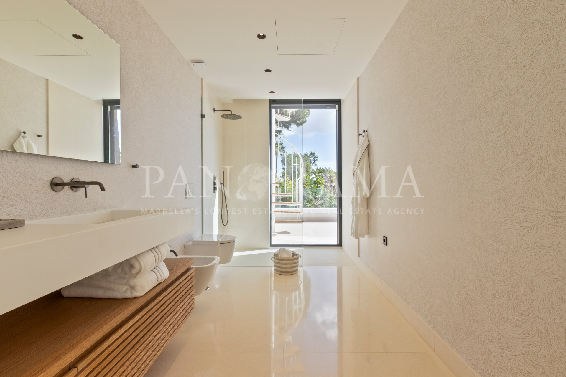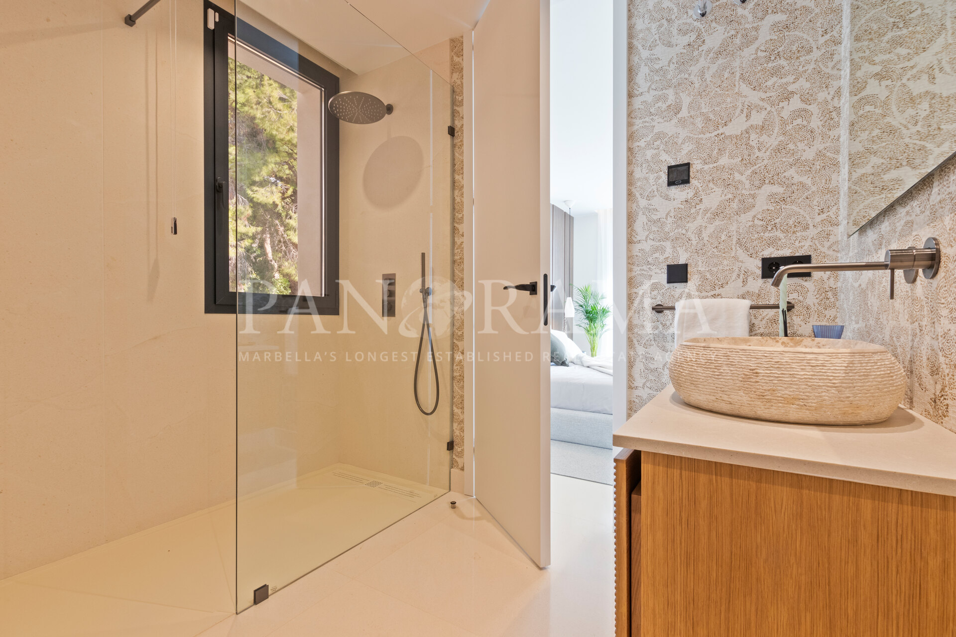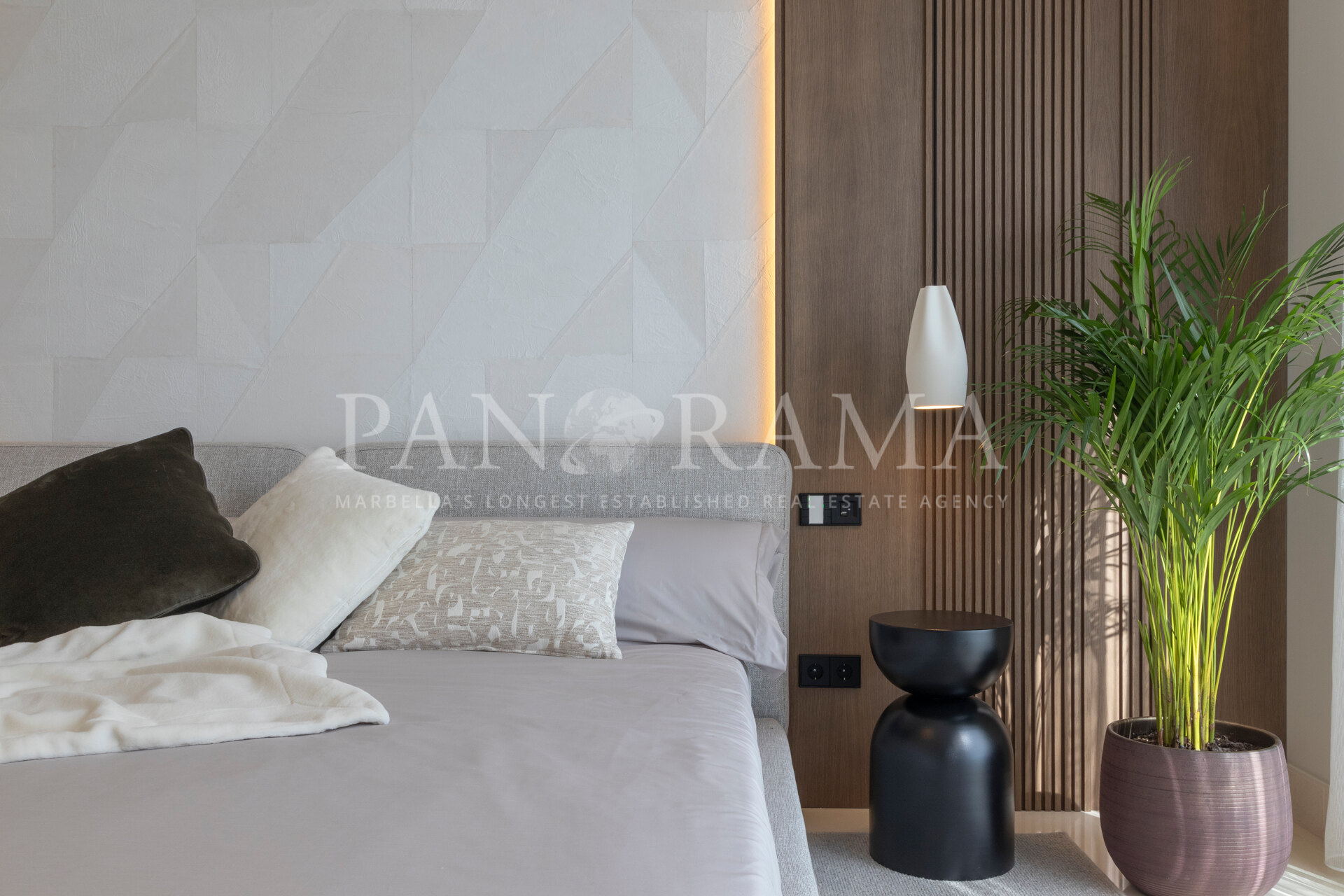 La planta superior está dedicada al descanso y la relajación, ofreciendo tres lujosos dormitorios, cada uno con baño en suite. La característica más destacada es la impresionante suite principal, que ocupa casi la mitad de esta planta. Incluye un gran vestidor, un elegante baño con accesorios de primera calidad y acceso a dos terrazas privadas que ofrecen impresionantes vistas panorámicas al mar Mediterráneo y la costa de Marbella.