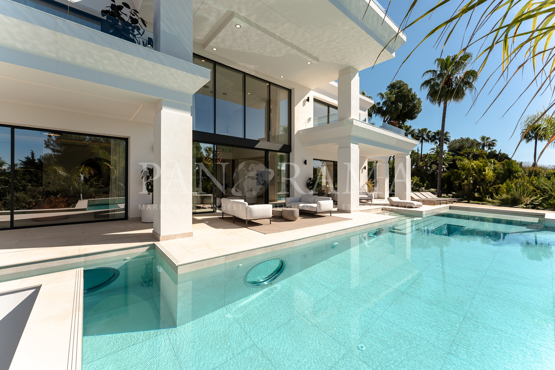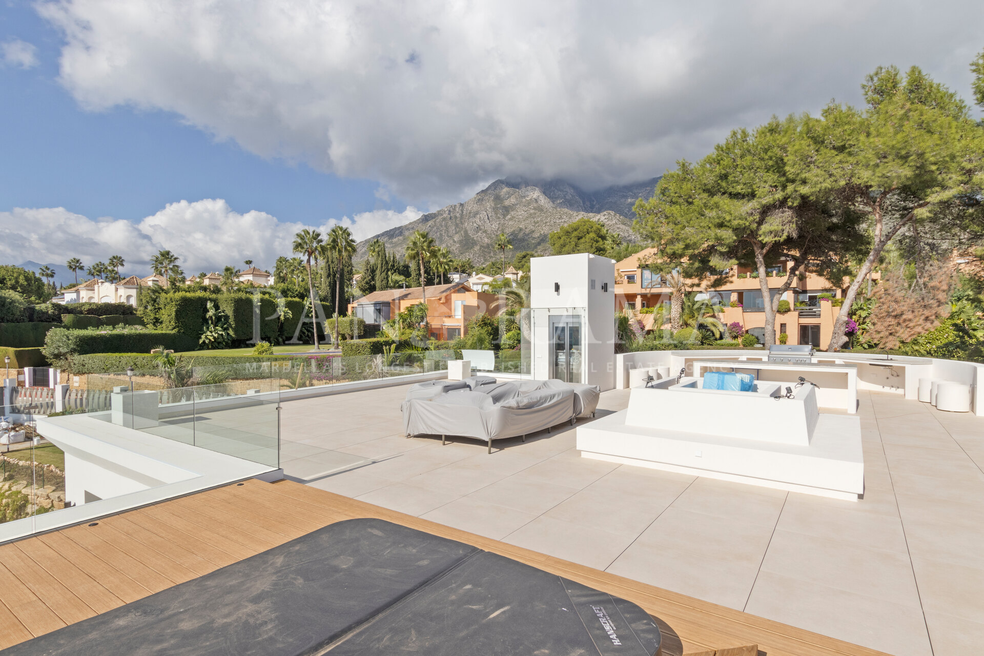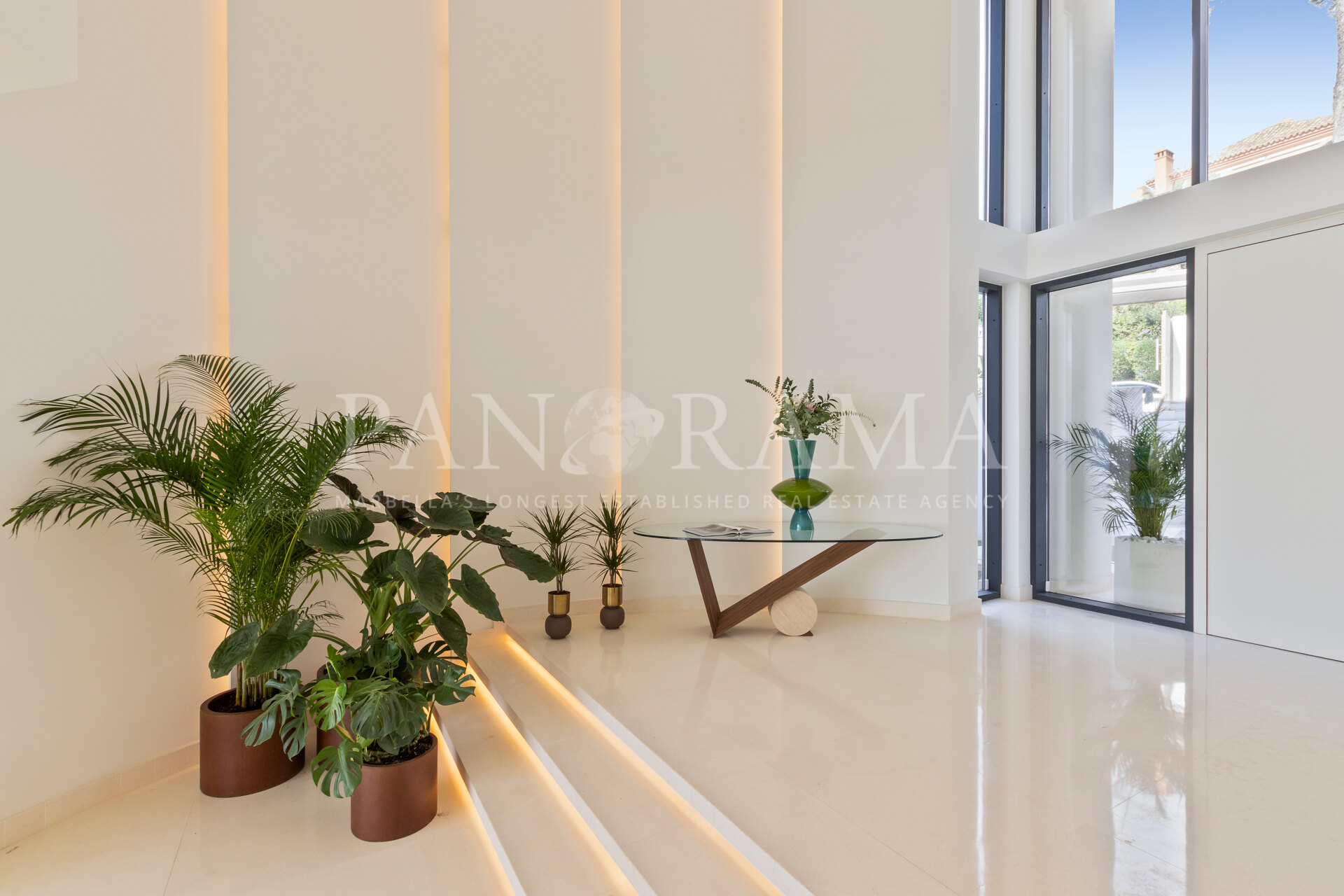 Esta villa contemporánea única, situada en la prestigiosa y segura comunidad de Sierra Blanca, representa el epítome del lujo en Marbella. Diseñada para los compradores más exigentes, la propiedad se asienta sobre una amplia parcela de 2.633 m² y se distribuye en cuatro niveles meticulosamente planificados, combinando una arquitectura impactante, acabados de primera calidad y comodidades de última generación.