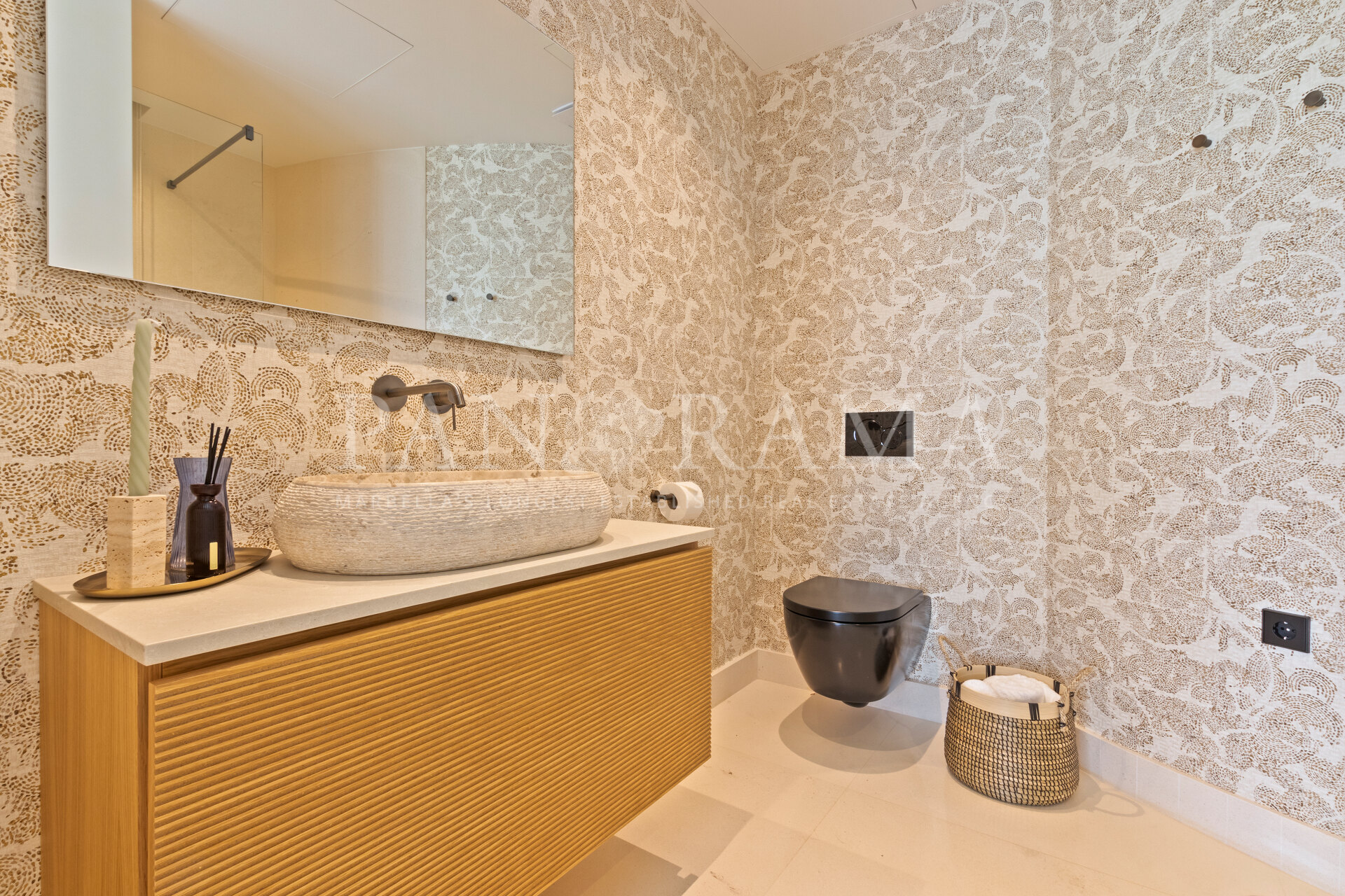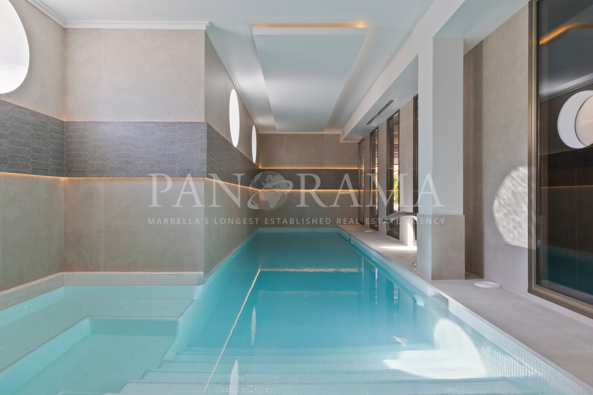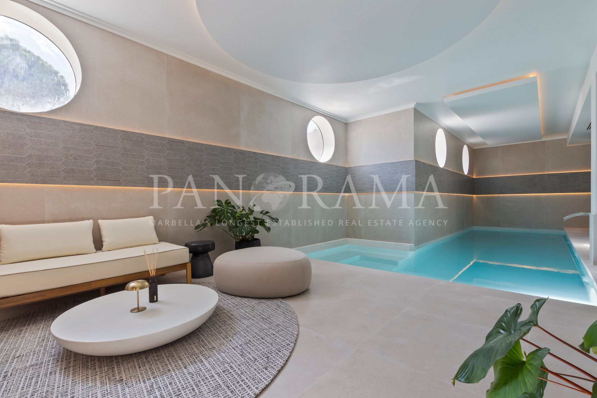 La planta inferior de la villa está diseñada para el bienestar, el ocio y la funcionalidad. Incluye una sala de cine en casa, gimnasio totalmente equipado, zona de spa con sauna y hammam, y una piscina cubierta climatizada, perfecta para disfrutar durante todo el año. Además, esta planta dispone de una suite de invitados independiente con acceso a un patio inglés, un apartamento para el personal, lavandería y un garaje privado con capacidad para cuatro vehículos.