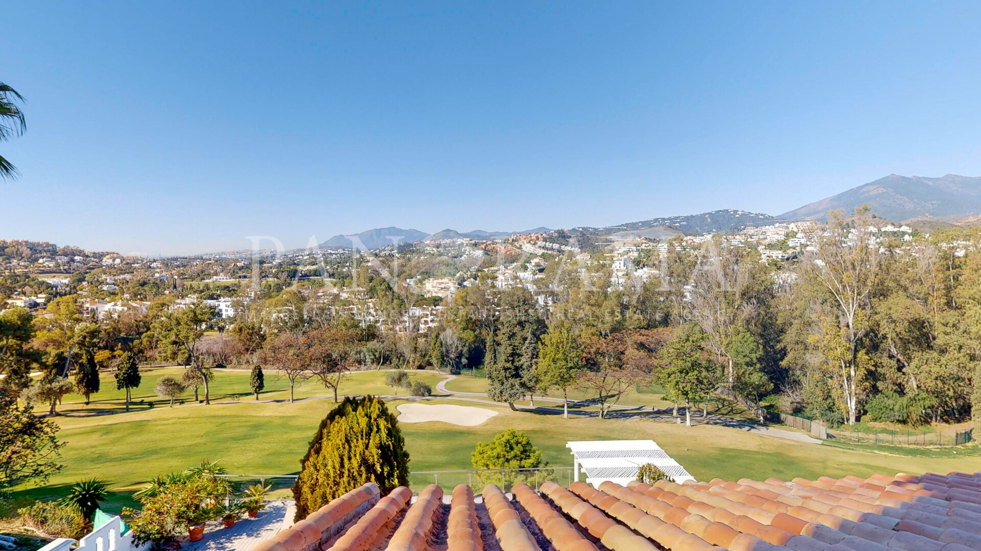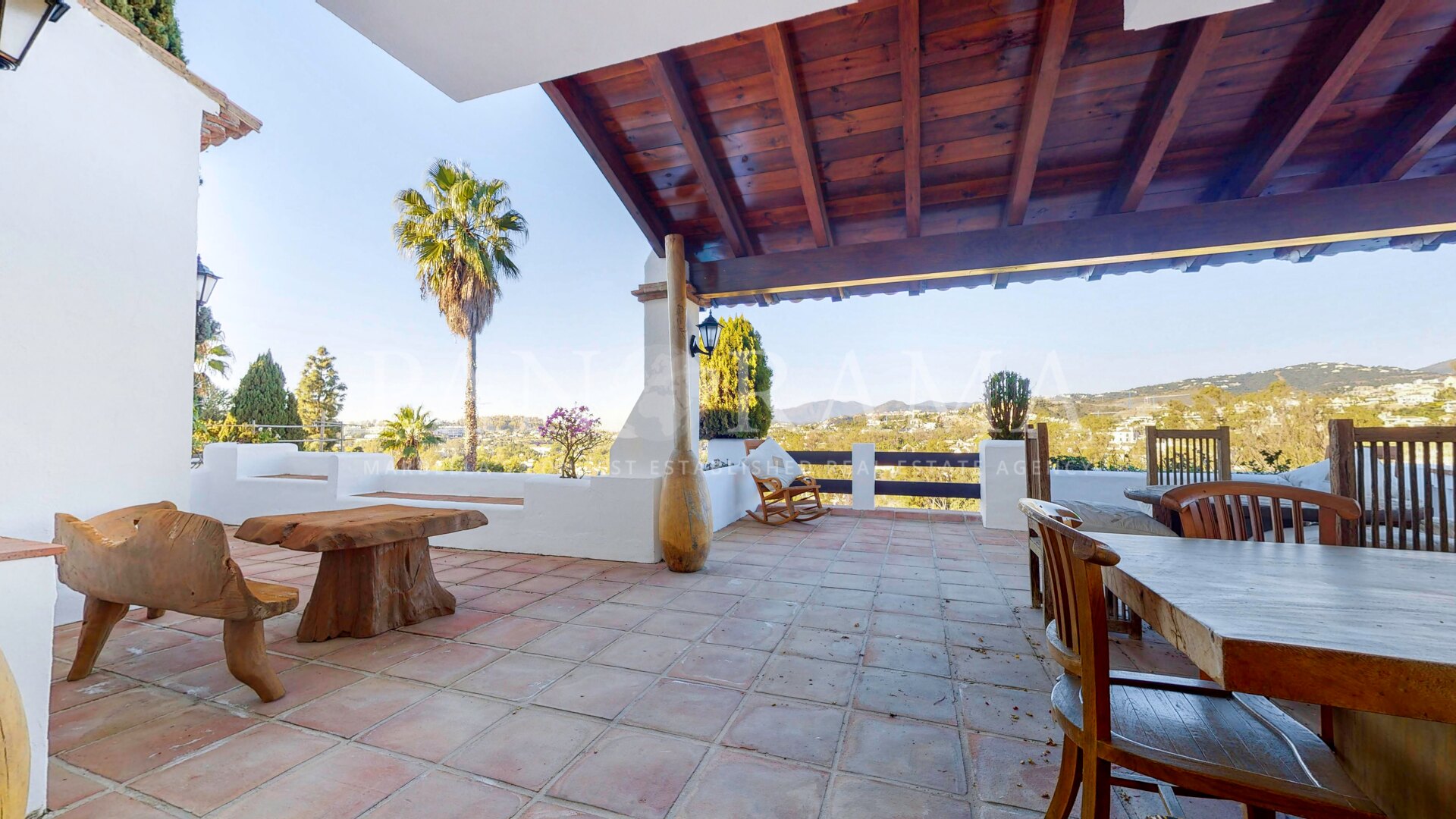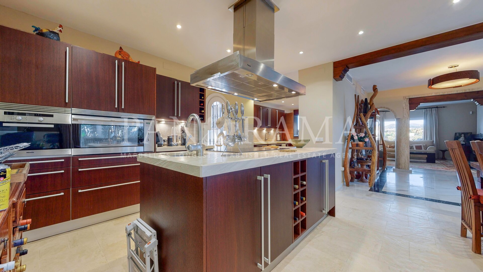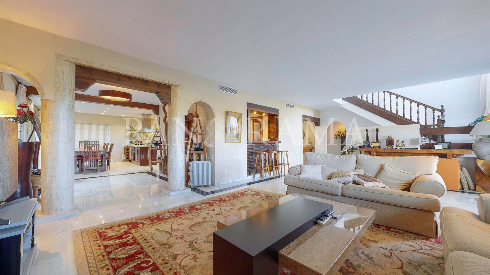 Impresionante villa de estilo mediterráneo rodeada de campos de golf y disfrutando de magníficas puestas de sol, y vistas al mar, la montaña y al campo de golf. La casa está ubicada en una hermosa zona residencial de Aloha, en el Valle del Golf de Nueva Andalucía. Con orientación suroeste, la casa principal se distribuye en 3 niveles y ofrece 7 dormitorios y 4 baños, amplias salas de estar y comedor independiente, cocina moderna con chimenea. La casa de invitados separada ofrece 1 dormitorio y 1 baño. Precioso jardín con piscina y tarima de madera, plaza de garaje. Cerca de todos los servicios ya 2 minutos en coche de Puerto Banús.