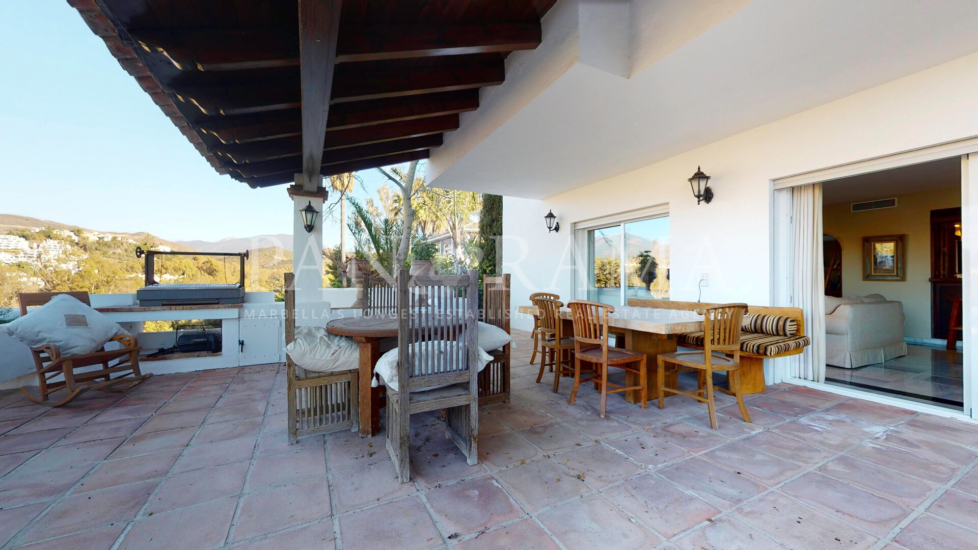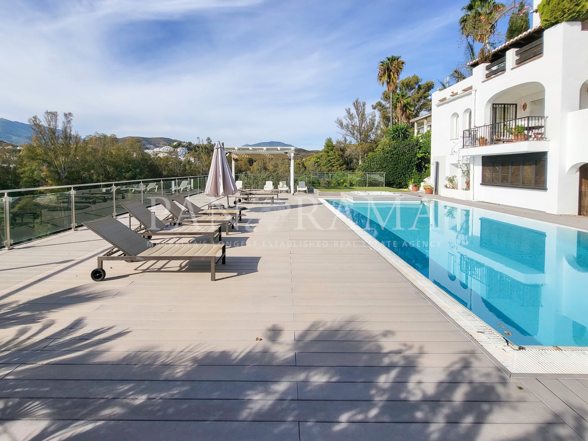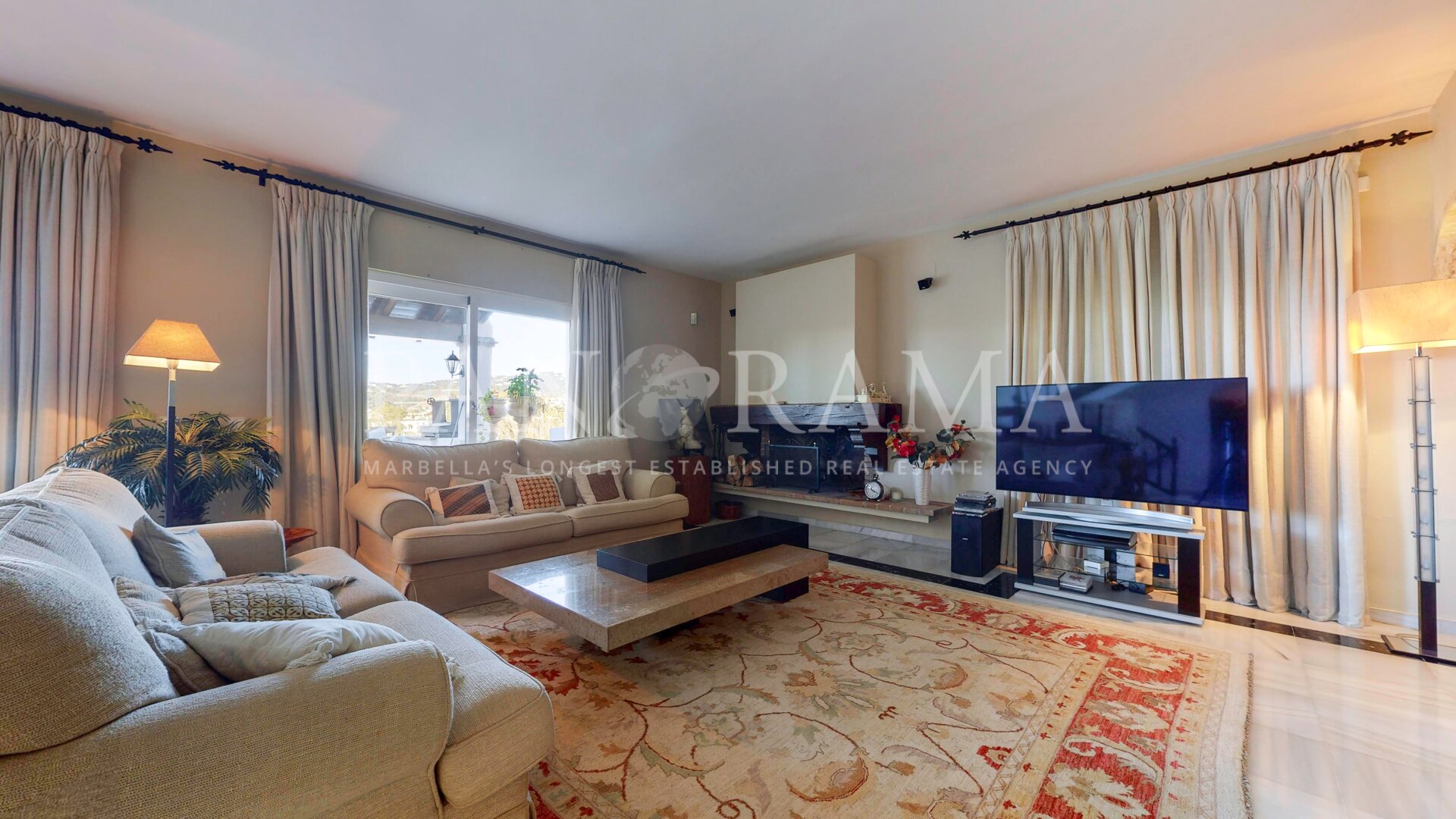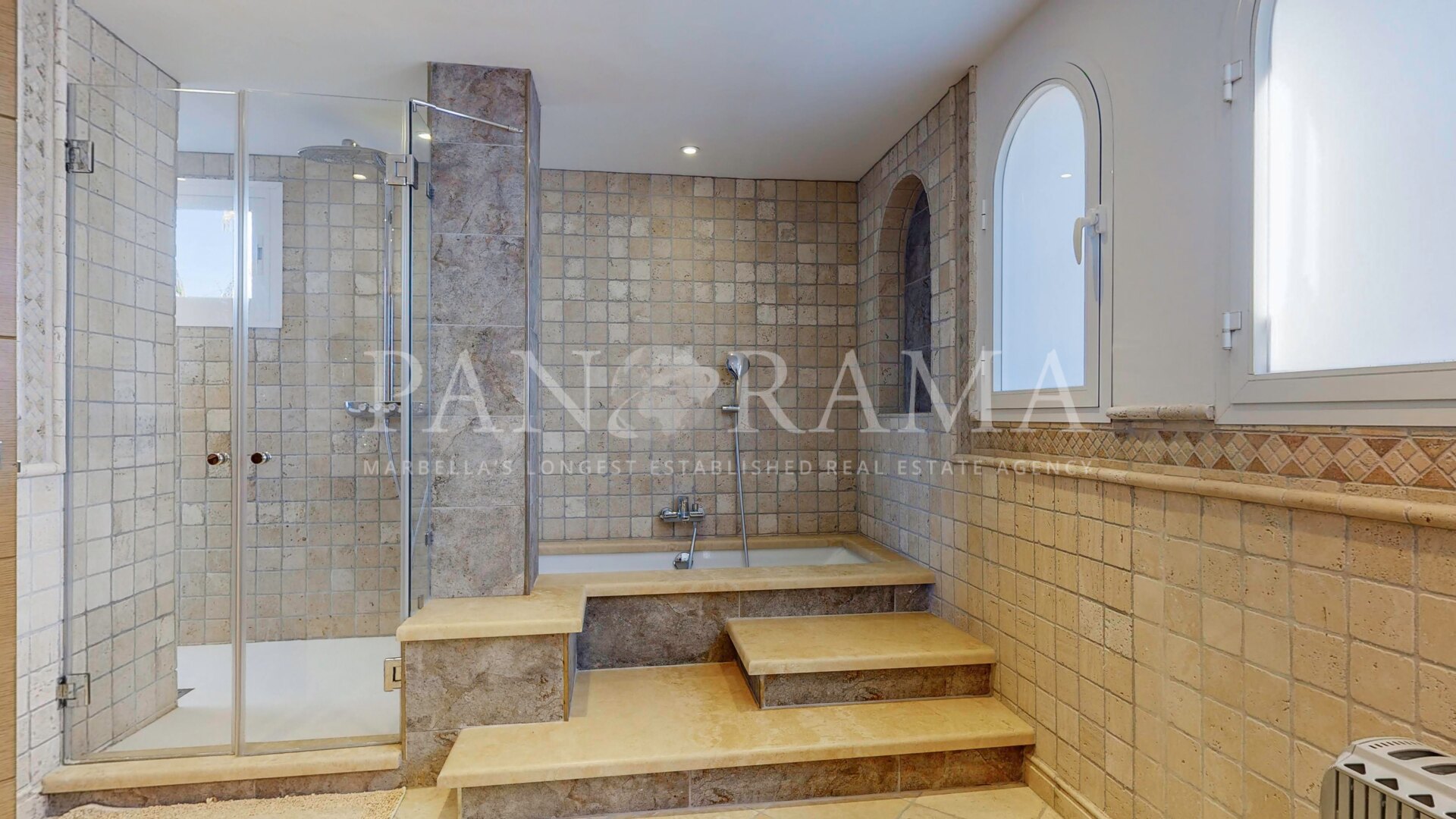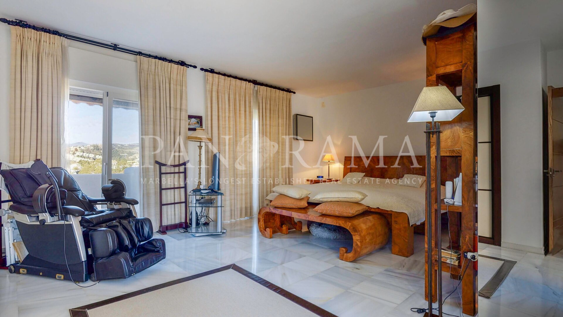 Impresionante villa de estilo mediterráneo rodeada de campos de golf y disfrutando de magníficas puestas de sol, y vistas al mar, la montaña y al campo de golf. La casa está ubicada en una hermosa zona residencial de Aloha, en el Valle del Golf de Nueva Andalucía. Con orientación suroeste, la casa principal se distribuye en 3 niveles y ofrece 7 dormitorios y 4 baños, amplias salas de estar y comedor independiente, cocina moderna con chimenea. La casa de invitados separada ofrece 1 dormitorio y 1 baño. Precioso jardín con piscina y tarima de madera, plaza de garaje. Cerca de todos los servicios ya 2 minutos en coche de Puerto Banús.