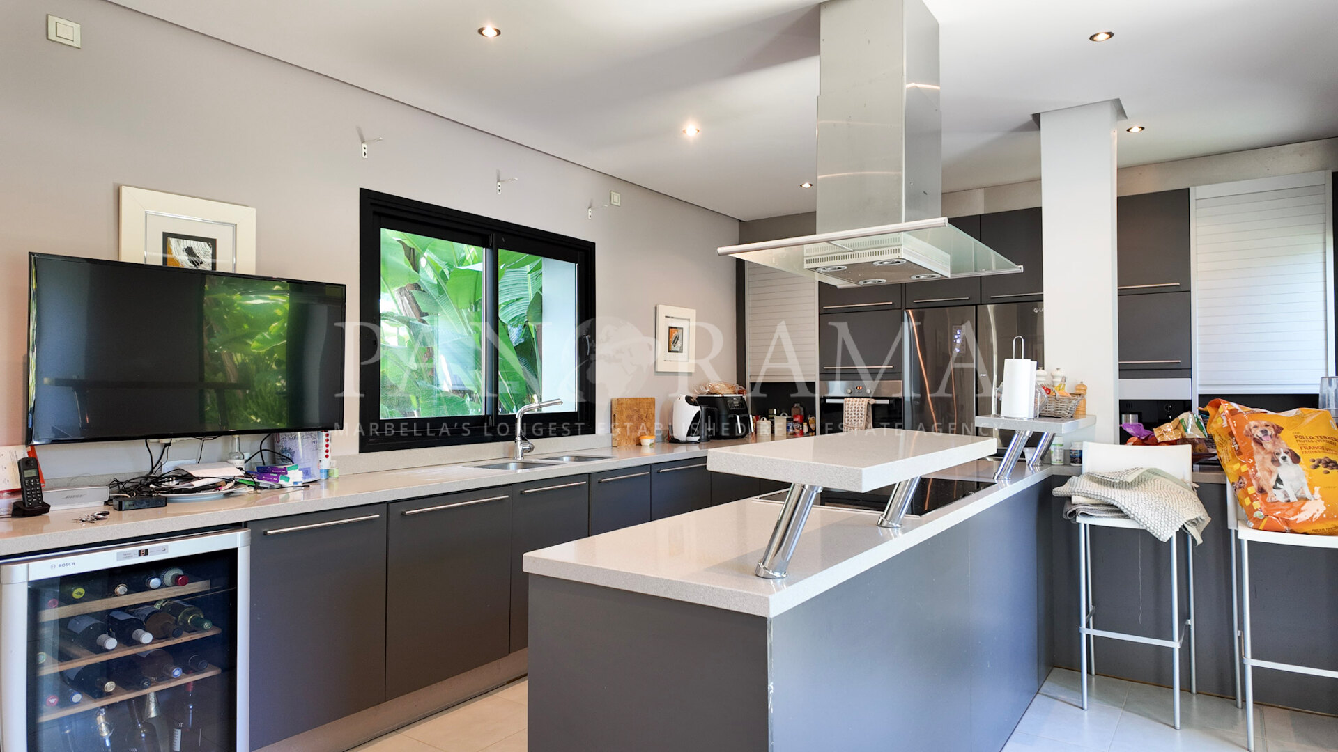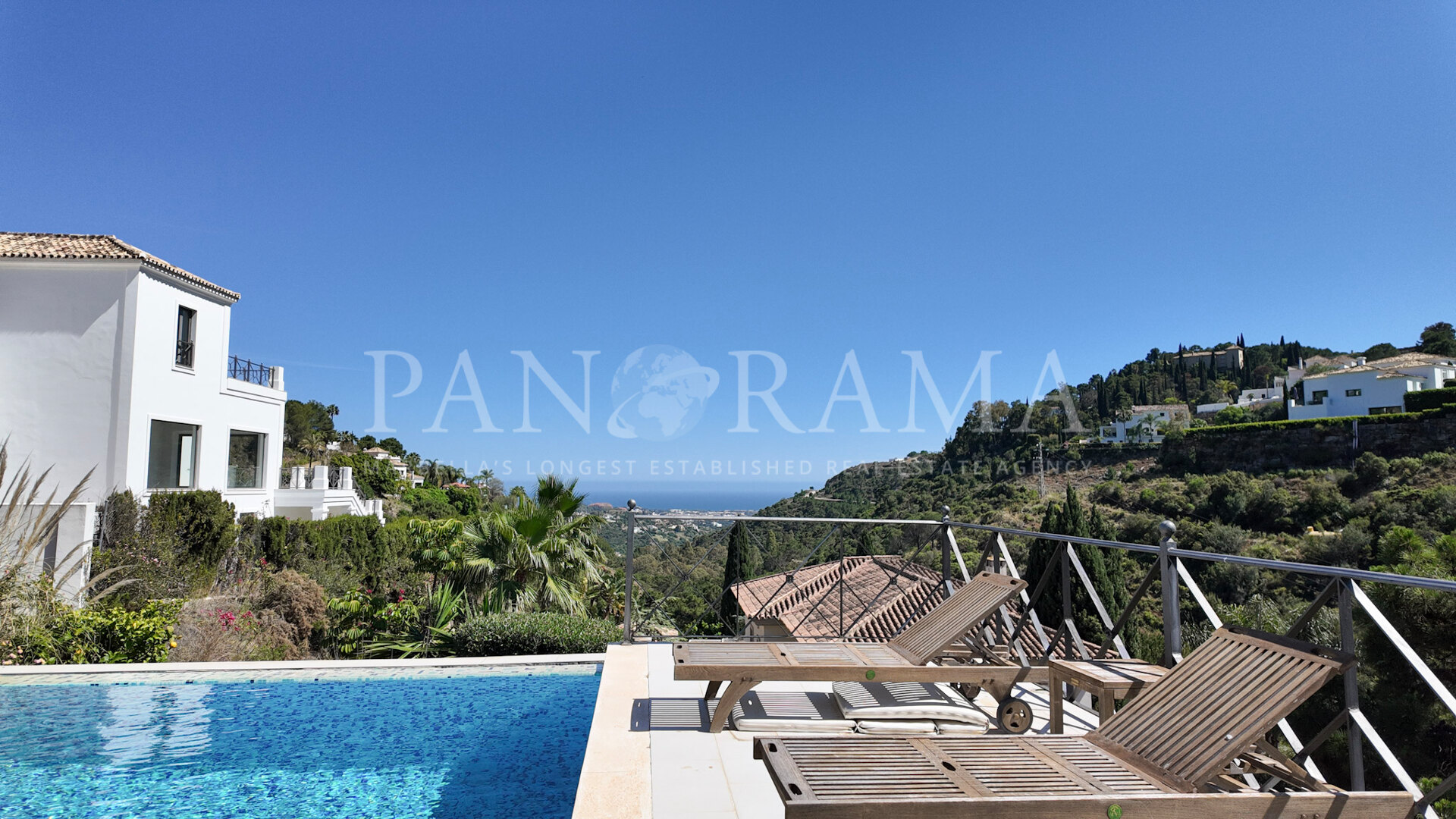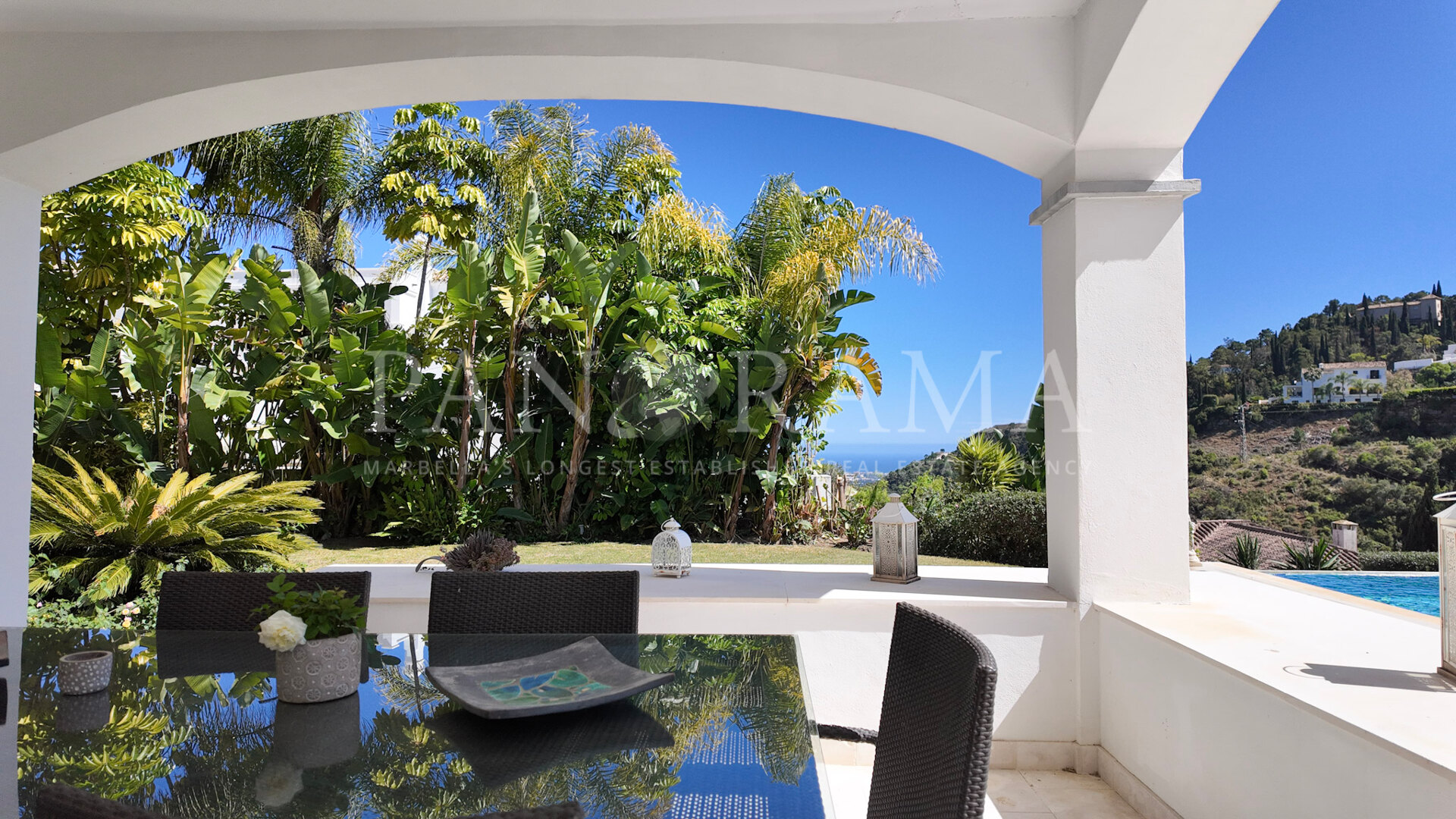 Une cuisine séparée, entièrement équipée avec un coin repas, est facilement accessible depuis le hall principal et offre un accès direct aux magnifiques espaces extérieurs de la villa. Vous y trouverez des terrasses couvertes et découvertes idéales pour les repas en plein air ou pour se détendre au soleil, un grand espace barbecue parfait pour recevoir, ainsi qu’un vaste jardin privé. Le point fort de l’extérieur est la piscine invitante, entourée de jardins paysagers et offrant une vue imprenable sur la mer et les montagnes — un cadre propice à la détente à tout moment de la journée.