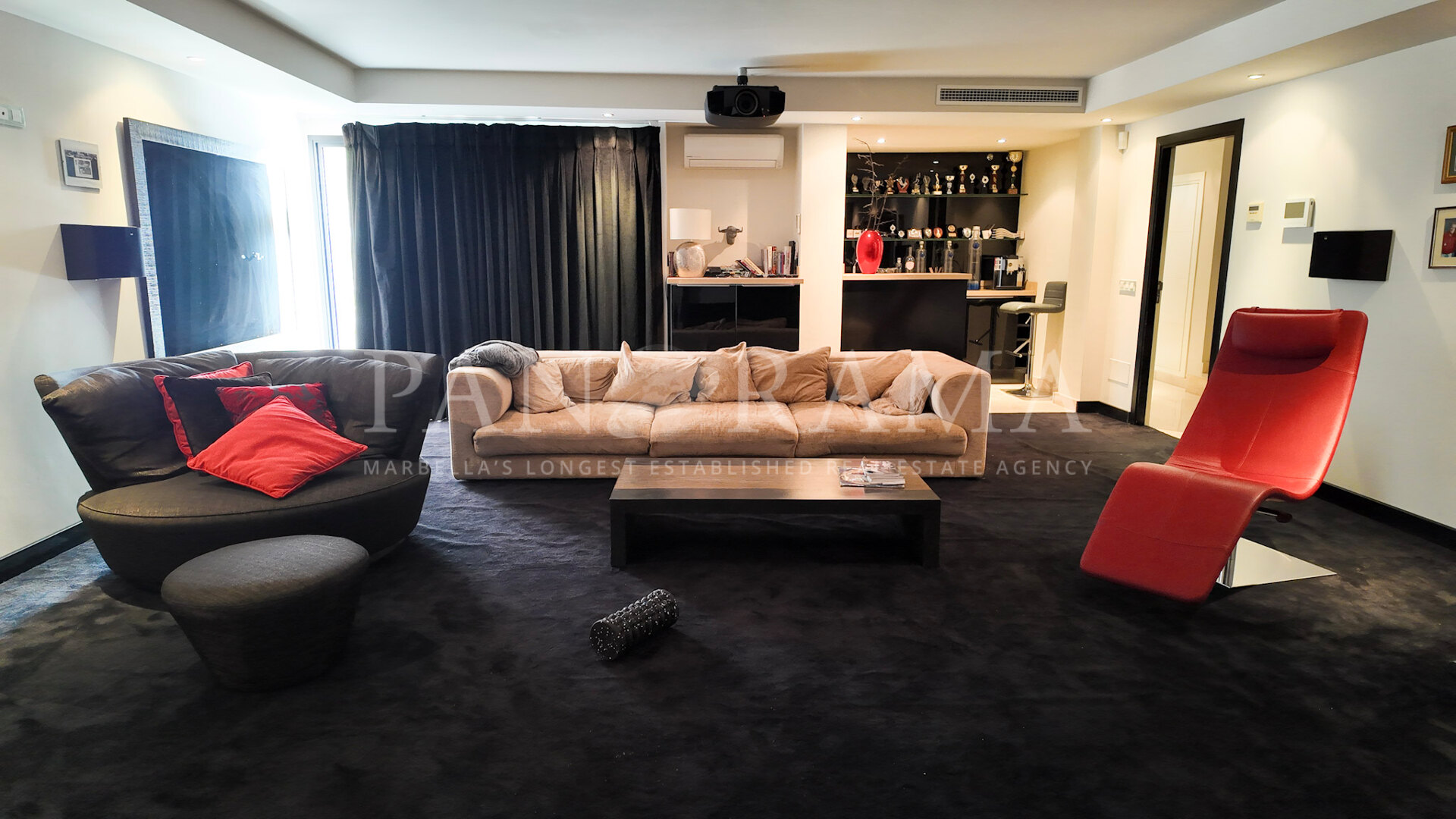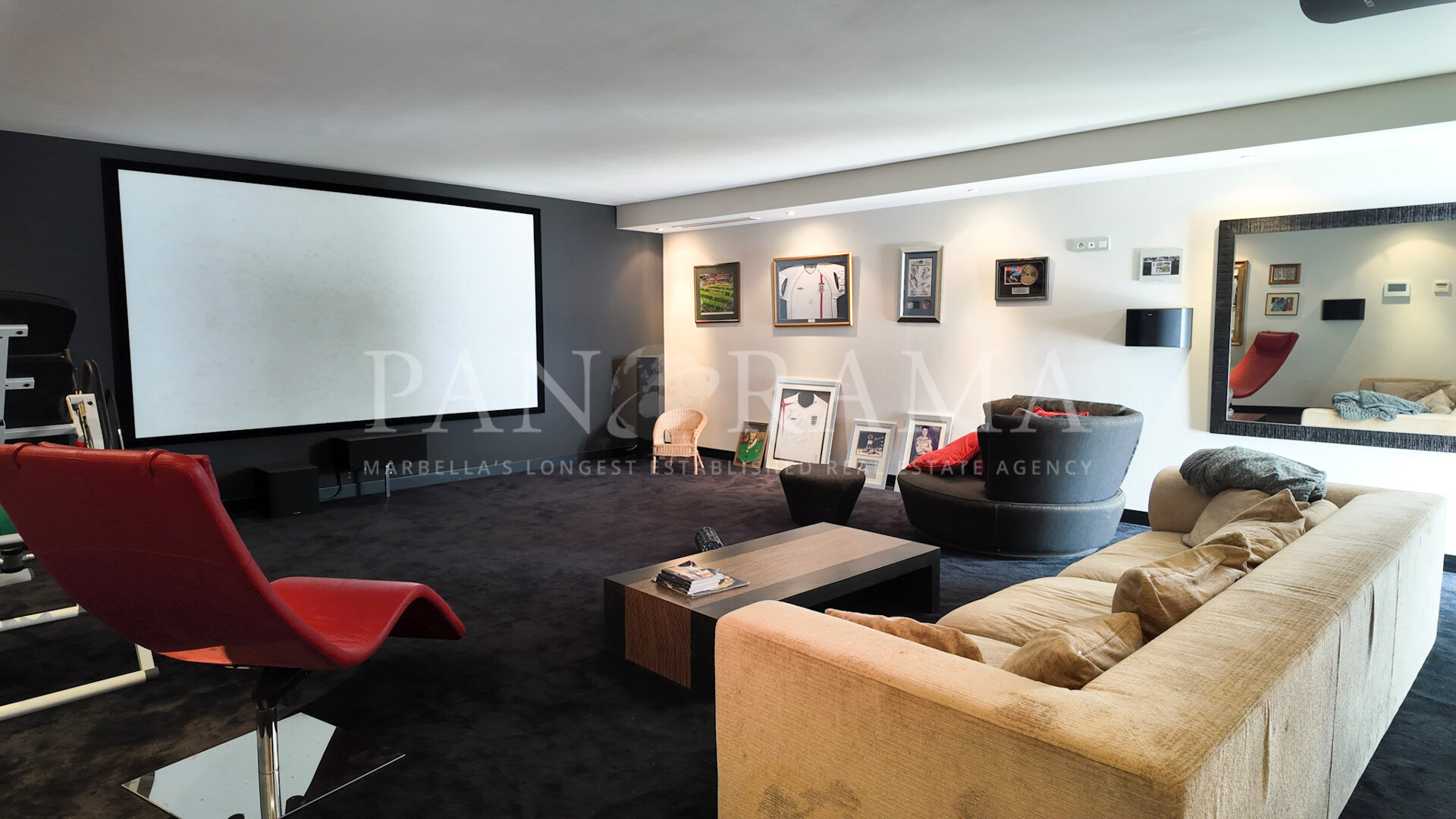 Le niveau inférieur de la propriété abrite une vaste salle de cinéma, idéale pour les soirées cinéma ou pour recevoir des invités, ainsi qu’une cinquième chambre, une buanderie et un garage sécurisé pour deux voitures.