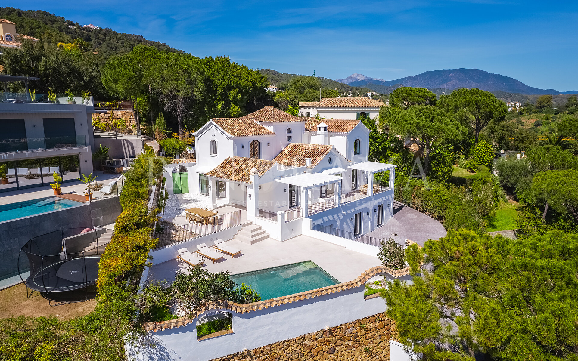 À l’intérieur, la propriété dispose de cinq chambres généreuses et de cinq salles de bains élégantes, toutes aménagées avec des finitions haut de gamme. Les intérieurs présentent un mélange harmonieux de charme traditionnel et de style contemporain, avec des matériaux de qualité et des détails raffinés dans chaque recoin. Un salon lumineux et spacieux offre un cadre détendu mais élégant, tandis qu’une salle de divertissement supplémentaire peut servir de cinéma, salle de jeux, bureau ou salle de sport selon vos besoins.
