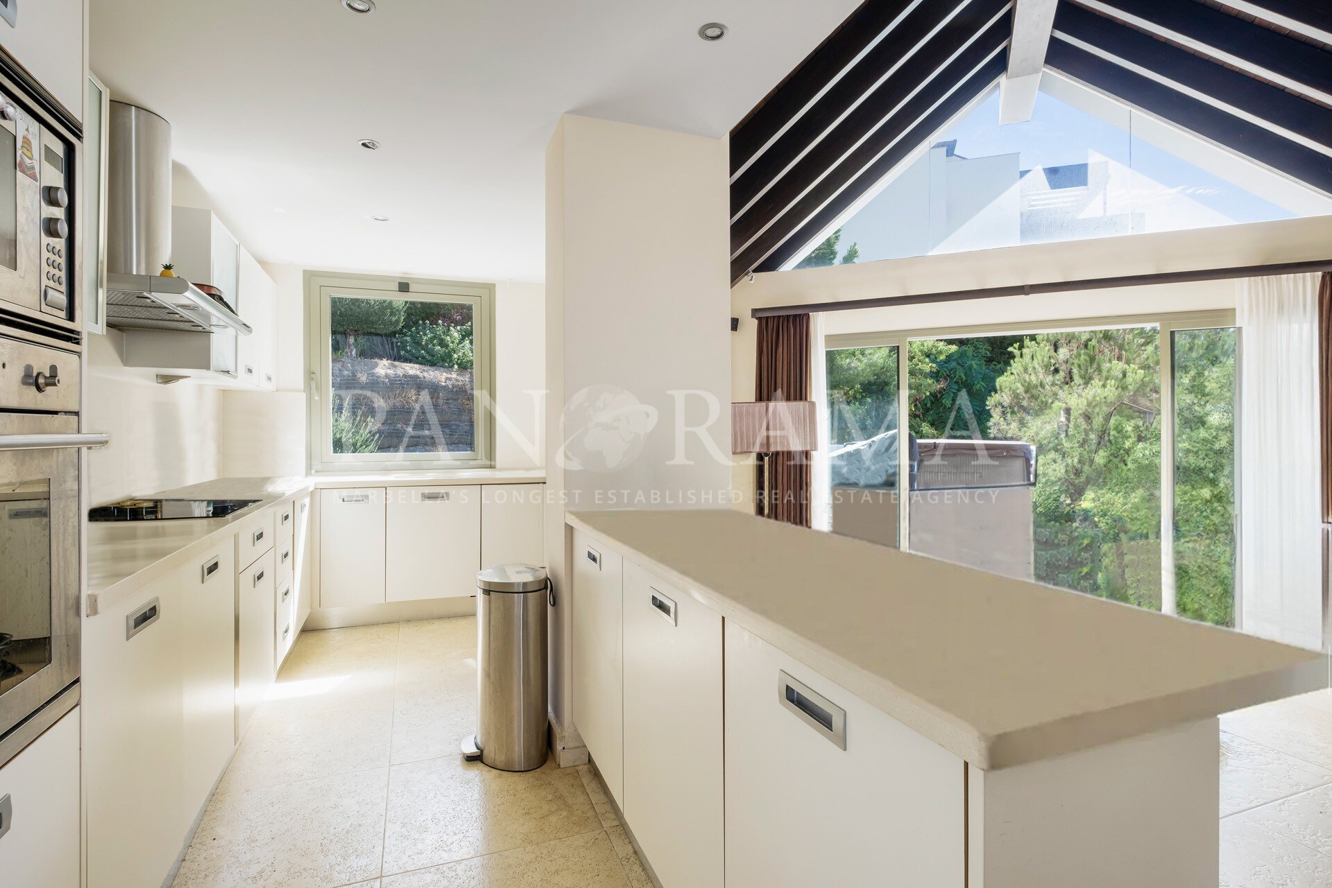 Étage supérieur: Tout le niveau supérieur est dédié à la luxueuse suite parentale, qui comprend une élégante salle de bains privative et un dressing. Profitez de la détente ultime sur le toit-terrasse privé, avec une petite piscine et un sauna, offrant une intimité inégalée et une vue panoramique.
