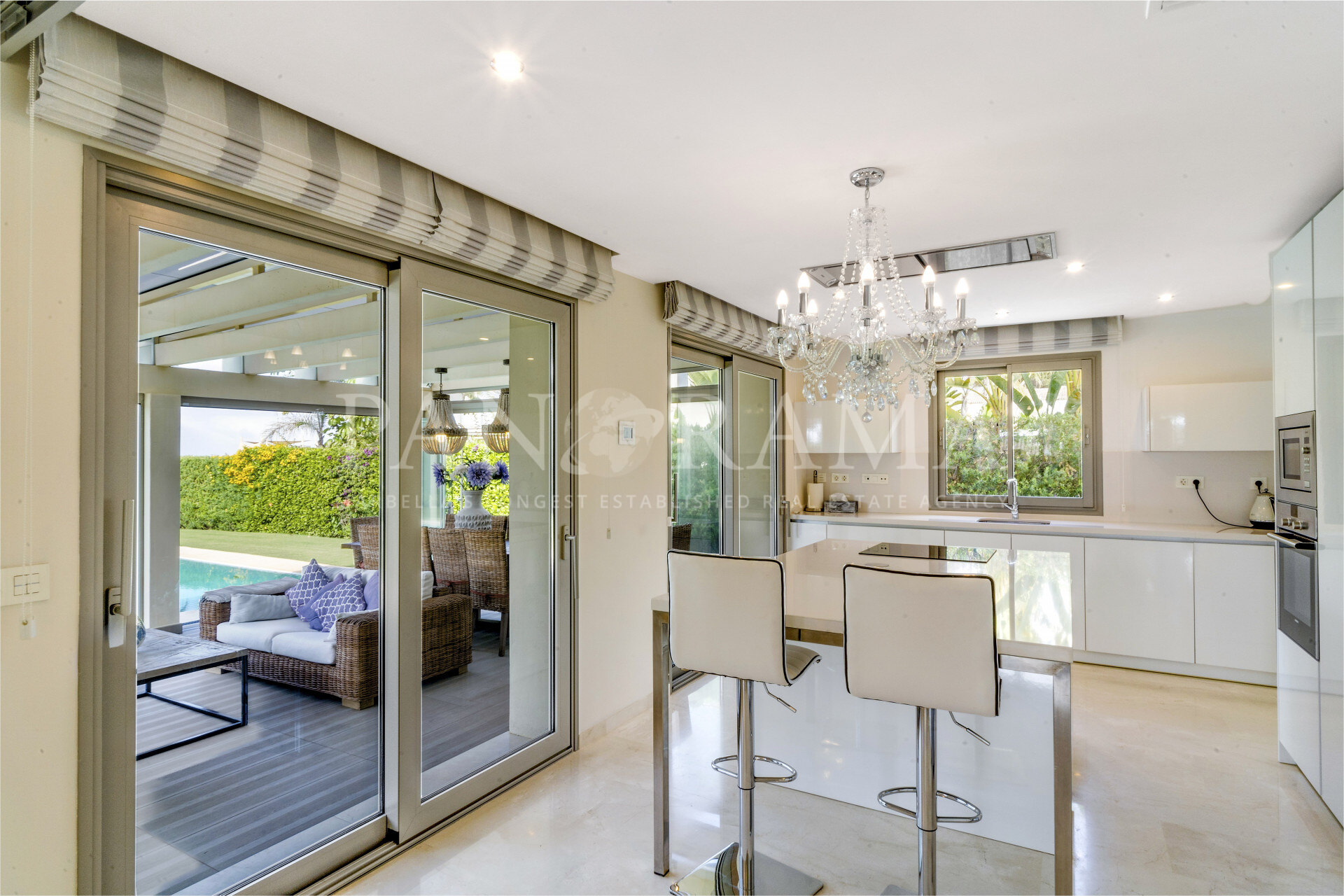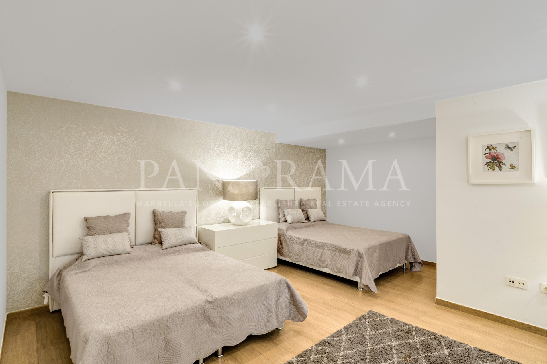 Le niveau inférieur comprend un appartement indépendant et un garage. Au rez-de-chaussée, vous trouverez un espace de vie et salle à manger lumineux et ouvert, une cuisine moderne entièrement équipée, une buanderie, une chambre d’amis avec salle de bain attenante et des toilettes pour invités. Ce niveau s’ouvre sur la terrasse et le jardin, avec une partie de la terrasse fermée par des rideaux de verre, idéale pour vivre à l’extérieur même pendant les mois les plus frais.