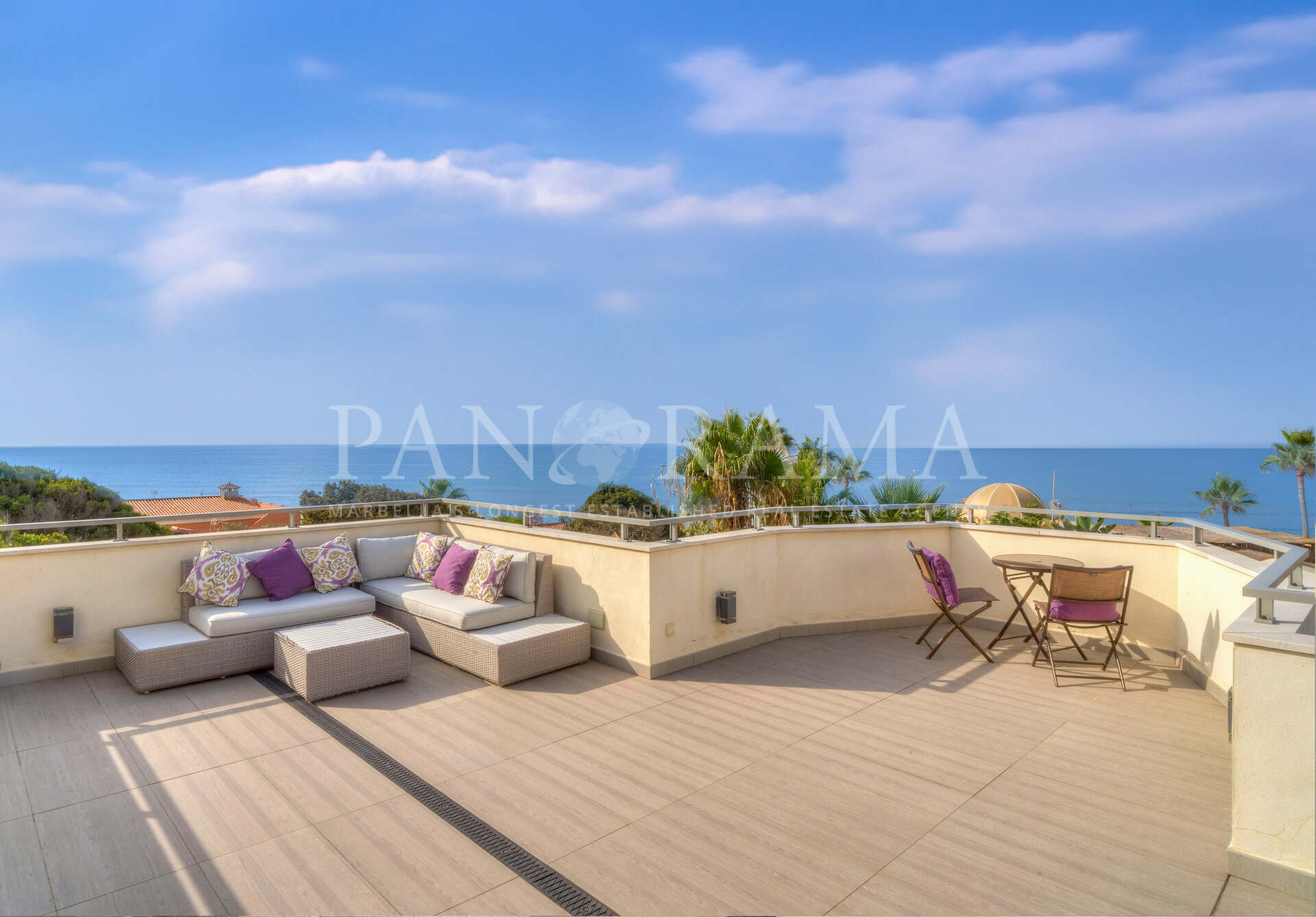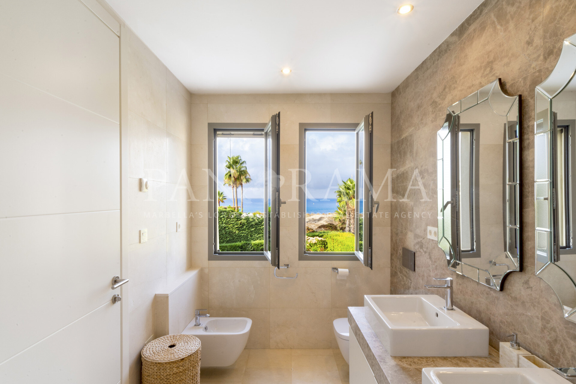 Le premier étage comprend deux chambres d’amis avec salles de bain attenantes et une suite parentale offrant une vue imprenable sur la mer. Le niveau supérieur donne accès à un solarium spacieux, un refuge paisible parfait pour se détendre au son des vagues ou recevoir des invités.