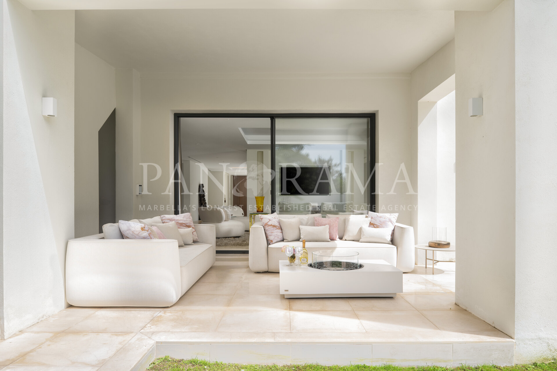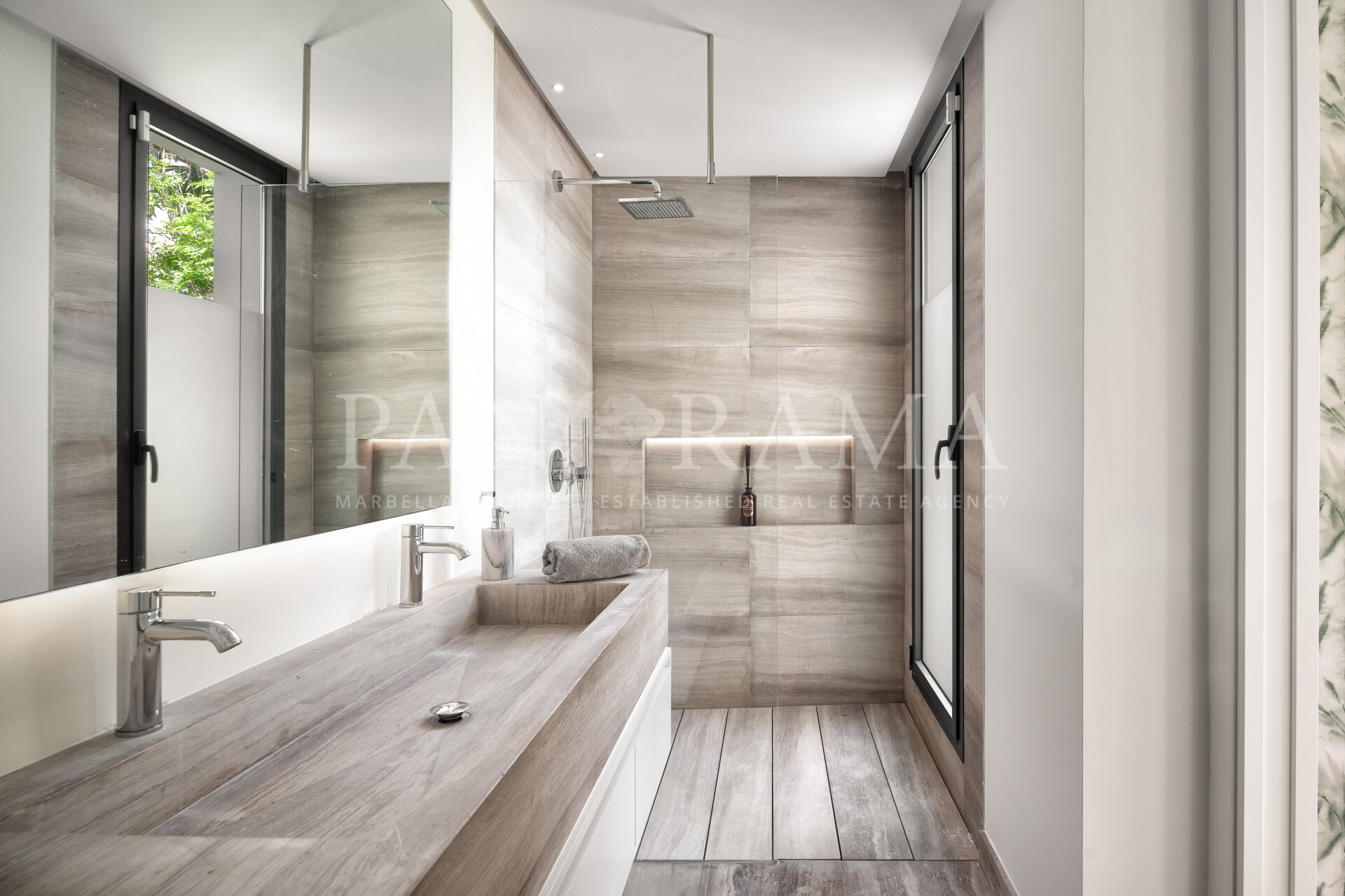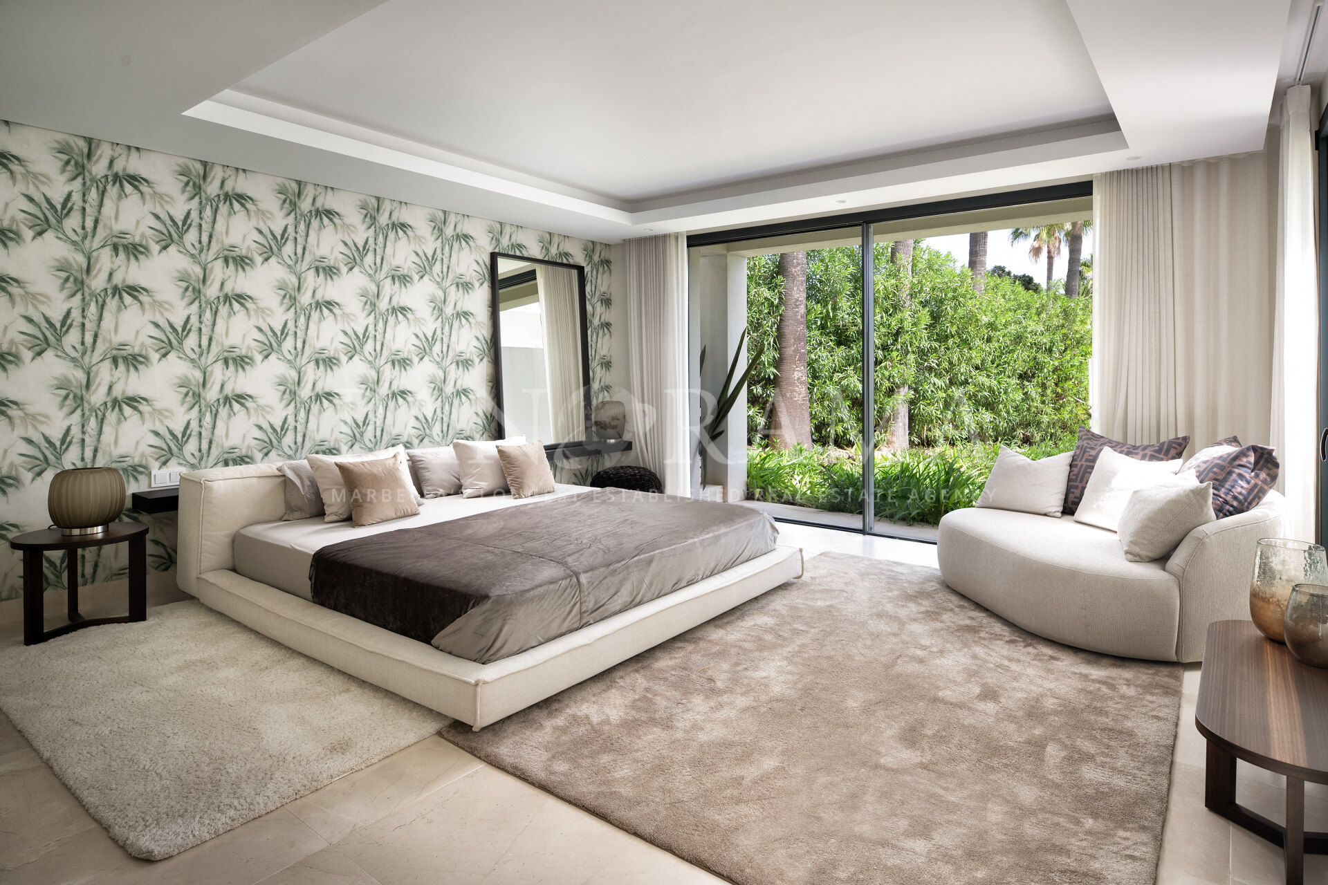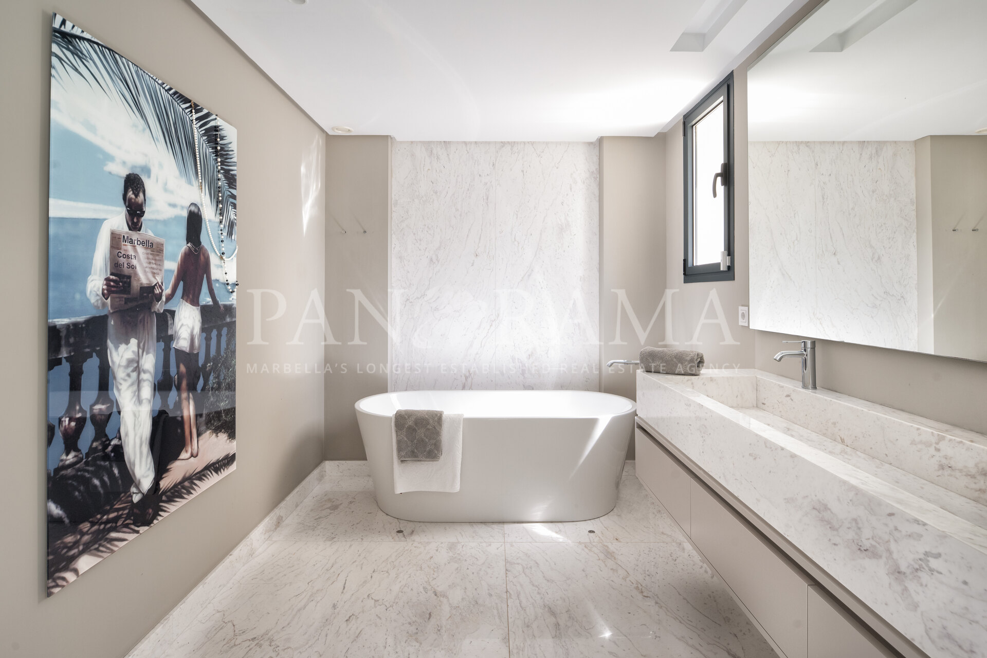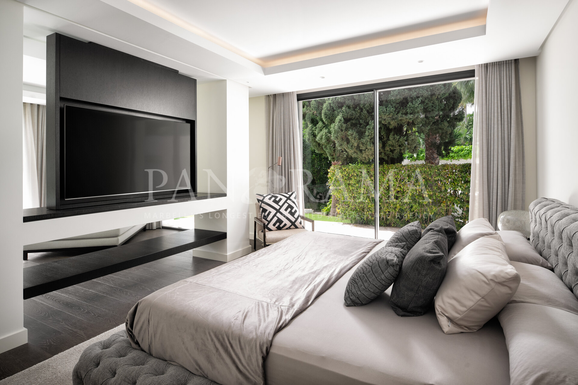 Cette villa exquise offre vraiment le meilleur des deux mondes : un refuge tranquille en bord de mer avec le luxe et la commodité de la vie moderne à Marbella Est.
