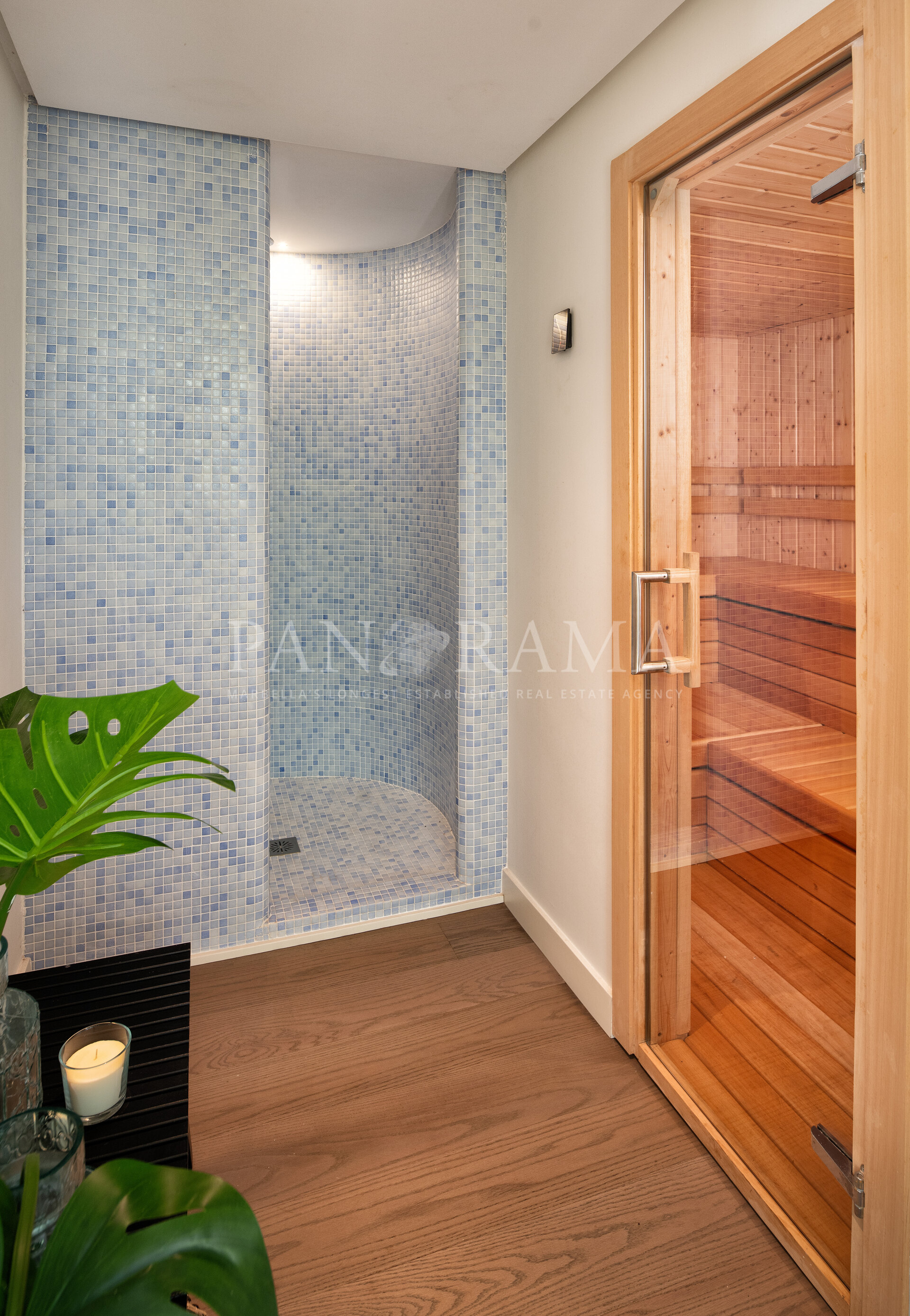 L’une des caractéristiques remarquables de la propriété est sa chambre principale exquise, qui dispose d’une salle de bains attenante spacieuse et d’un accès direct à la salle de sport privée de la villa. La salle de sport est entièrement équipée et comprend un sauna et une douche indépendante, offrant une expérience de bien-être complète. Depuis la salle de sport, vous pouvez facilement accéder à la terrasse sur le toit, un espace serein où vous pouvez vous détendre, profiter de la vue ou vous engager dans des routines d’exercice en plein air.