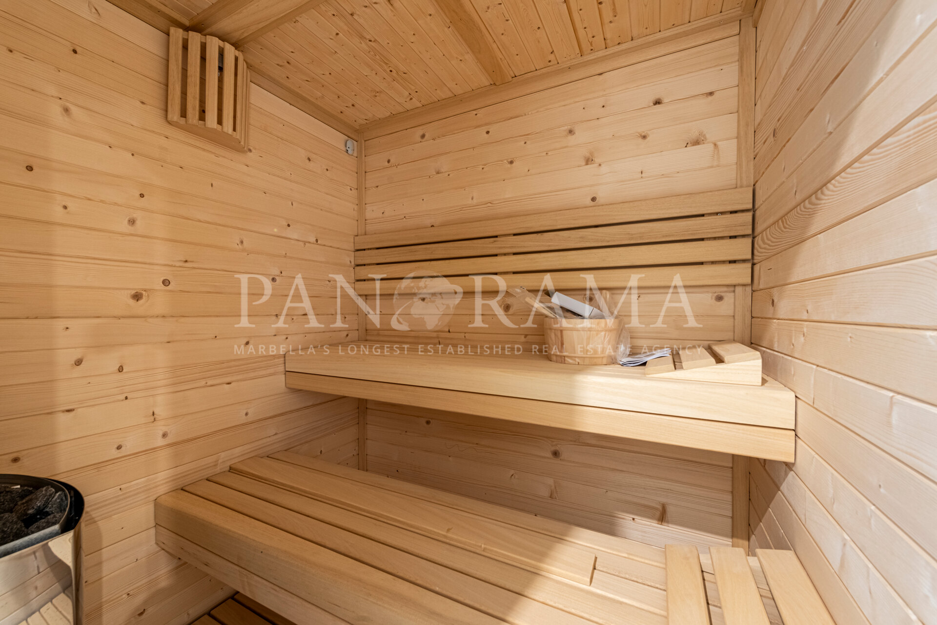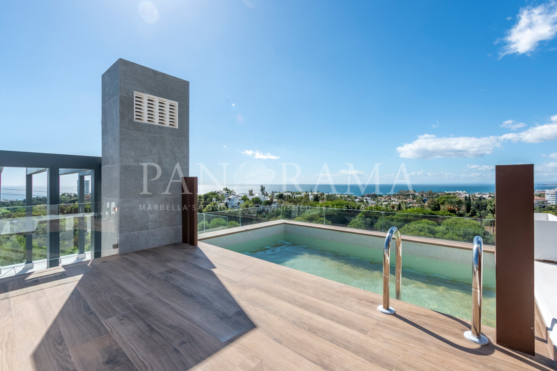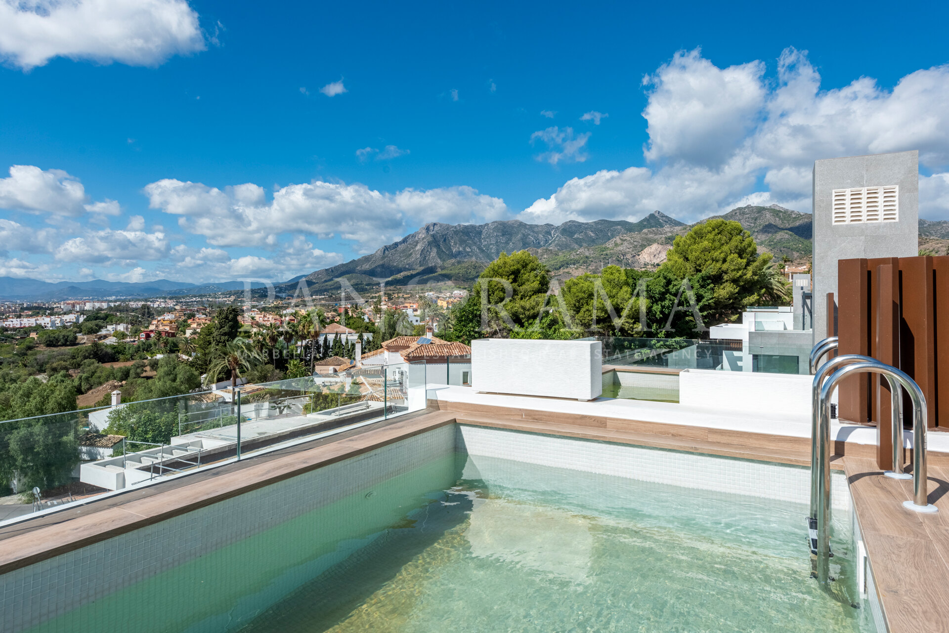 La propriété est distribuée sur trois étages plus une terrasse sur le toit, offrant un total de six chambres à coucher, chacune avec sa propre salle de bains en suite, et un WC d’invité supplémentaire. Il y a également deux salons spacieux, l’un au rez-de-chaussée et l’autre au sous-sol, ainsi qu’une cuisine indépendante entièrement équipée. La terrasse sur le toit est un espace spectaculaire avec une piscine privée, un espace de détente, une salle à manger et une pré-installation pour une cuisine extérieure.