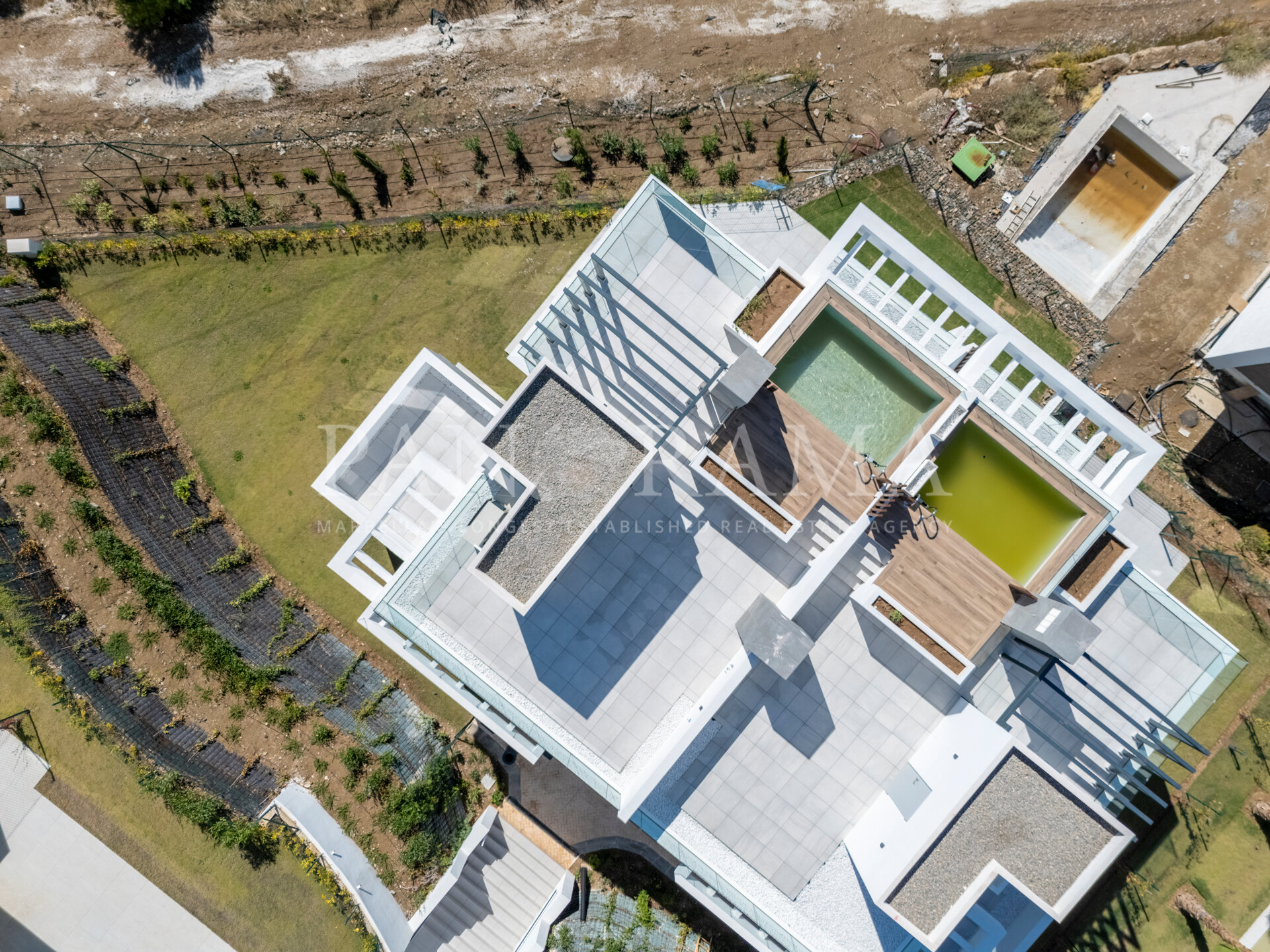 La villa a une surface construite totale de 575 m², dont 349 m² sont utilisables. Elle dispose de 163 m² répartis entre porches et terrasses, ainsi que d’un jardin privé de 234 m². En outre, la propriété comprend deux places de parking, chacune d’environ 24 m², situées à seulement 10 mètres de l’entrée principale.