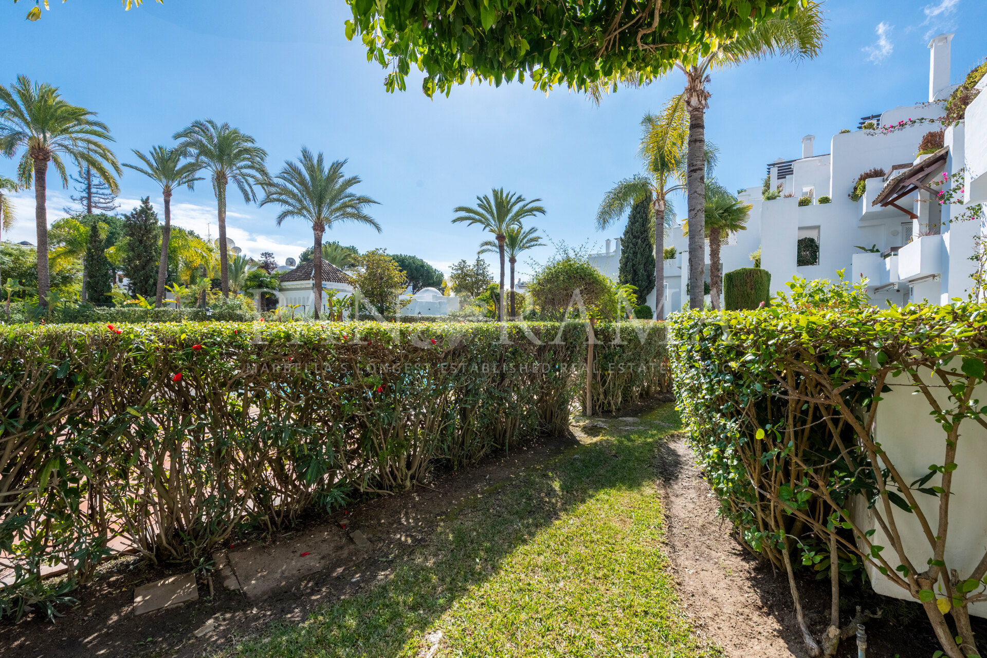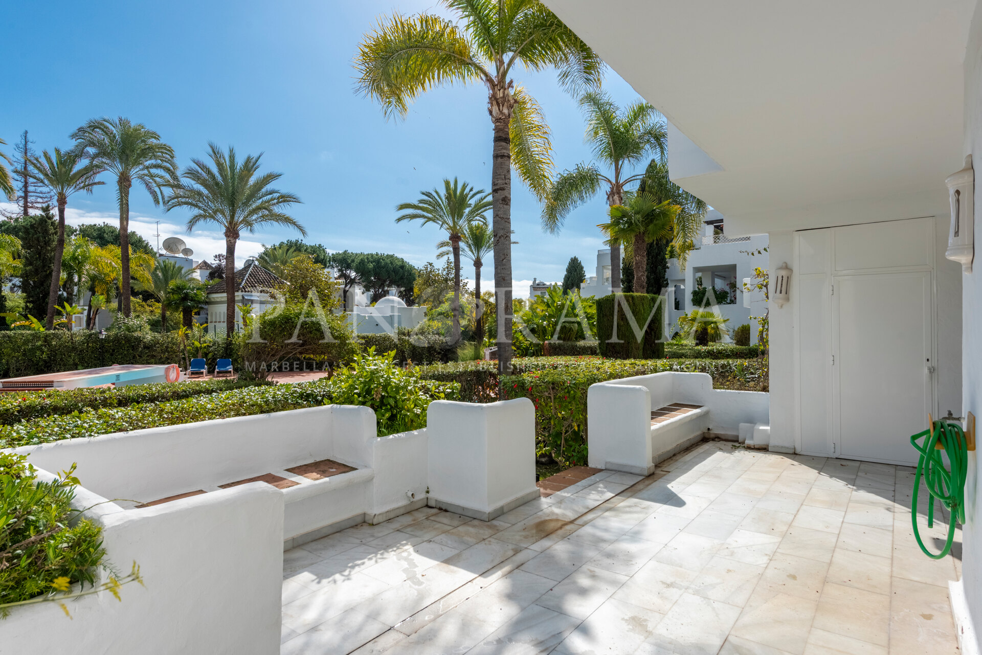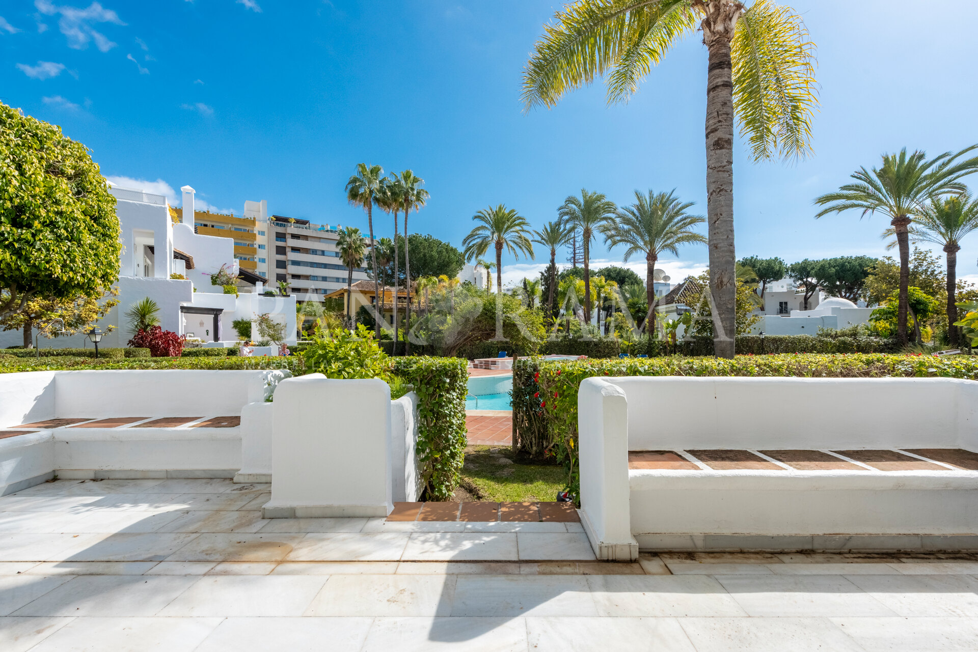 La propriété est maintenue dans son état d’origine mais offre un énorme potentiel de rénovation. Située au rez-de-chaussée surélevé, elle dispose d’une terrasse spacieuse donnant sur les jardins et les piscines, offrant un espace parfait pour la détente et les loisirs en plein air.