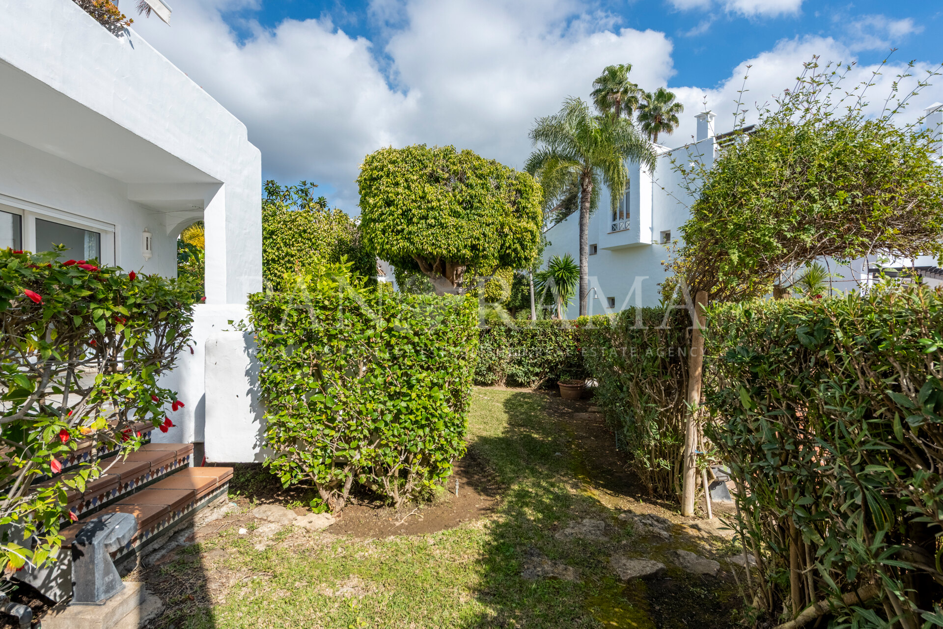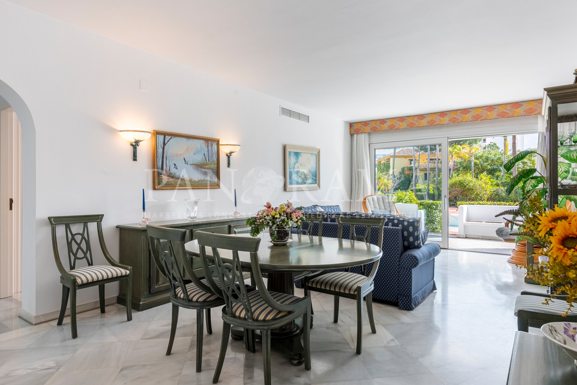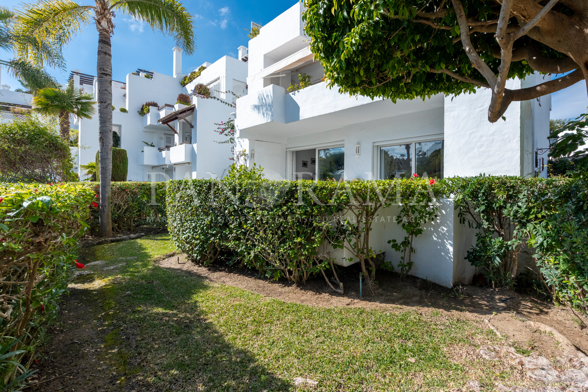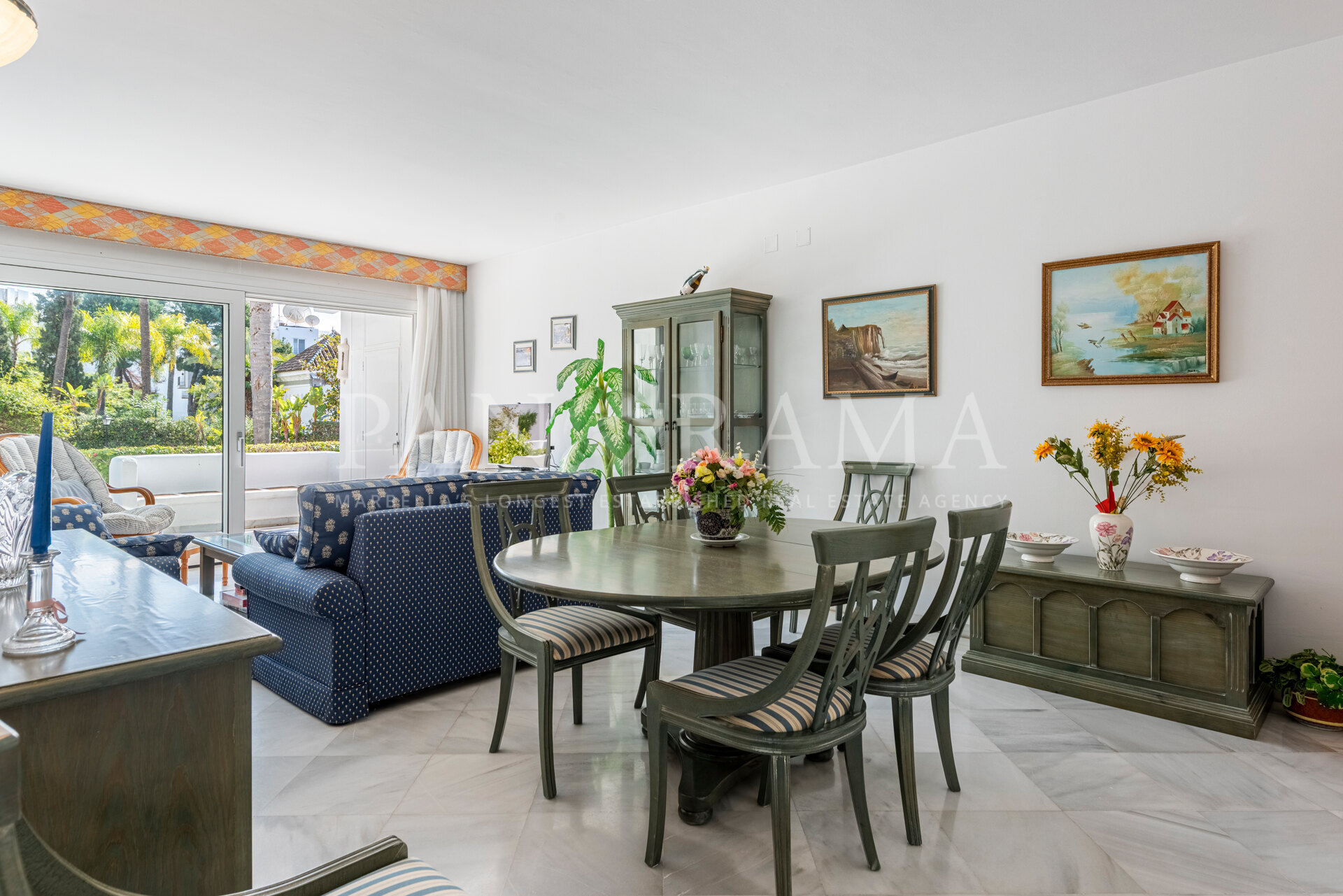 La propriété est maintenue dans son état d’origine mais offre un énorme potentiel de rénovation. Située au rez-de-chaussée surélevé, elle dispose d’une terrasse spacieuse donnant sur les jardins et les piscines, offrant un espace parfait pour la détente et les loisirs en plein air.